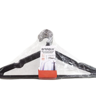 Набор из 20 прочных черных металлических вешалок BRABIX для одежды со специальным резиновым покрытием. Такое покрытие плечиков для одежды не дает одежде скользить по вешалке.
