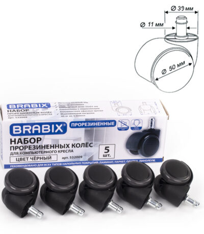 Колеса (ролики) BRABIX для кресла, прорезиненные, КОМПЛЕКТ 5 шт., шток d 11 мм, черные, в коробе, 532009