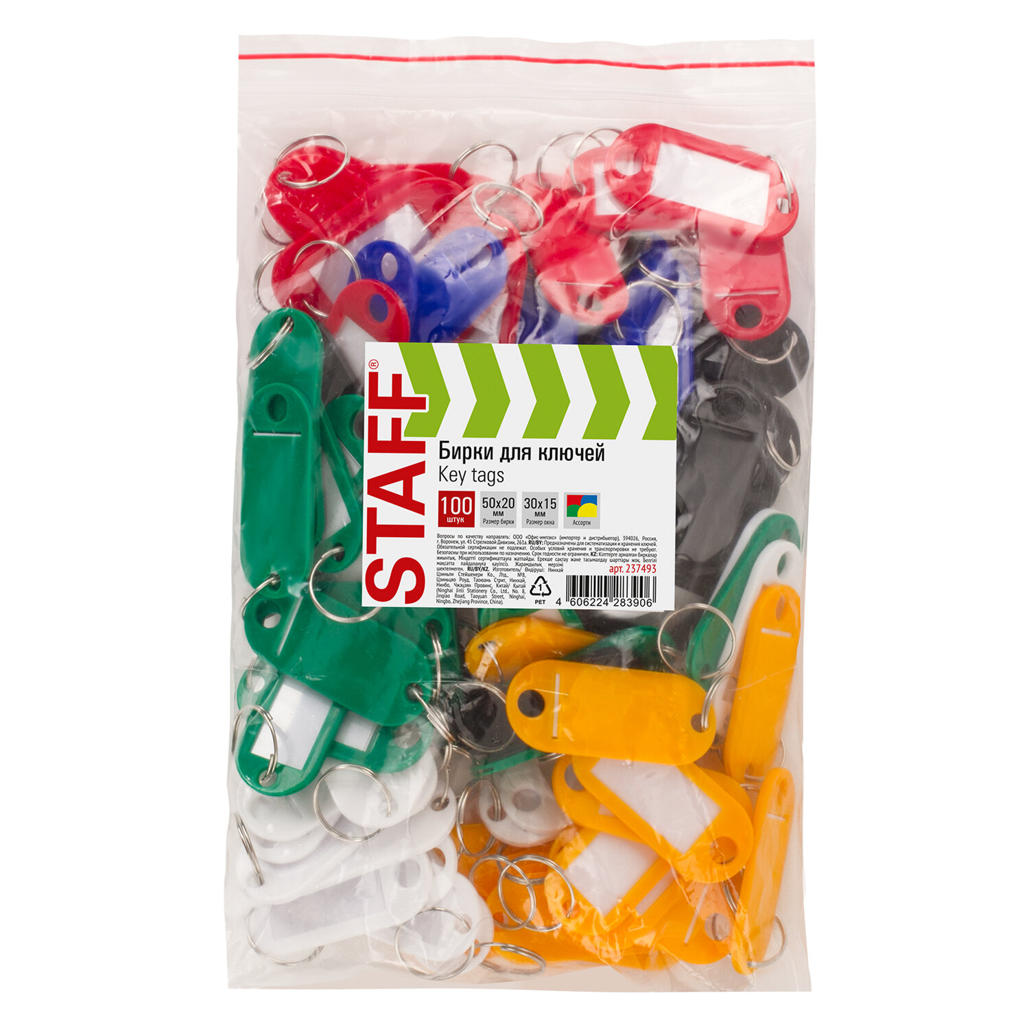 Бирки для ключей КОМПЛЕКТ 100 шт., длина 50 мм, инфо-окно 30х15 мм, АССОРТИ, STAFF, 237493