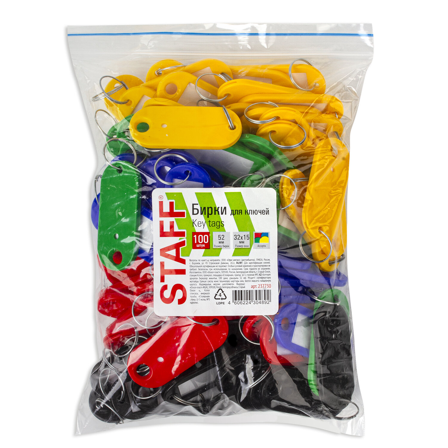 Бирки для ключей КОМПЛЕКТ 100 шт., длина 52 мм, инфо-окно 32х15 мм, цвет ассорти, STAFF, 237730