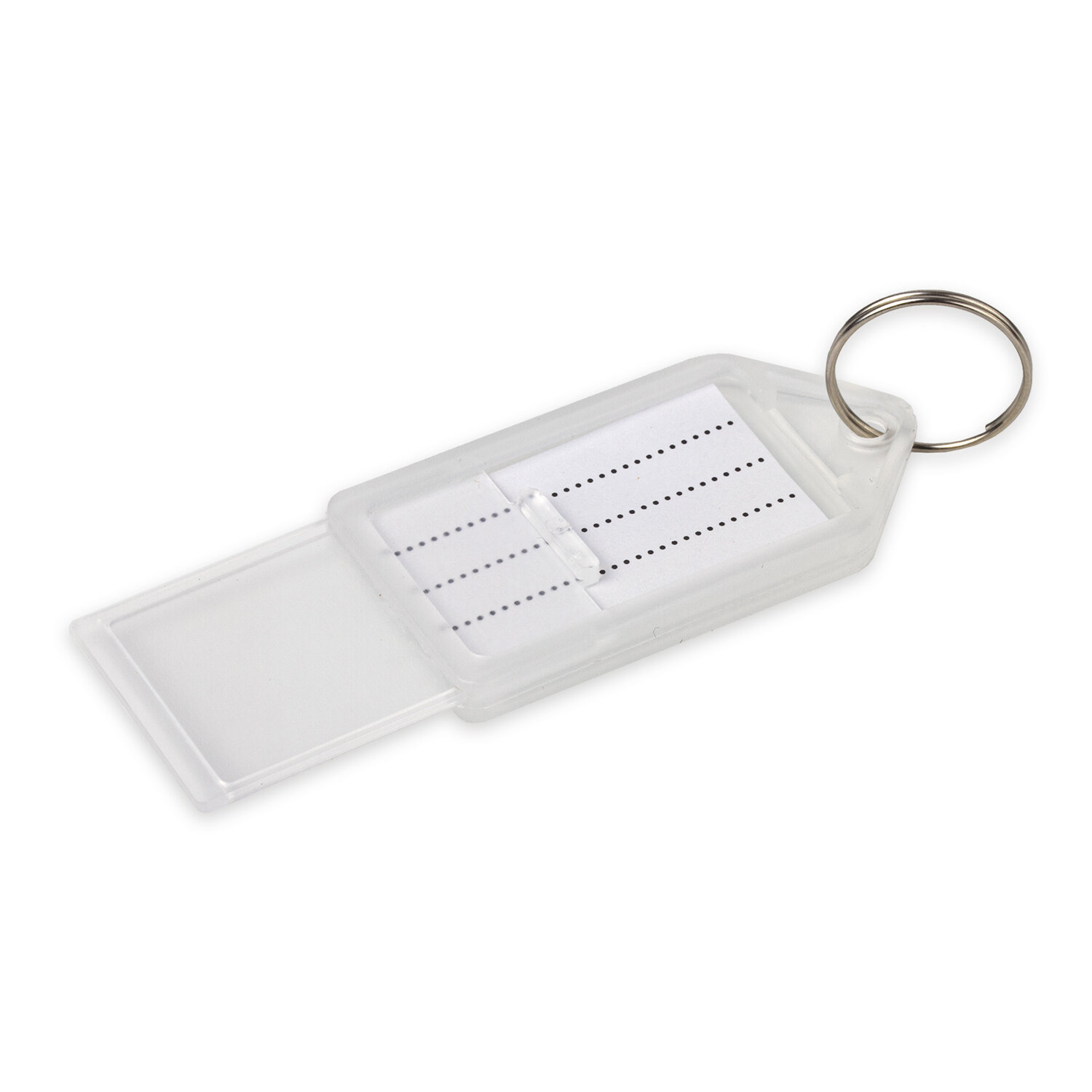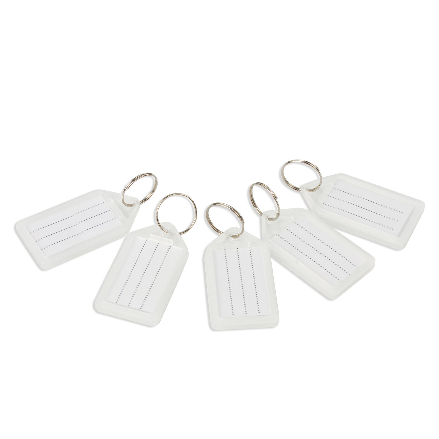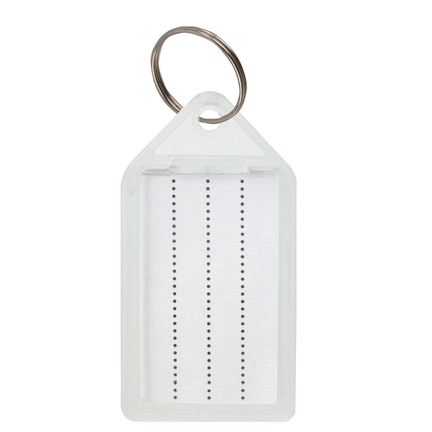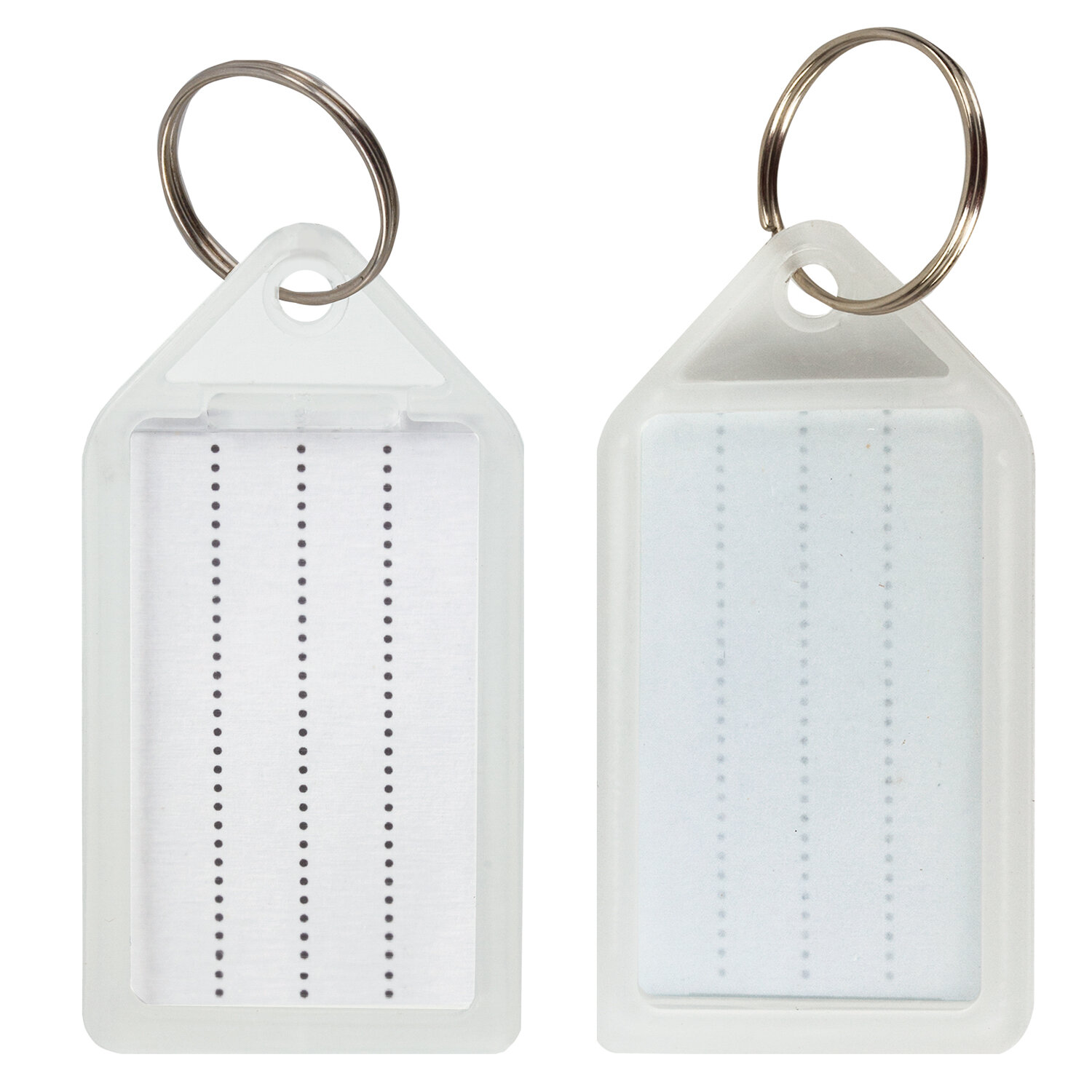 Изготовлены из пластика. Каждая бирка снабжена металлическим кольцом, белым бумажным вкладышем для маркировки, защищённым пластиковой вставкой от повреждений. Размер бирки — 55х29 мм, информационного окна — 39х22 мм. Цвет — прозрачный. 20 штук в упаковке.