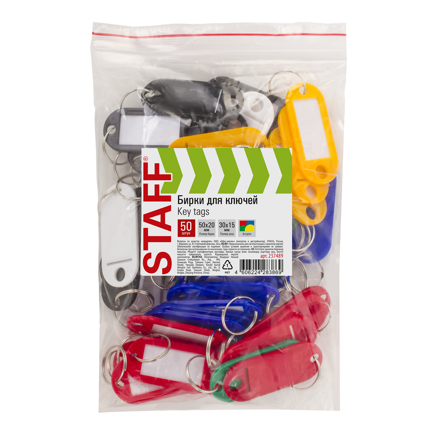 Бирки для ключей КОМПЛЕКТ 50 ШТ., длина 50 мм, инфо-окно 30х15 мм, АССОРТИ, STAFF, 237489