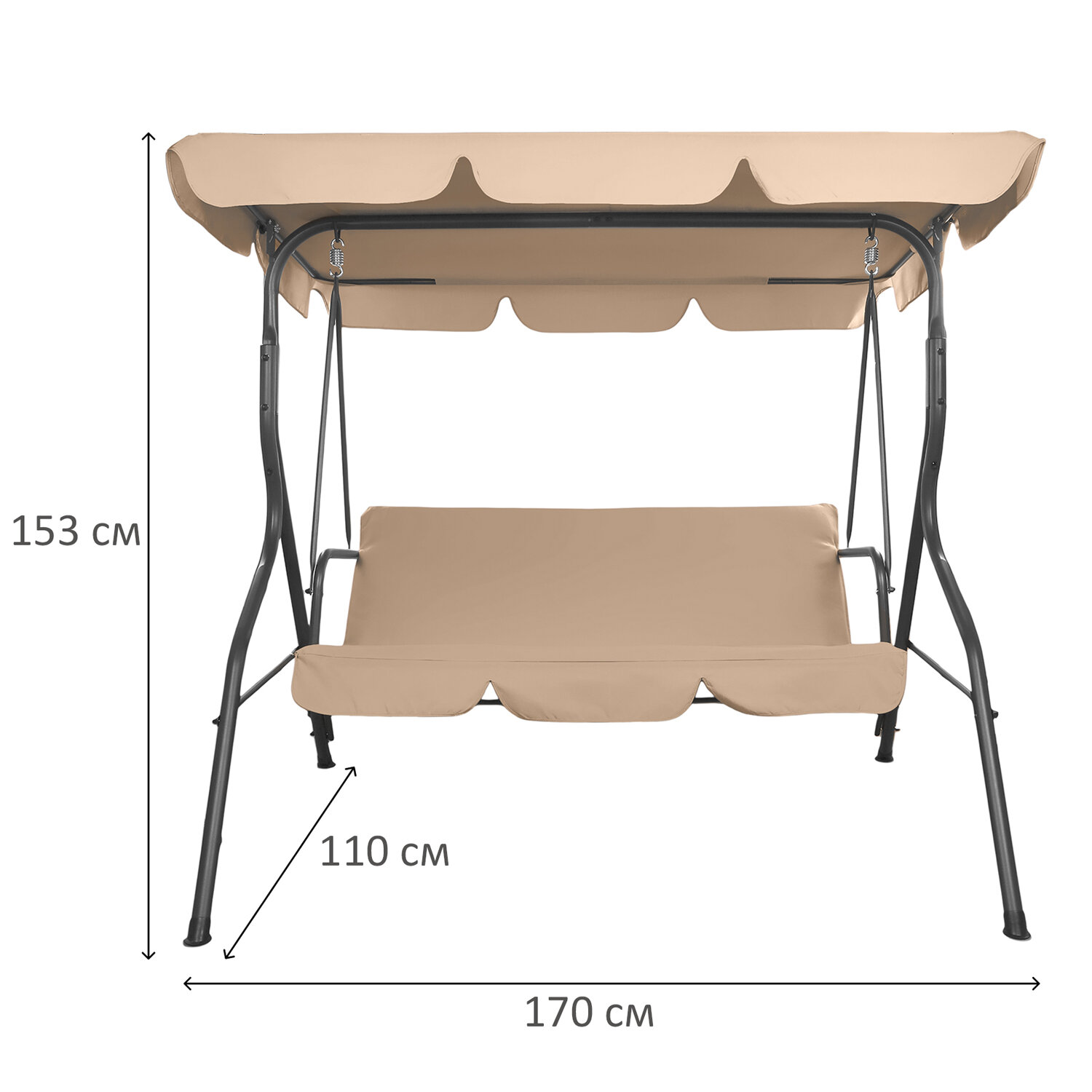 Качели 3-х местные выполнены в размере 170х110х153 см. Отличаются прочным металлическим каркасом и оригинальной конструкцией. Удобное сиденье рассчитано на 3-х человек и выдерживают нагрузку до 250 кг.Навес из полиэстера защитит от палящего солнца и небольшого дождя, а износостойкая водоотталкивающая ткань с пропиткой прослужит очень долго.