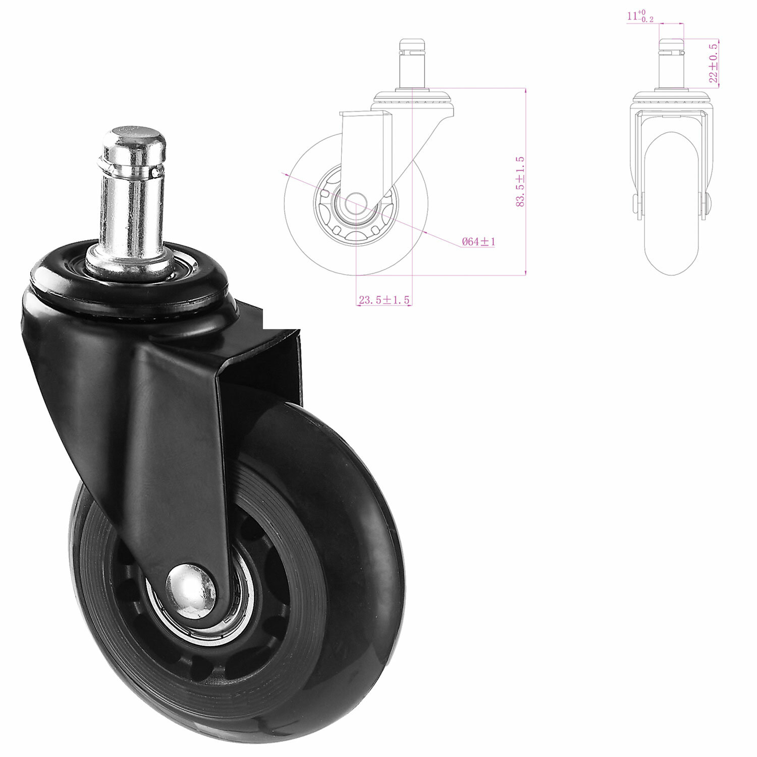 Стандартный размер штока – 11х22 мм. Максимальная нагрузка – 50 кг на 1 колесо. Мягкое полиуретановое покрытие обеспечивает совершенно бесшумный ход и надёжно защитит пол от повреждений. Рекомендованы для ламината, паркета, плитки, линолеума.