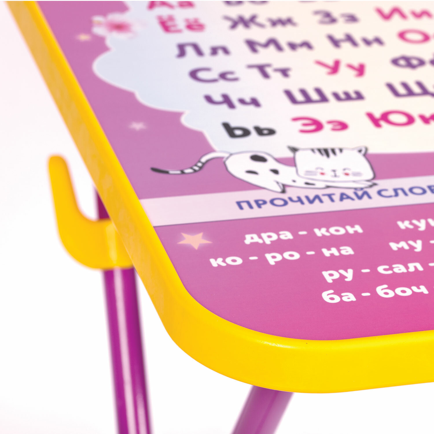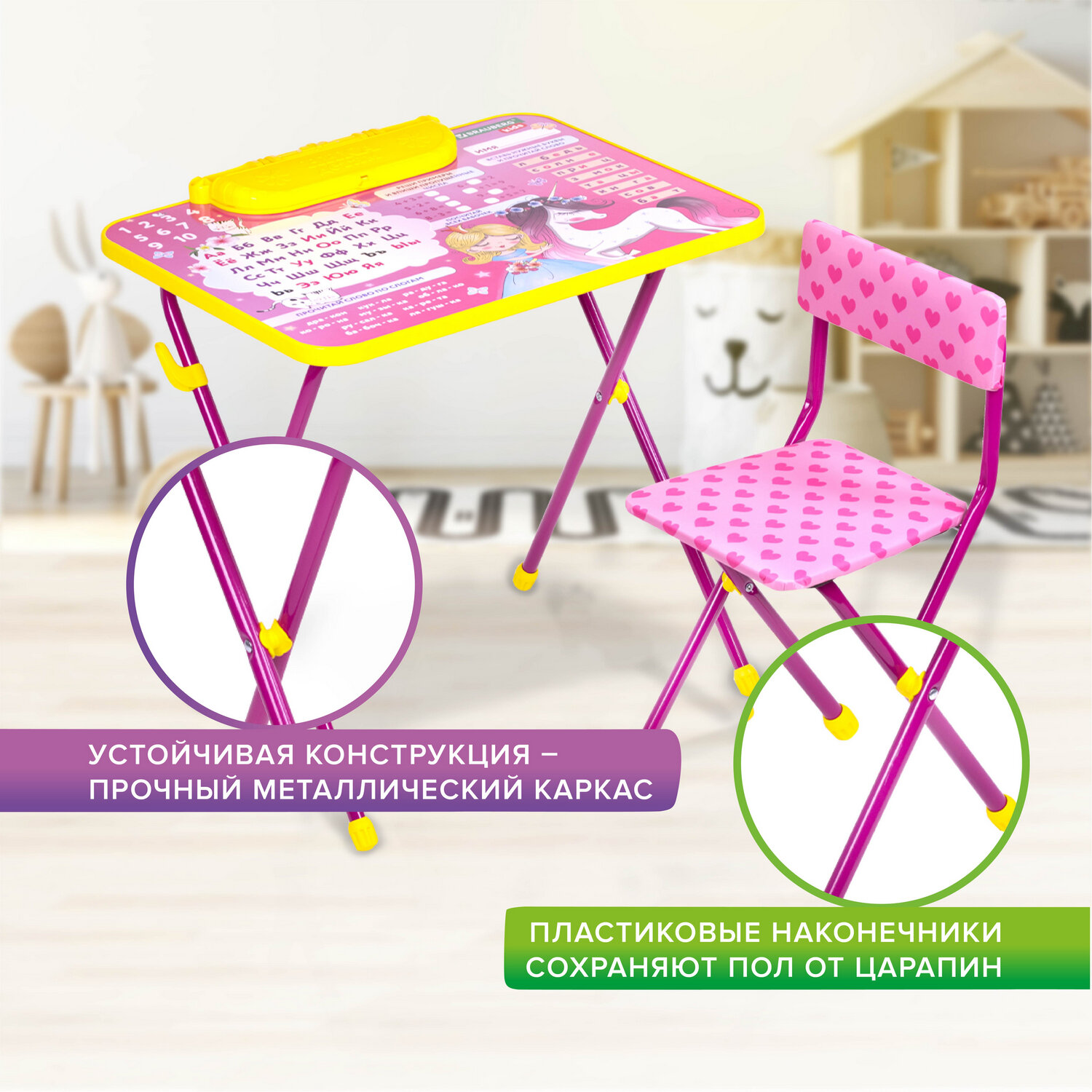 Комплект мебели (стол + стул) BRAUBERG NIKA KIDS предназначен для детей в возрасте от 3 до 7 лет. Изделие в сложенном виде упаковано в одну компактную картонную коробку. Столешница содержит русский алфавит и обучающие упражнения по арифметике и чтению. На столе можно рисовать маркером на водной основе. Размер стола — 60х45 см, высота до поверхности столешницы — 58 см. Стул имеет мягкое сиденье и спинку из ткани с водоотталкивающей пропиткой. Размер сиденья — 28,5х27 см. Стул выдерживает вес ребенка до 50 кг. Вместительный пенал для письменных принадлежностей. Удобный механизм складывания и компактное хранение. Есть крючок для рюкзака или ранца.