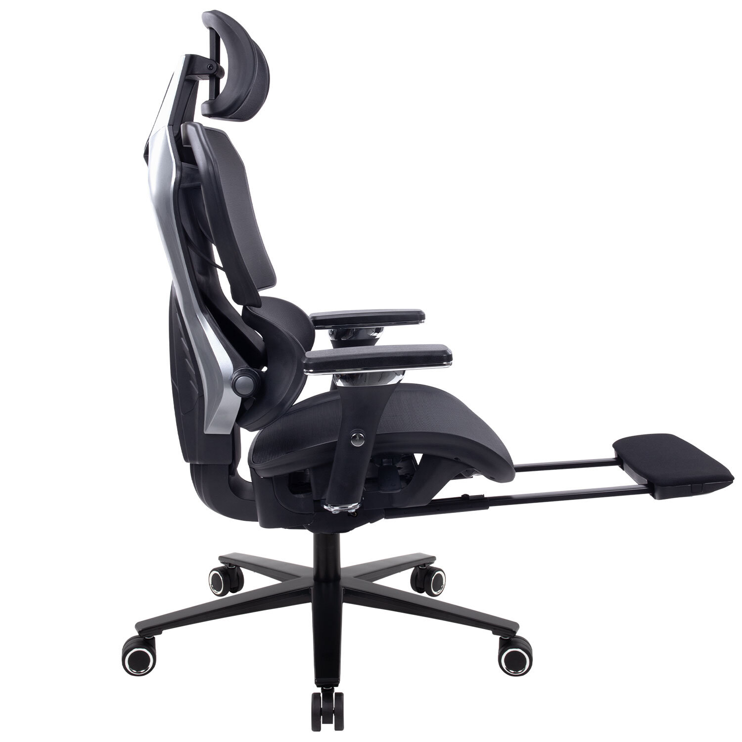 Кресло выполнено из материалов высокого качества. Обивка кресла из сверхпрочной сетки легко чистится и долго сохраняет привлекательный внешний вид. Эргономичный дизайн разработан с заботой о вашем здоровье. Регулируемые подголовник и поясничная поддержка обеспечат оптимальное положение корпуса, способствуя снижению напряжения в области шеи и спины. Регулируемые 4D пластиковые подлокотники позволят с удобством разместиться в кресле.Наличие телескопической подставки для ног не только помогает создать удобное положение для ног, но и способствует улучшению кровообращения, снимая напряжение с мышц и суставов. В основании – надежное металлическое пятилучие и газлифт 4 класса.Максимальная нагрузка – 125 кг.