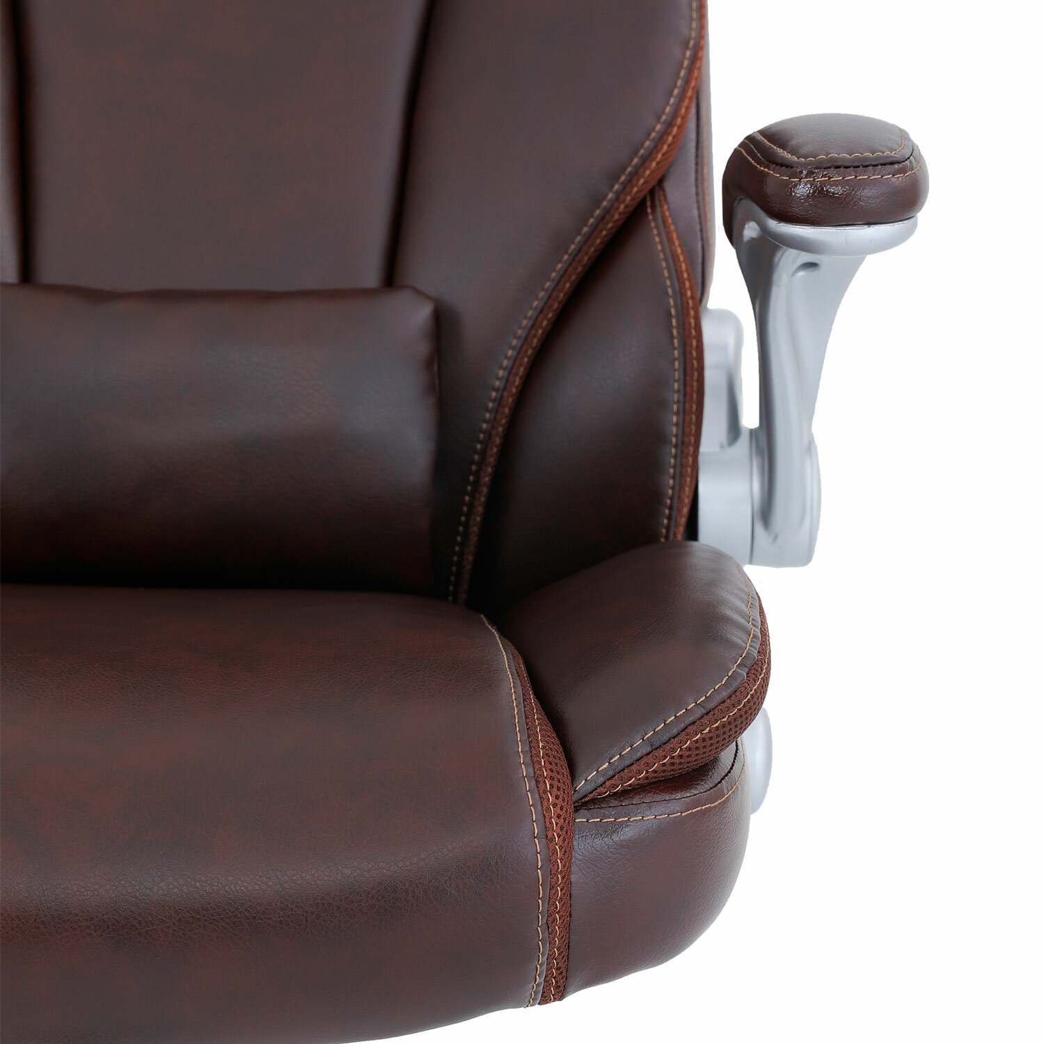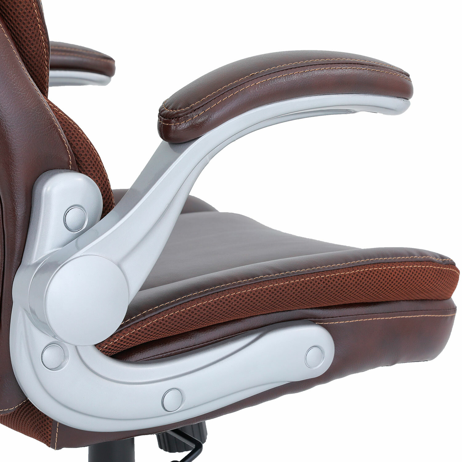 Обивка выполнена из рециклированной кожи. Этот материал визуально и тактильно практически не отличим от натуральной кожи, отличается прочностью, износостойкостью и эластичностью.Плотная и при этом мягкая набивка кресла обеспечит вам необходимый комфорт.Надежный механизм качания «Top Gun» обеспечивает хорошую поддержку спины и поясницы за счет возможности свободного качания с фиксацией в одном рабочем положении. Также возможна регулировка жесткости качания под вес сидящего.Мягкие накладки на подлокотниках снимают нагрузку с рук, уменьшают напряжение в локтях и предплечьях.Кресла марки BRABIX отличаются современным дизайном, эргономикой, аккуратным исполнением и отличным соотношением цены и качества.