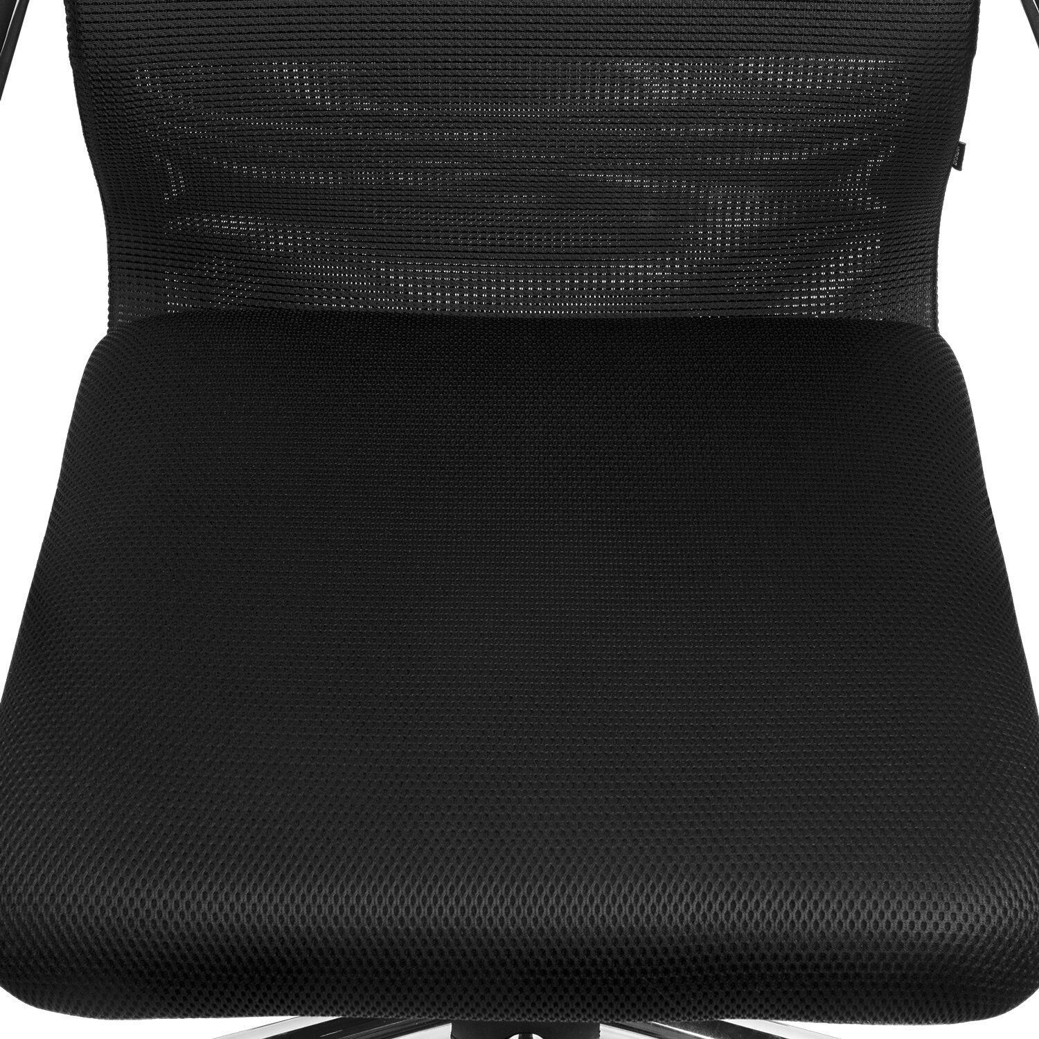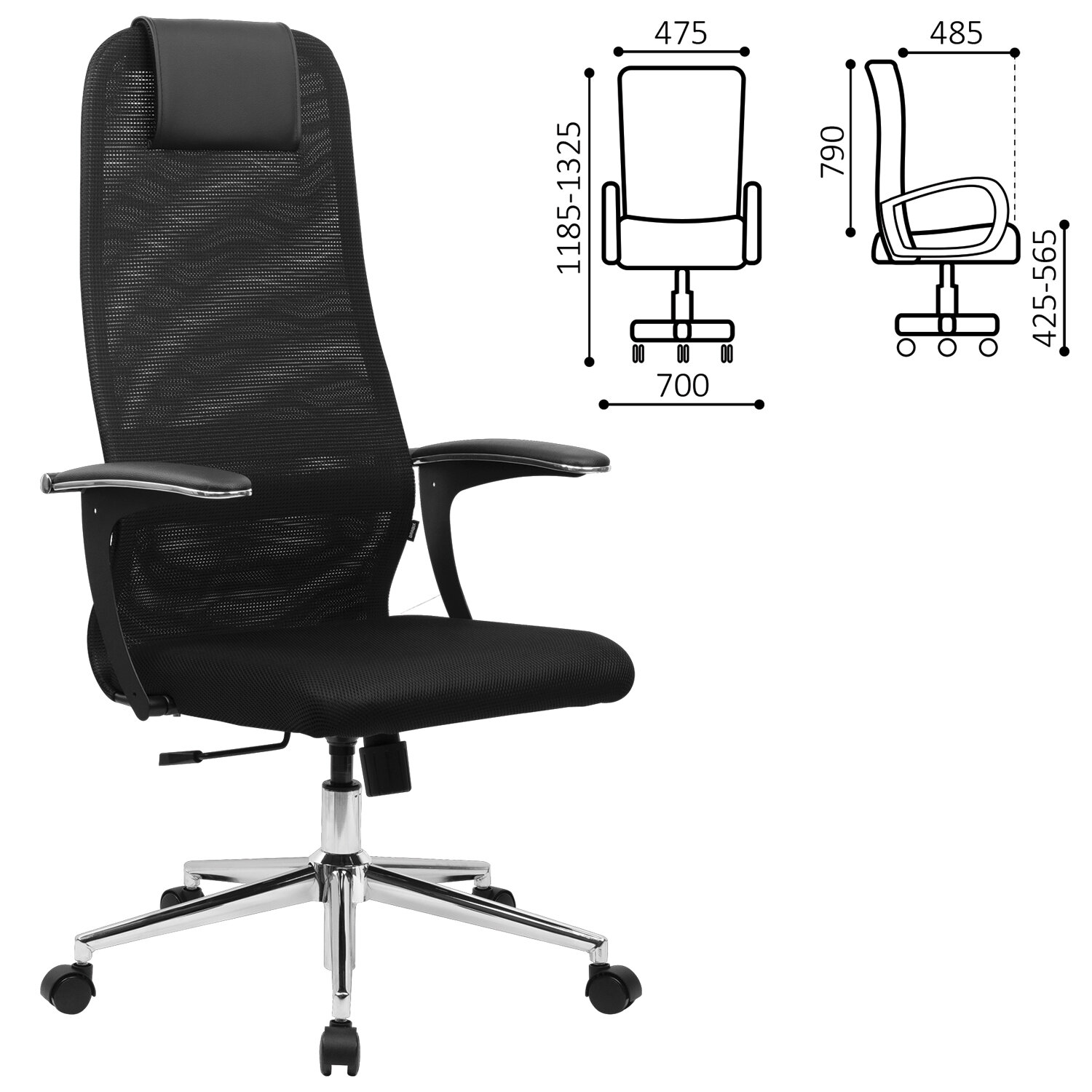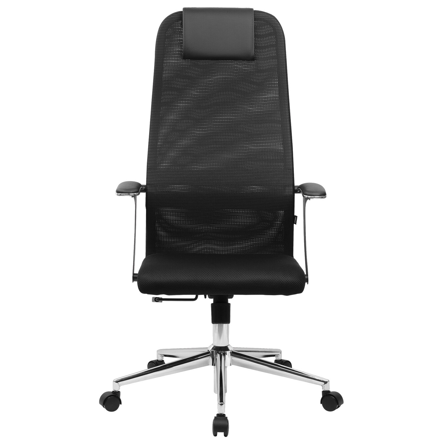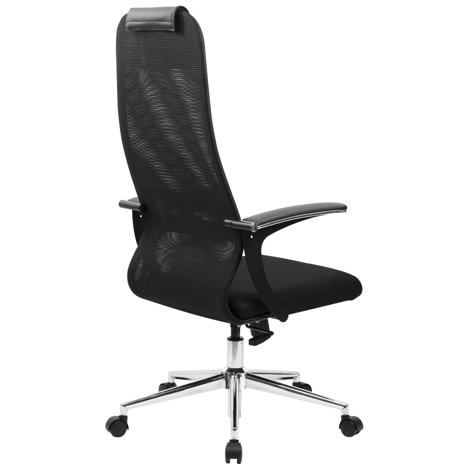 Спинка высокая, эргономичной формы, с ярко выраженной поясничной поддержкой.Спинка имеет сверхпрочный стальной каркас с износостойким полимерным покрытием черного цвета.Спинка снабжена мягким, комфортным подголовником.Сиденье средней жесткости, объемное, на столярном каркасе.Обивка спинки из износоустойчивой «дышащей» сетчатой ткани двойного плетения.Подлокотники стальные нового поколения, с хромированными молдингами и мягкими накладками.Пятилучие металлическое хромированное, стильное и прочное.Модель оснащена механизмом качания «Top-Gun» с регулировкой под вес и возможностью фиксации в рабочем положении.