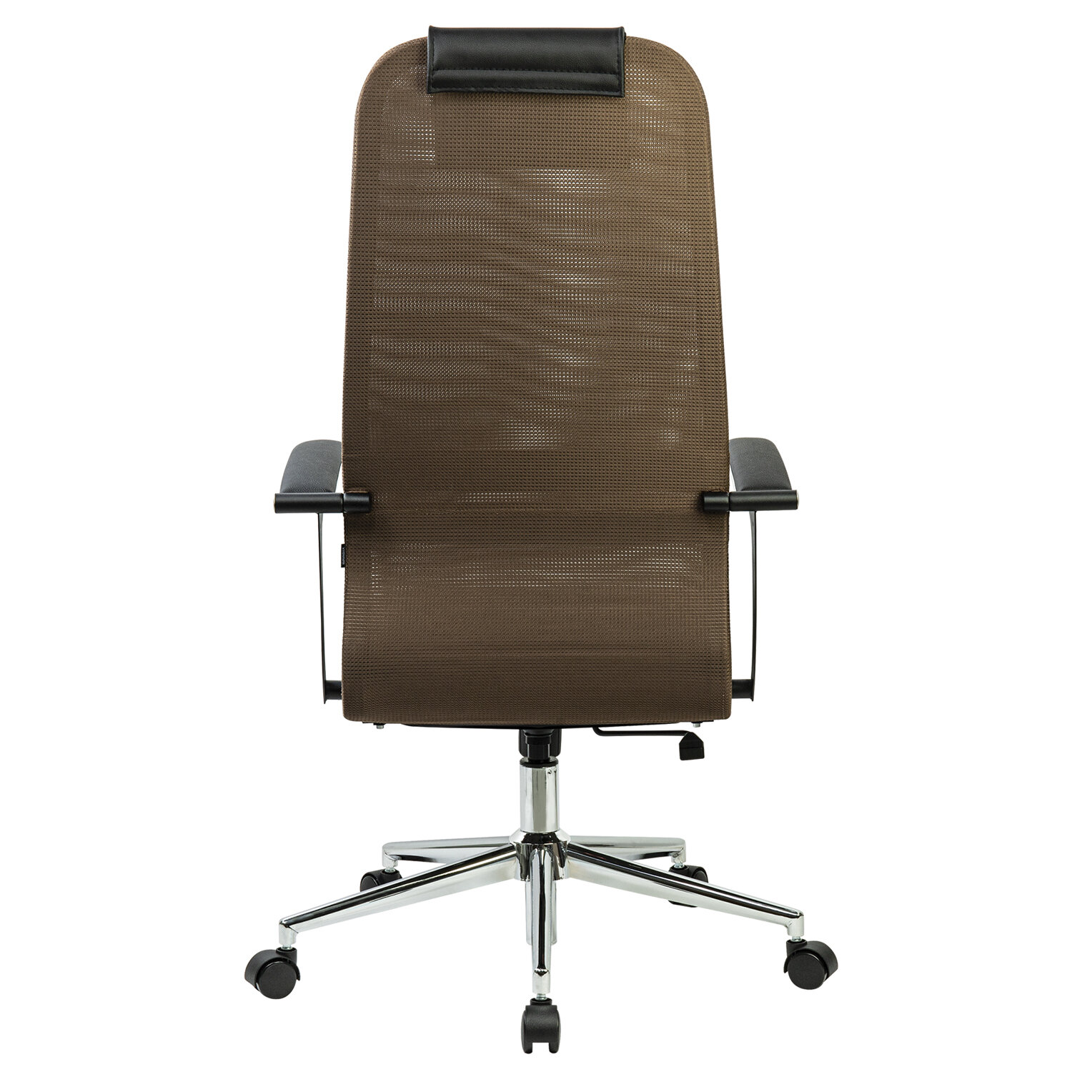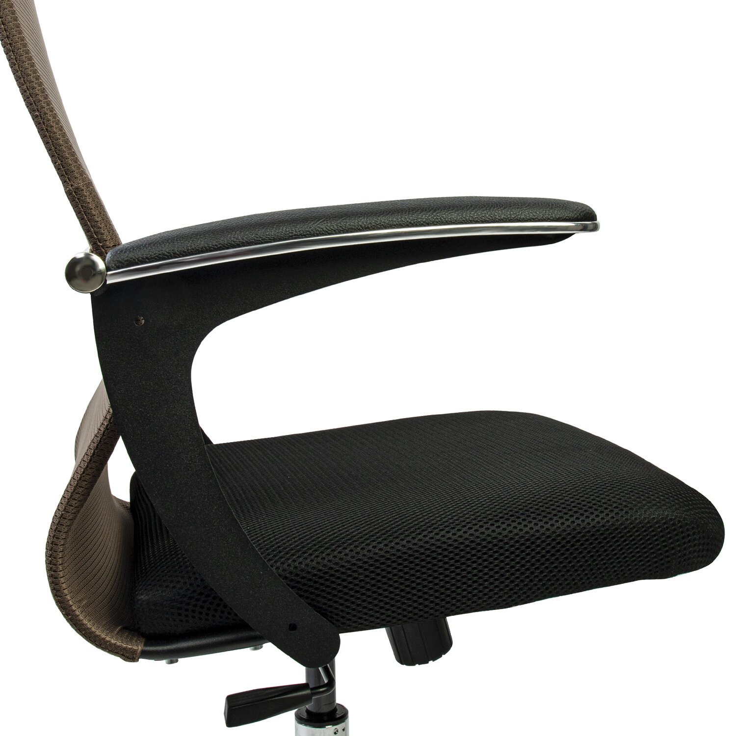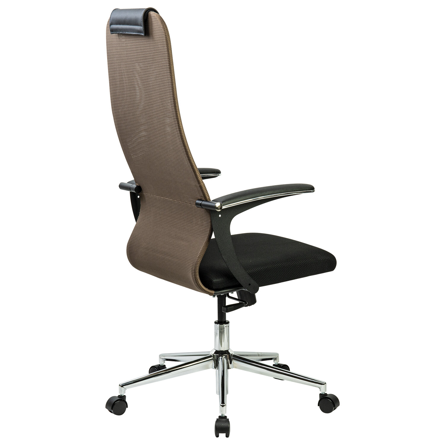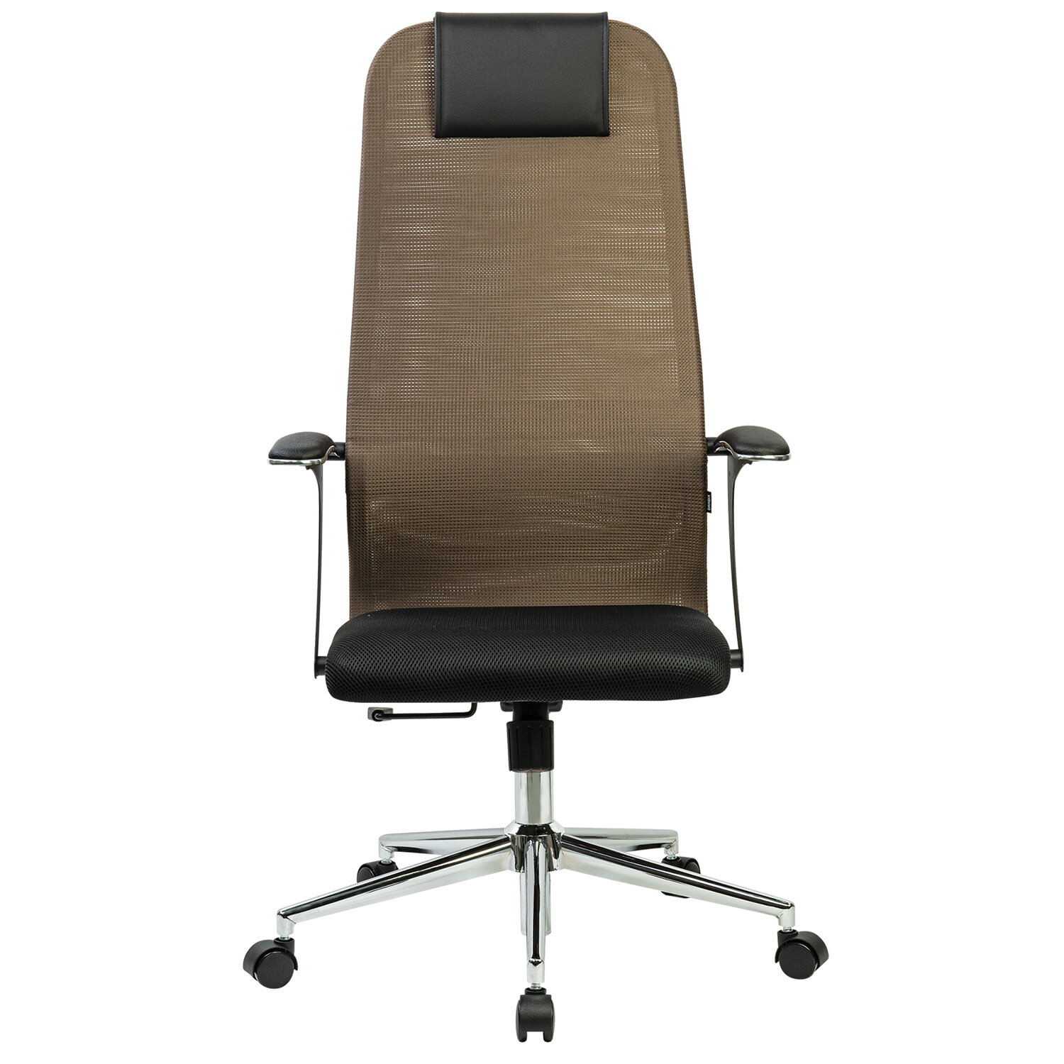 Спинка высокая, эргономичной формы, с ярко выраженной поясничной поддержкой.Спинка имеет сверхпрочный стальной каркас с износостойким полимерным покрытием черного цвета.Спинка снабжена мягким комфортным подголовником.Сиденье средней жесткости, объемное, на столярном каркасе.Обивка спинки из износоустойчивой «дышащей» сетчатой ткани двойного плетения.Подлокотники стальные нового поколения, с хромированными молдингами и мягкими накладками.Пятилучие металлическое хромированное, стильное и прочное.Модель оснащена механизмом качания «Top-Gun» с регулировкой под вес и возможностью фиксации в рабочем положении.