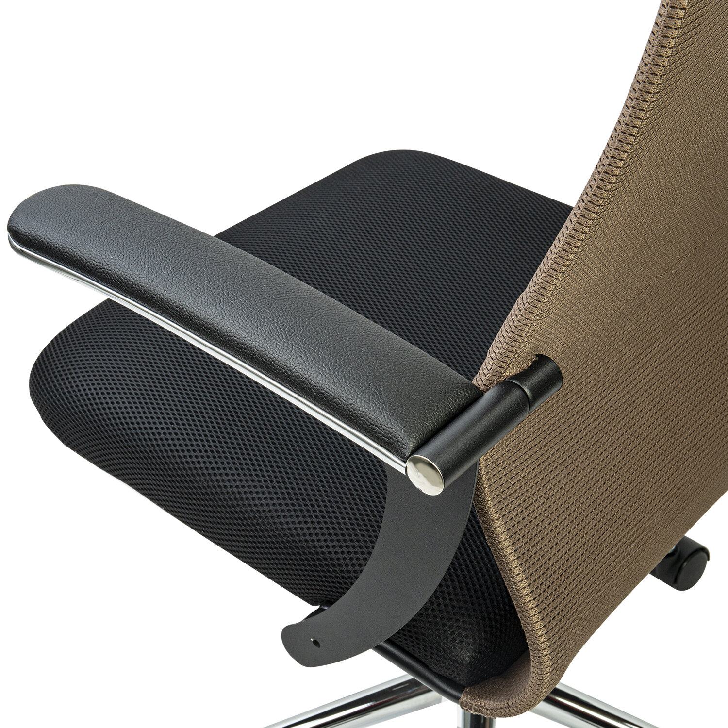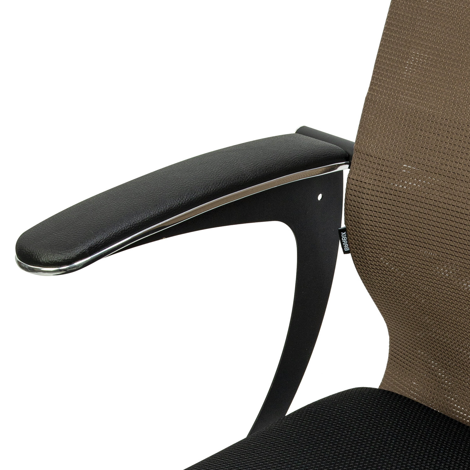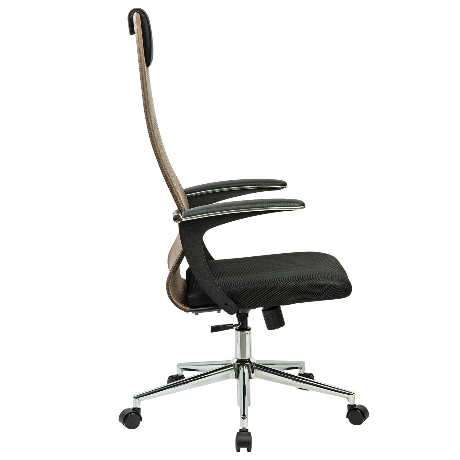 Спинка высокая, эргономичной формы, с ярко выраженной поясничной поддержкой.Спинка имеет сверхпрочный стальной каркас с износостойким полимерным покрытием черного цвета.Спинка снабжена мягким комфортным подголовником.Сиденье средней жесткости, объемное, на столярном каркасе.Обивка спинки из износоустойчивой «дышащей» сетчатой ткани двойного плетения.Подлокотники стальные нового поколения, с хромированными молдингами и мягкими накладками.Пятилучие металлическое хромированное, стильное и прочное.Модель оснащена механизмом качания «Top-Gun» с регулировкой под вес и возможностью фиксации в рабочем положении.