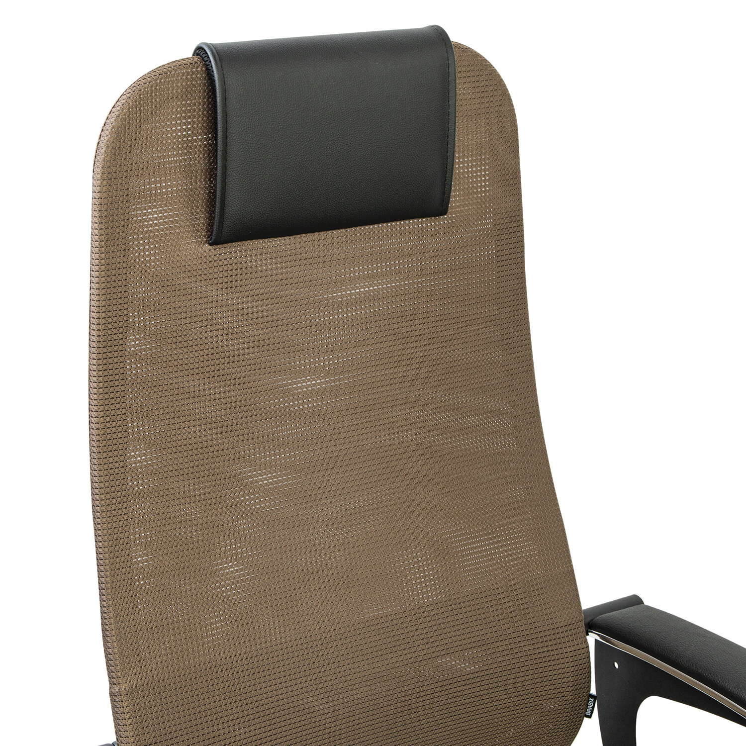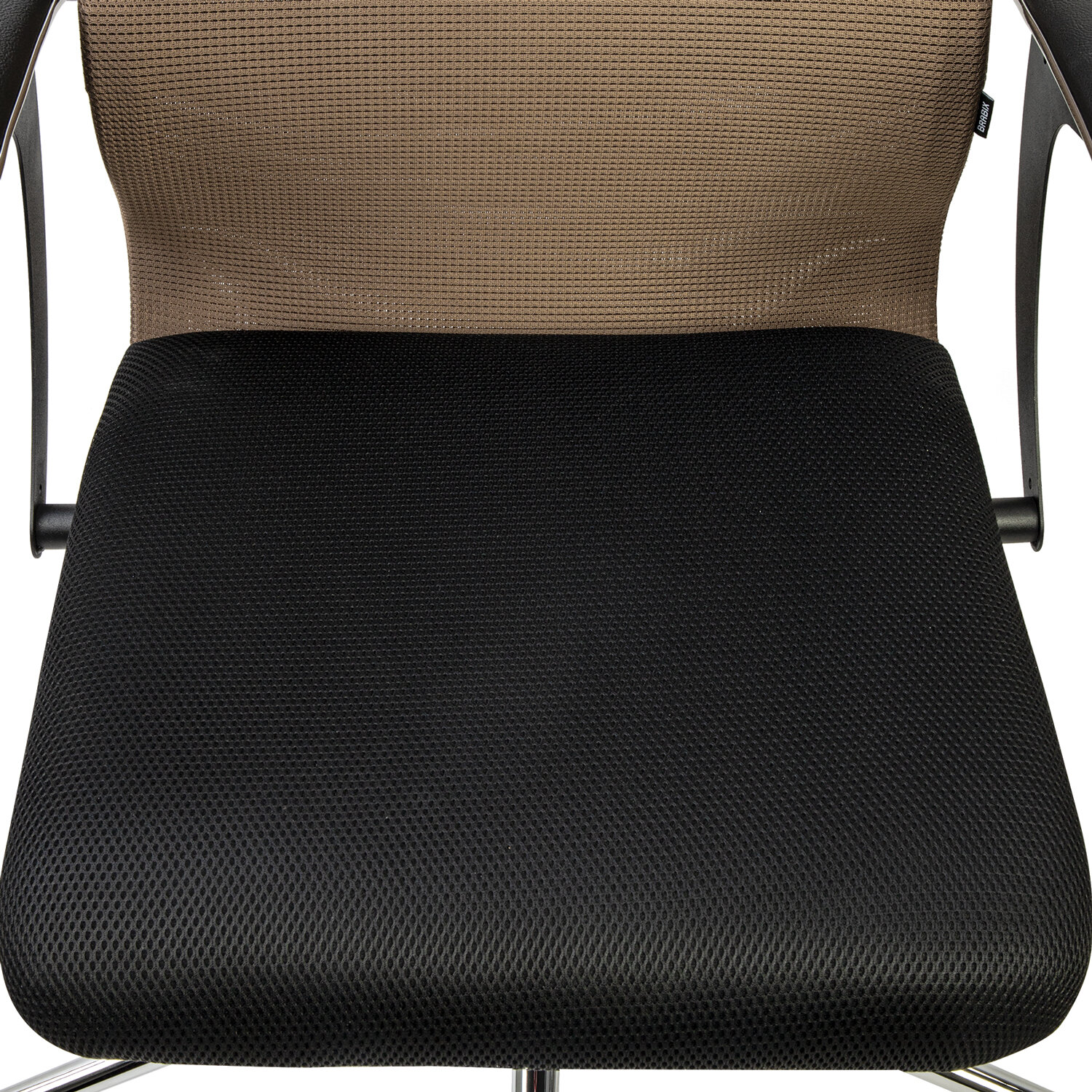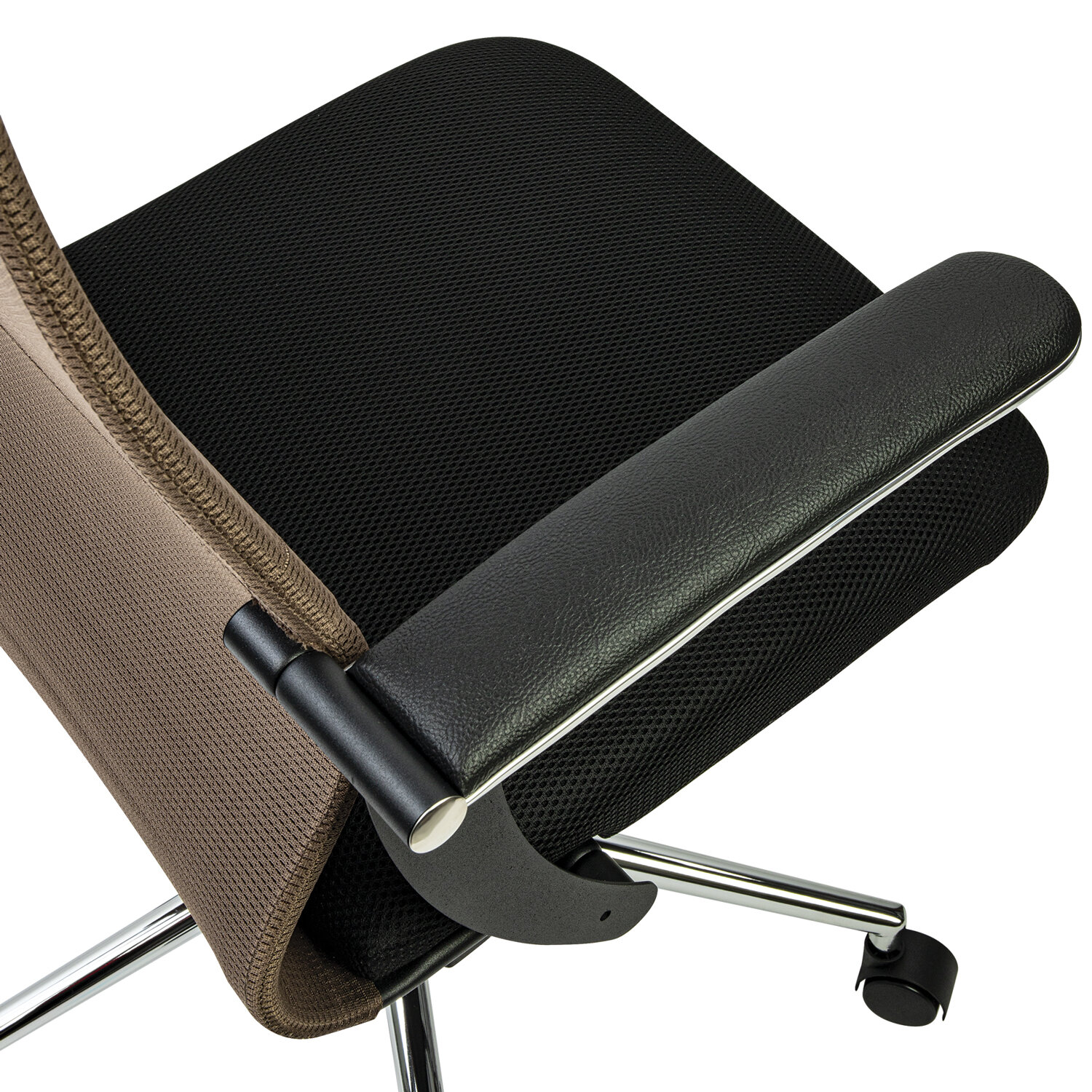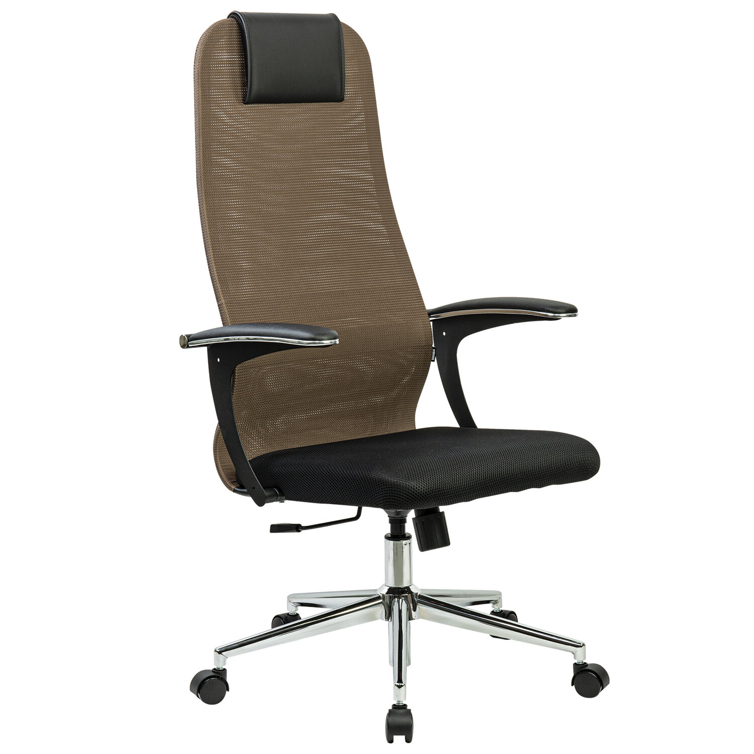 Спинка высокая, эргономичной формы, с ярко выраженной поясничной поддержкой.Спинка имеет сверхпрочный стальной каркас с износостойким полимерным покрытием черного цвета.Спинка снабжена мягким комфортным подголовником.Сиденье средней жесткости, объемное, на столярном каркасе.Обивка спинки из износоустойчивой «дышащей» сетчатой ткани двойного плетения.Подлокотники стальные нового поколения, с хромированными молдингами и мягкими накладками.Пятилучие металлическое хромированное, стильное и прочное.Модель оснащена механизмом качания «Top-Gun» с регулировкой под вес и возможностью фиксации в рабочем положении.