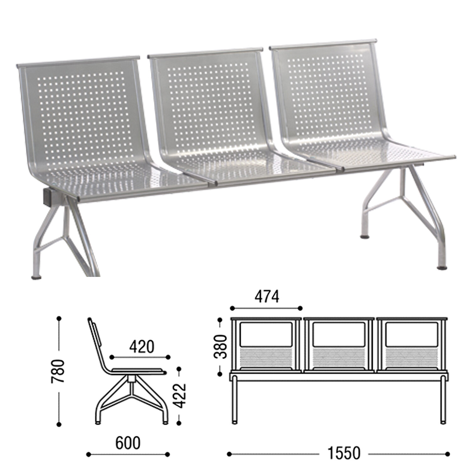 Кресло для посетителей трехсекционное «Стилл», 780х1550х600 мм, серебристое, СМ86/2-03