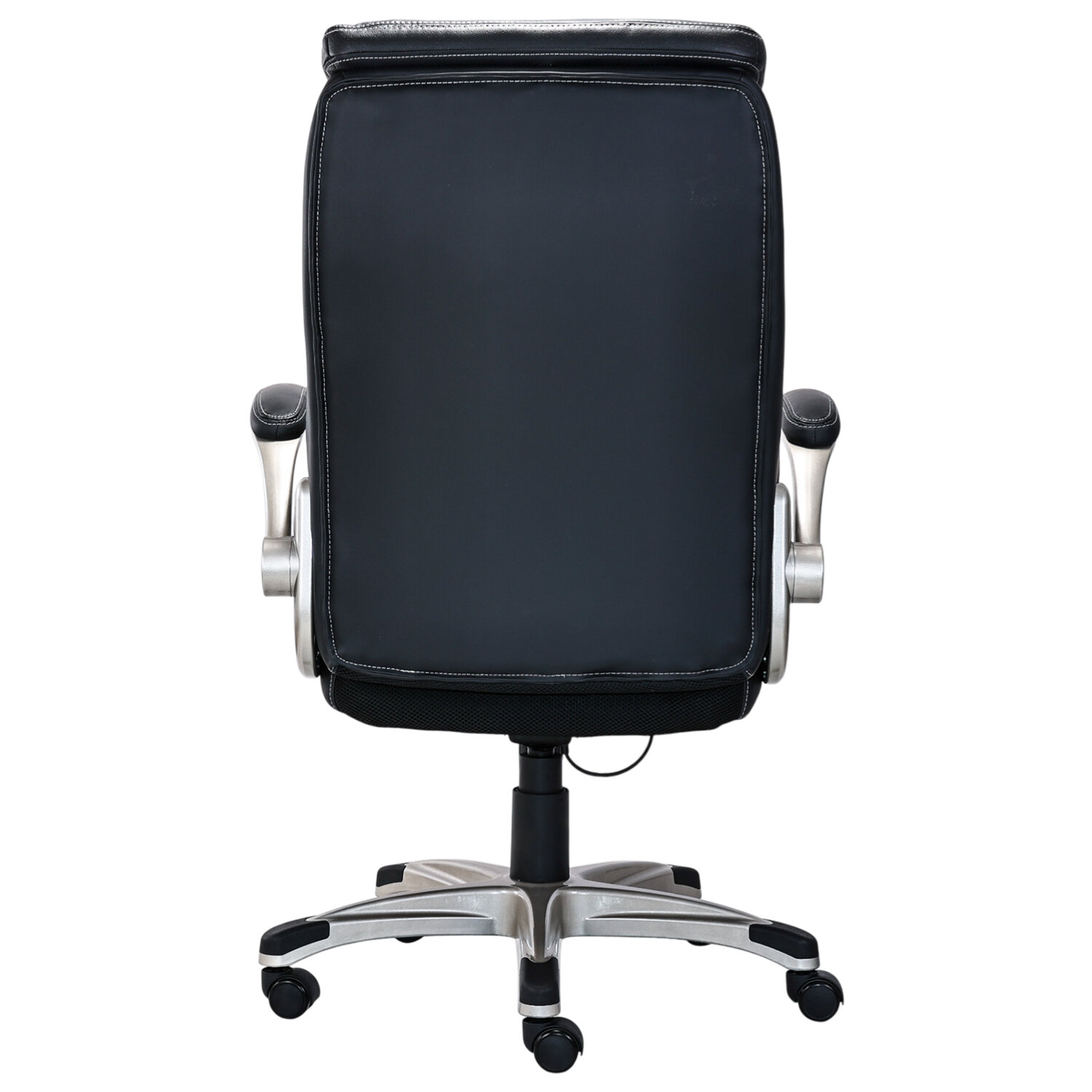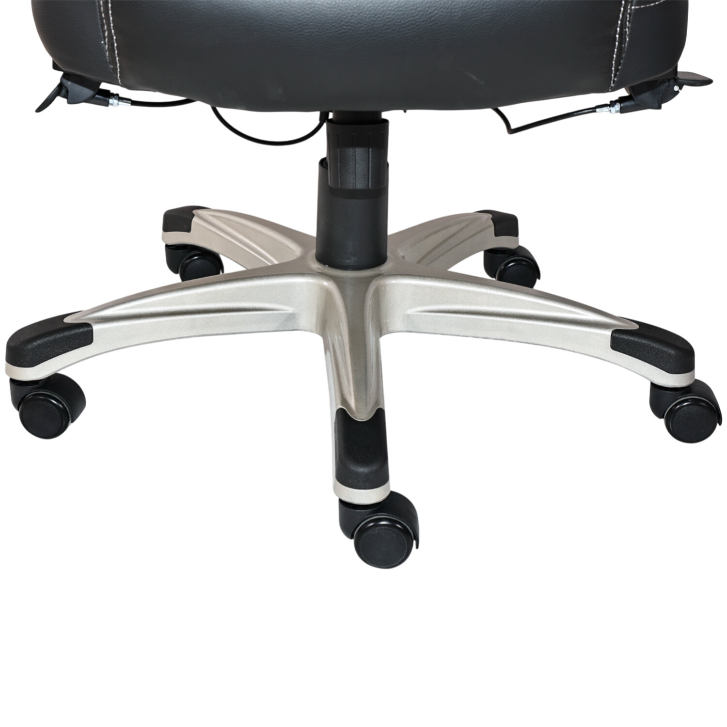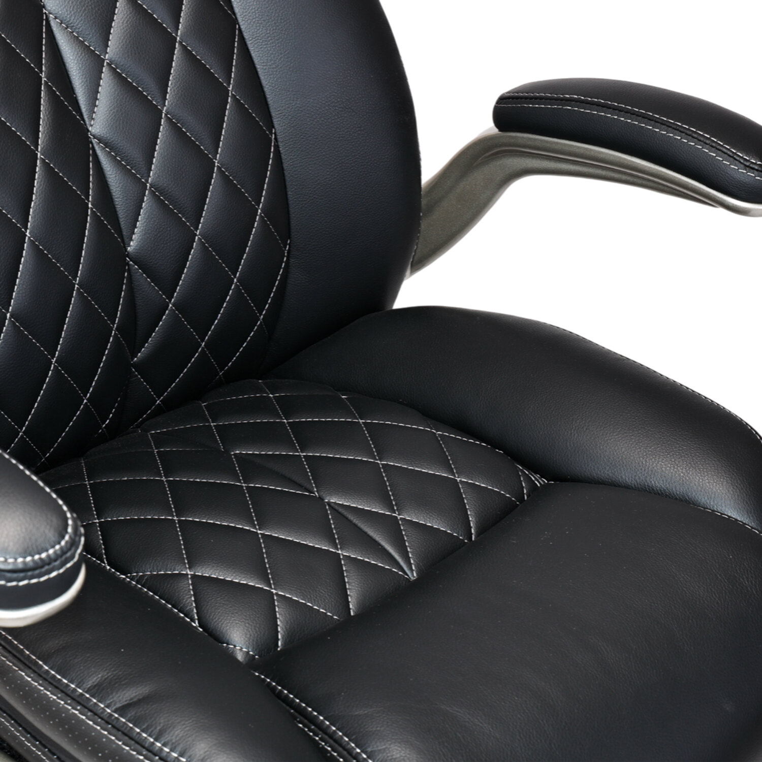 Обивка кресла выполнена из рециклированной кожи — современного материала, созданного из измельченных частиц натуральной кожи. По эластичности и прочности такая кожа максимально близка к натуральной, а также имеет запах выделанной кожи. Материал отлично пропускает воздух, что положительным образом сказывается на комфорте во время эксплуатации. Рециклированная кожа износоустойчива, кресло способно сохранять привлекательный внешний вид длительное время.Плотная набивка, откидные подлокотники и широкое сиденье обеспечивают великолепную эргономику данной модели.Многофункциональный механизм качания с проводным управлением обеспечивает хорошую поддержку спины и поясницы за счет возможности свободного качания с фиксацией в одном рабочем положении и регулировку угла наклона под вес сидящего.Кресло выдерживает нагрузку до 125 кг.