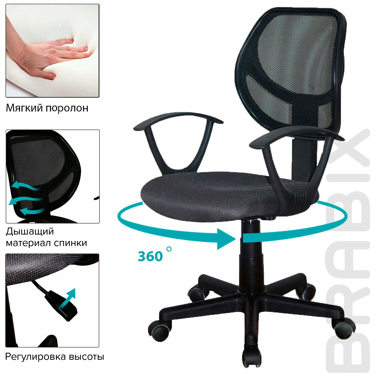 Современное и доступное операторское кресло. Легкая сетчатая спинка обеспечивает дополнительный комфорт.