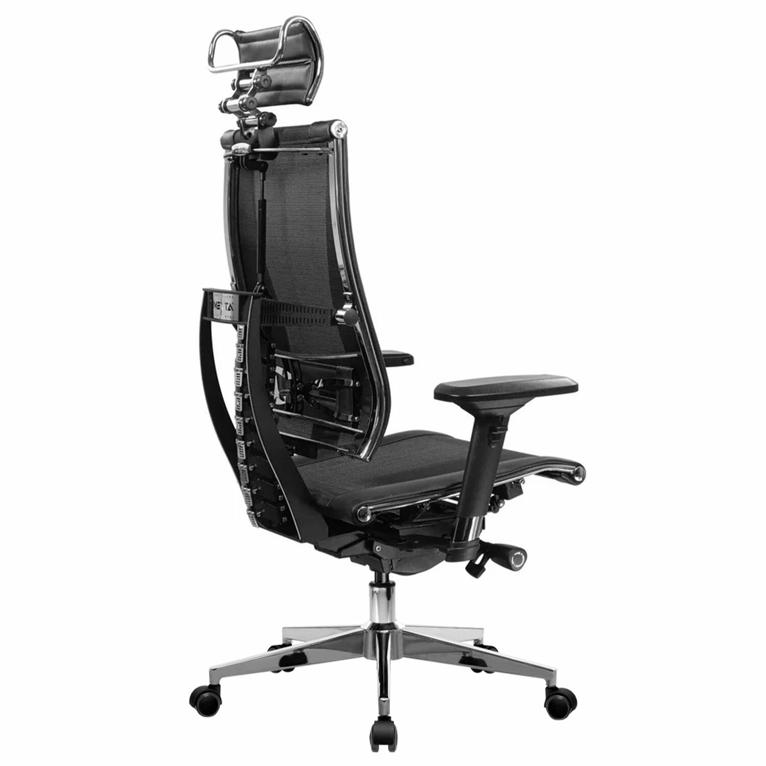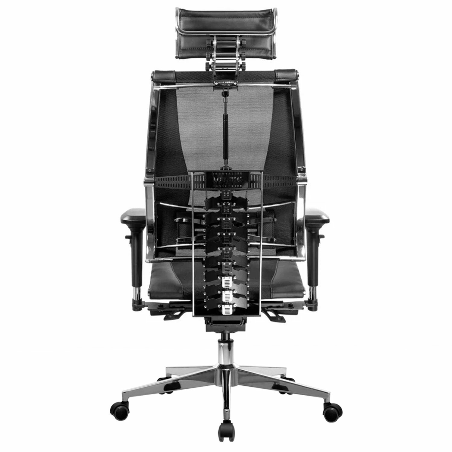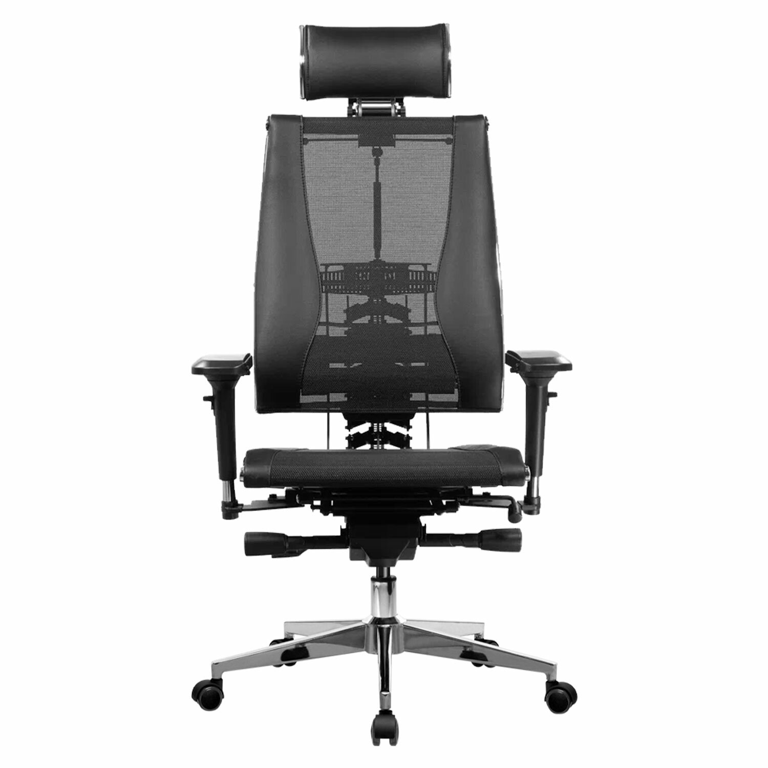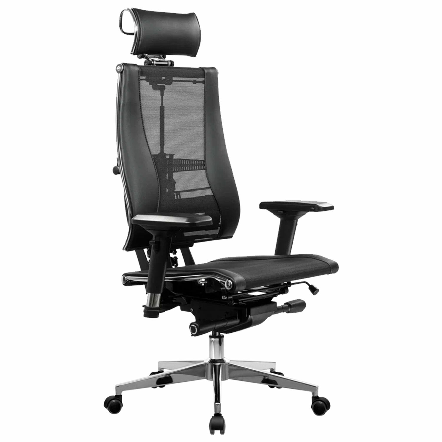 Сверхпрочный стальной каркас обеспечивает надежность кресла, а покрытие зеркальным хромом придает привлекательный вид.Адаптивная подвижная спинка обеспечивающая свободу движения за счёт гибкой опоры, которая поддерживает тело при всех поворотах и наклонах.Уникальная форма передней части сиденья исключает сдавливание сосудов ног, сохраняя ощущение легкости в ногах.Двухзонная регулировка жесткости сиденья позволяет достичь максимального удобства.Регулировка угла наклона сиденья (угол атаки).Регулировка глубины сиденья с помощью специального слайдера, фиксация в нескольких положениях.Раздельное синхронное отклонение спинки и сиденья с фиксацией в любом положении.Обивка из экокожи «Infinity» и сверхпрочной «дышащей» сетчатой ткани плотного плетения «YM93», прошивка «Pilot F».Регулируемый 3D-подголовник повышенной комфортности серии R, каркас стальной хромированный. Регулировка по глубине, высоте и углу наклона, обивка – экокожа.4D-подлокотники с регулировкой по высоте, по ширине, по углу поворота, вперед-назад.»Мультиблок» – механизм качания с возможностью регулировки силы отклонения и фиксации в различных положениях угла наклона кресла. Функция «антишок-эффект» позволяет исключить неожиданное «опрокидывание» кресла при изменении угла наклона.3D-поясничная поддержка (РПП) с регулировкой по глубине, высоте и жесткости.Пятилучие – алюминиевое литое, современного дизайна.Ролики противооткатные d-60 мм, полиамидные, с полиуретановым ободком, обеспечивающим бесшумный ход и защиту пола от повреждений.Прочный газлифт высшего 4 класса.