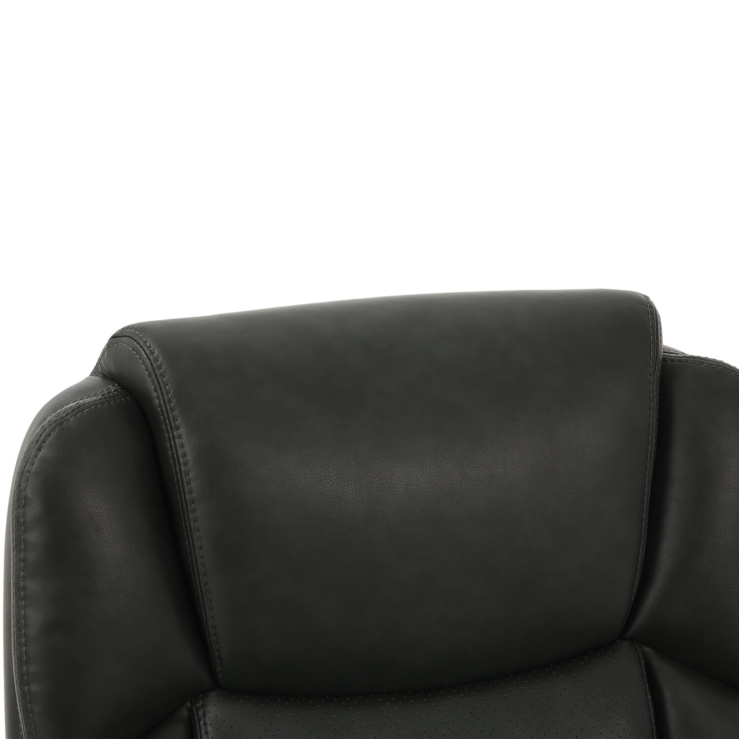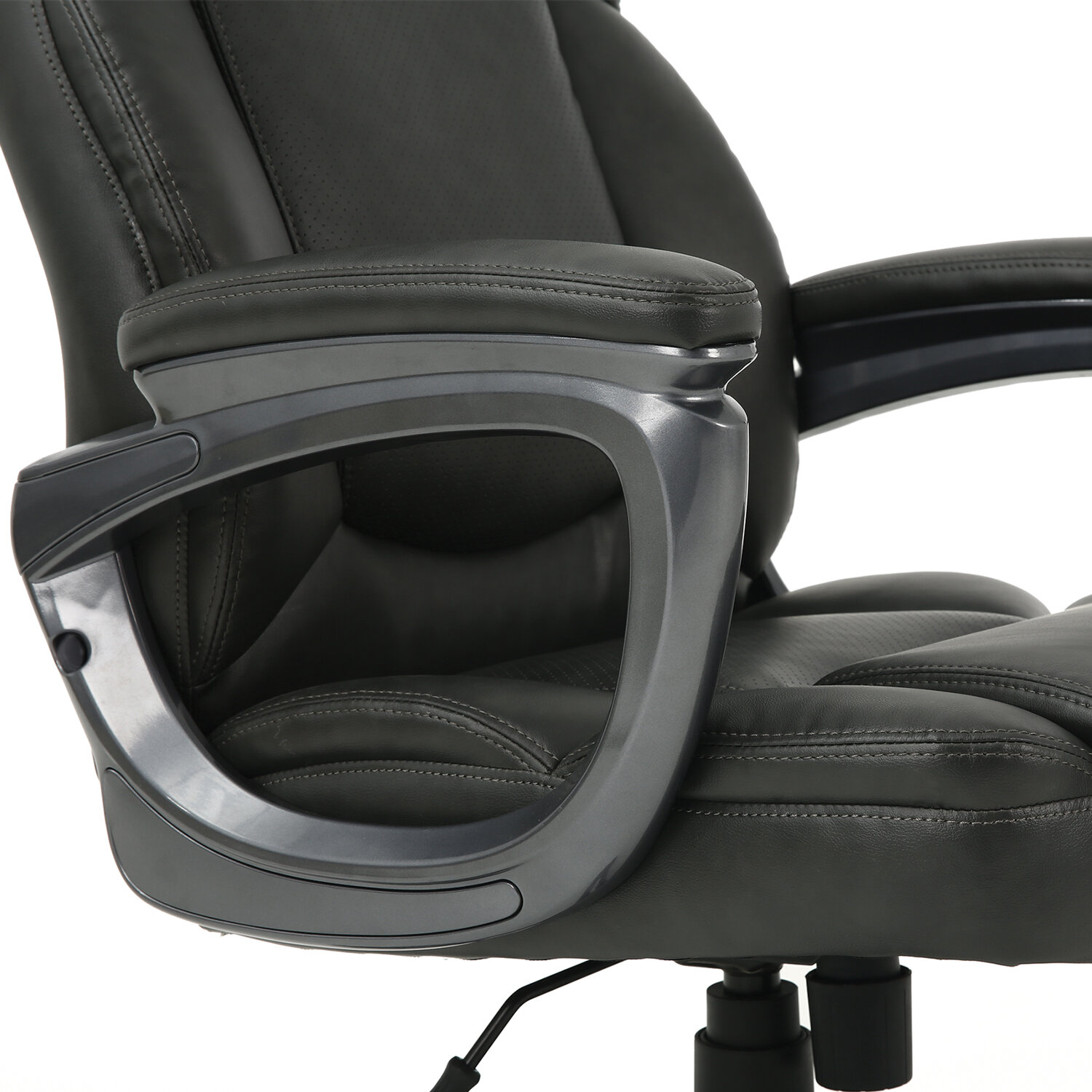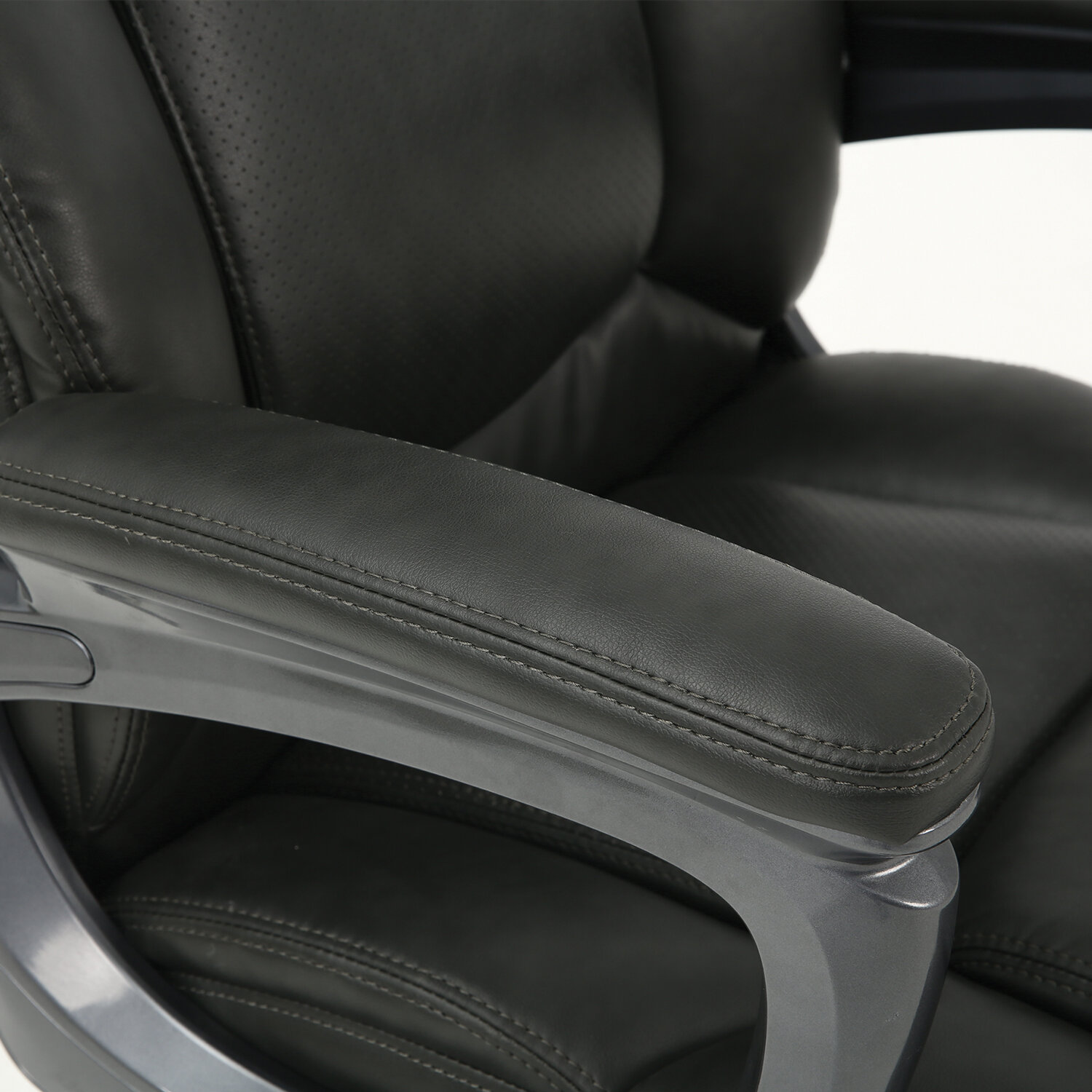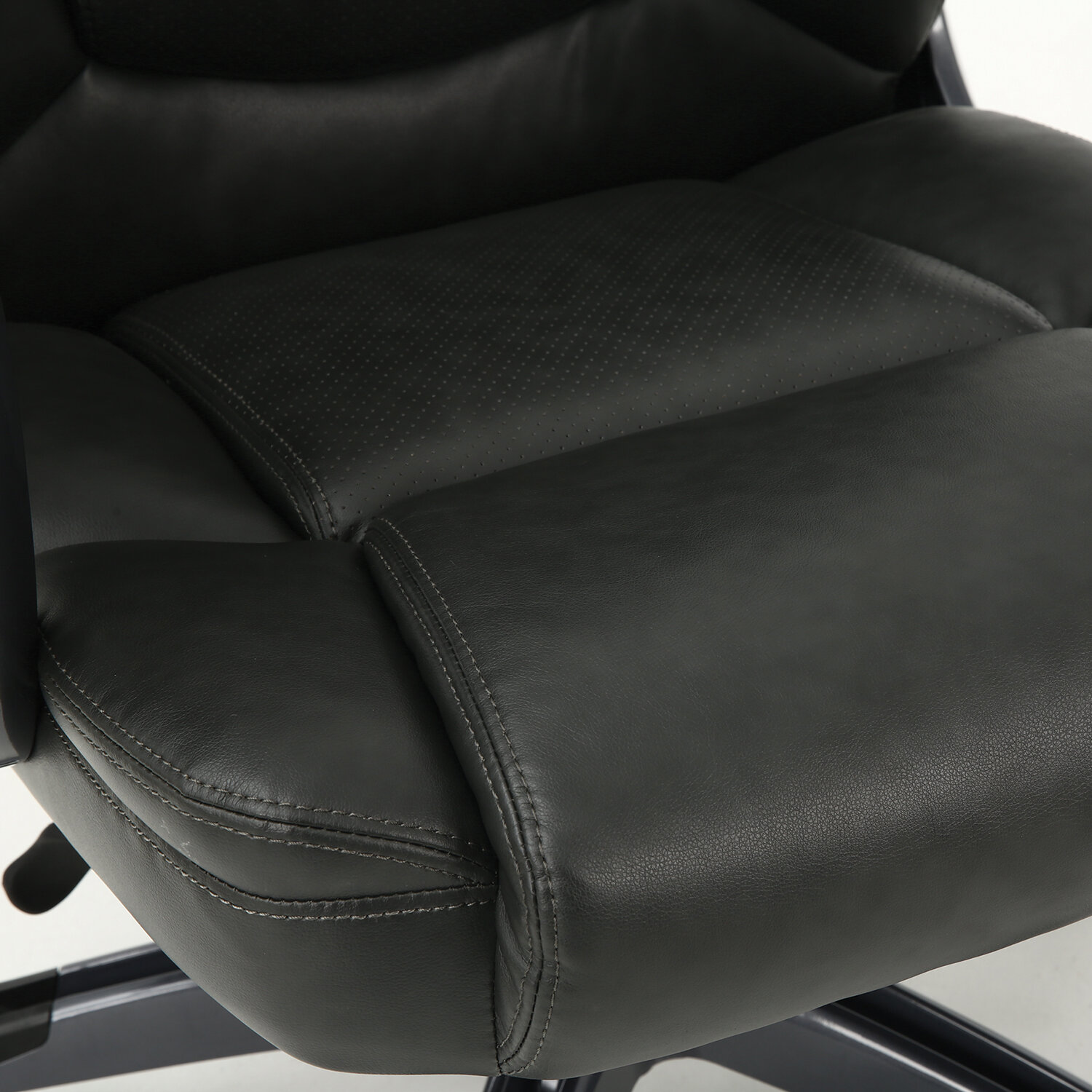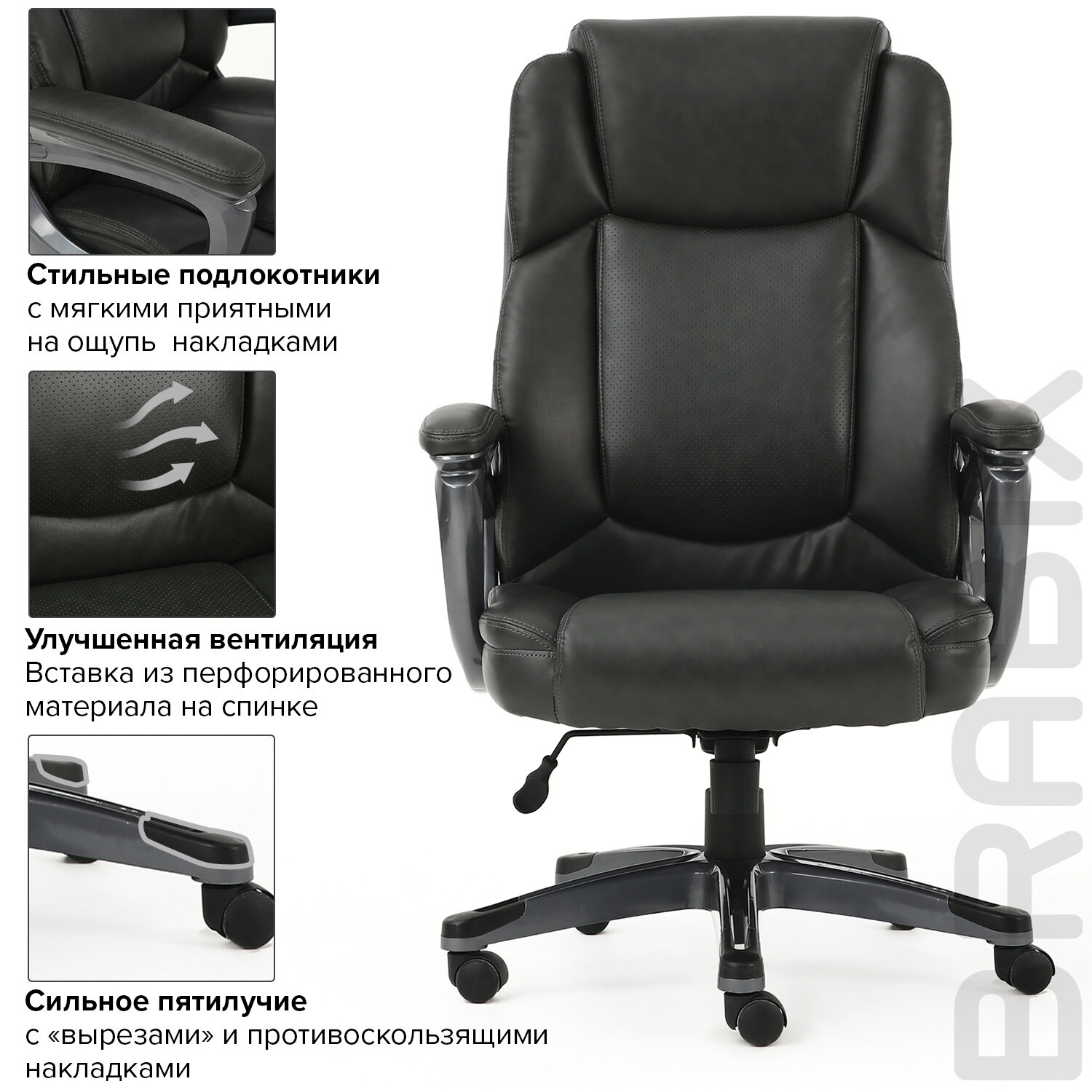 В техническом плане Favorite EX-577 есть чем похвастаться! Эргономичный изгиб спинки обеспечит поддержку в области поясницы, а широкий подголовник поможет разгрузить шейный отдел позвоночника.В сиденье встроен пружинный блок — конструкция из стальных независимых пружин, предназначенная для лучшей амортизации. Благодаря пружинным блокам мебель «не проседает» в процессе эксплуатации, сохраняет комфорт и функциональность. В набивке использован поролон высокой плотности.Прочные пластиковые подлокотники имеют мягкие накладки.Обивка кресла выполнена из рециклированной кожи — современного материала, созданного из измельченных частиц натуральной кожи. По эластичности и прочности такая кожа максимально близка к натуральной, а также имеет запах выделанной кожи. Материал отлично пропускает воздух, что положительным образом сказывается на комфорте во время эксплуатации. Рециклированная кожа износоустойчива, кресло способно сохранять привлекательный внешний вид длительное время.Перфорация в центральной части кресла способствует дополнительной циркуляции воздуха.Надежный механизм качания «Top Gun» обеспечивает хорошую поддержку спины и поясницы за счет возможности свободного качания с фиксацией в одном рабочем положении и регулировку угла наклона под вес сидящего. Максимальная нагрузка на кресло 125 кг.Качественное, надежное кресло премиального сегмента.Кресла марки BRABIX отличаются современным дизайном, эргономикой, аккуратным исполнением и отличным соотношением цены и качества.