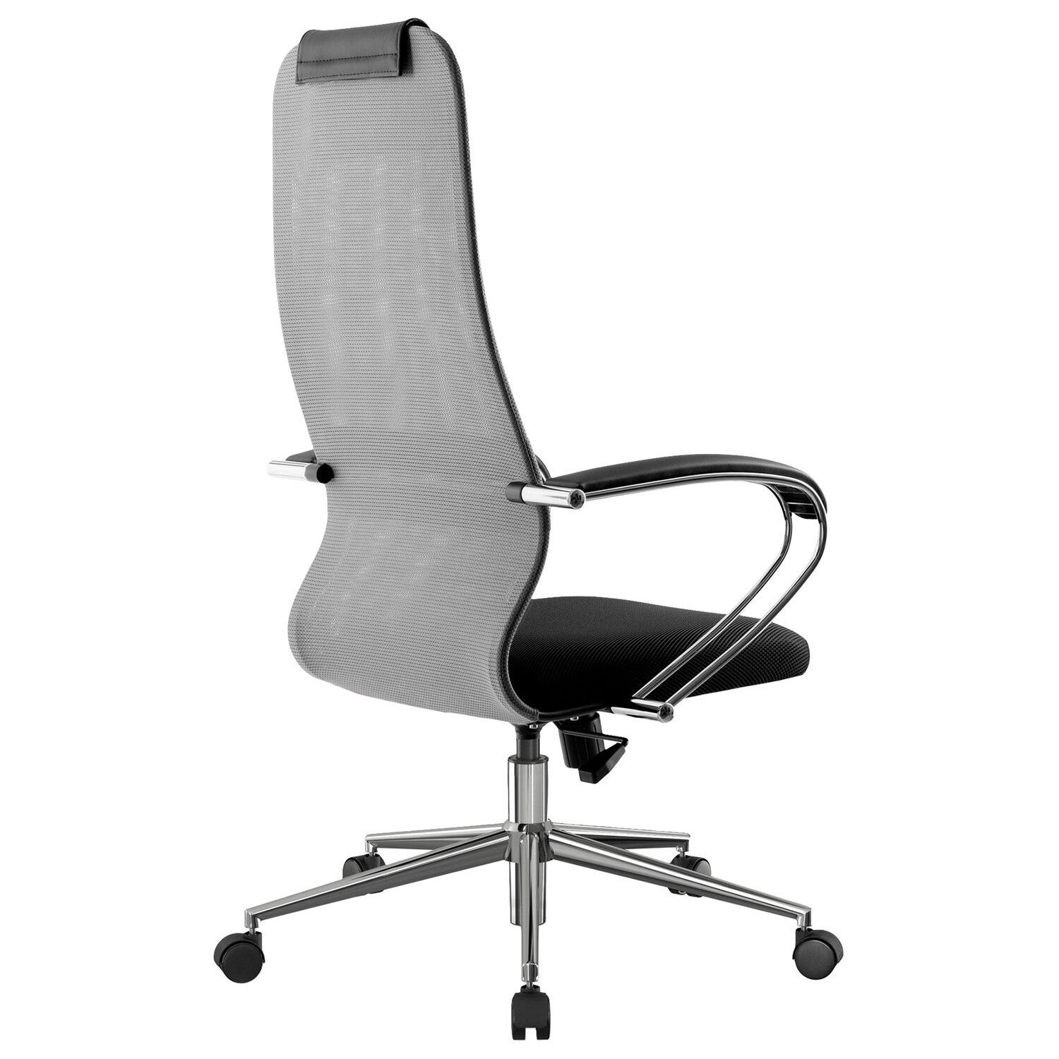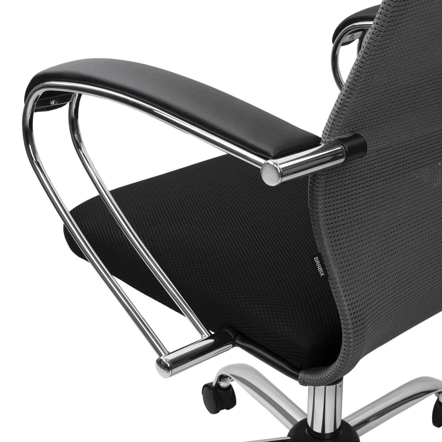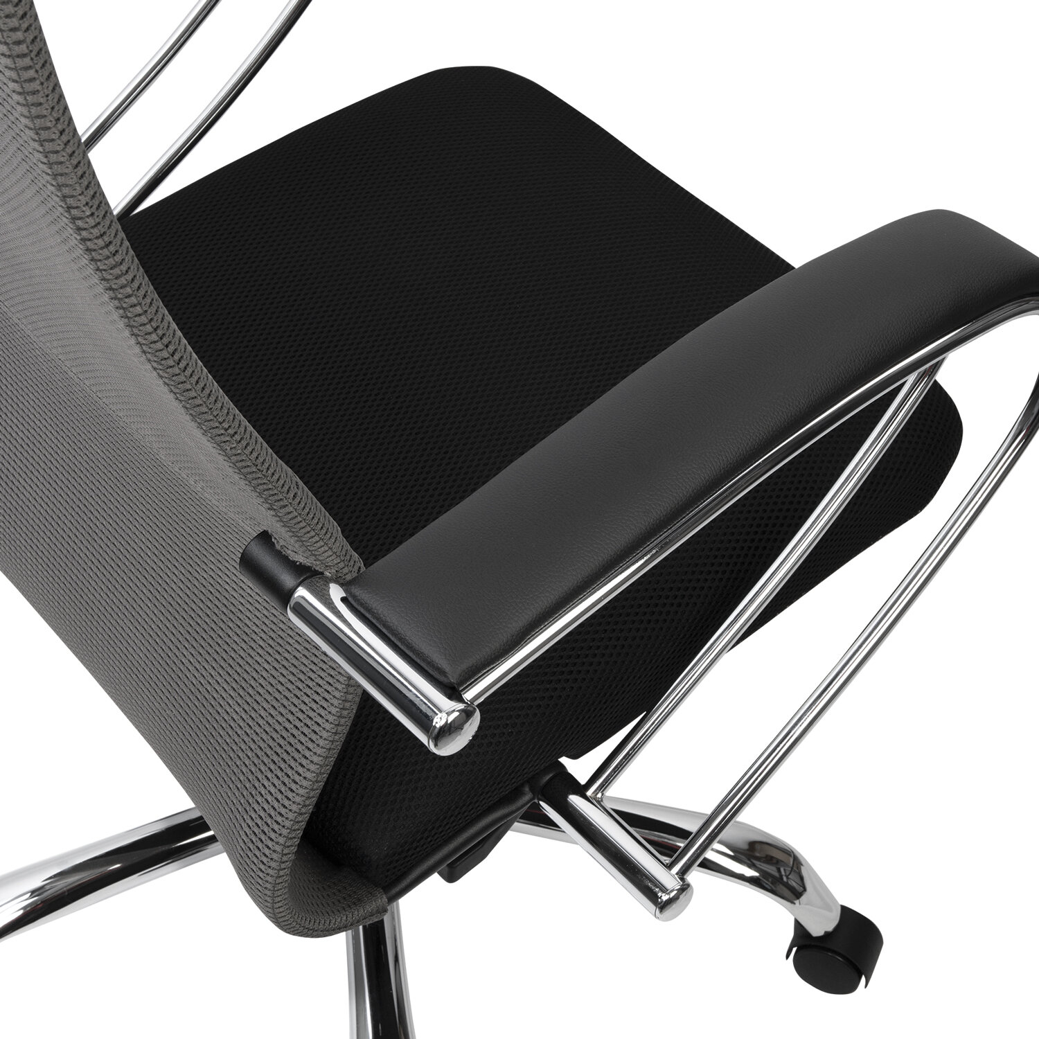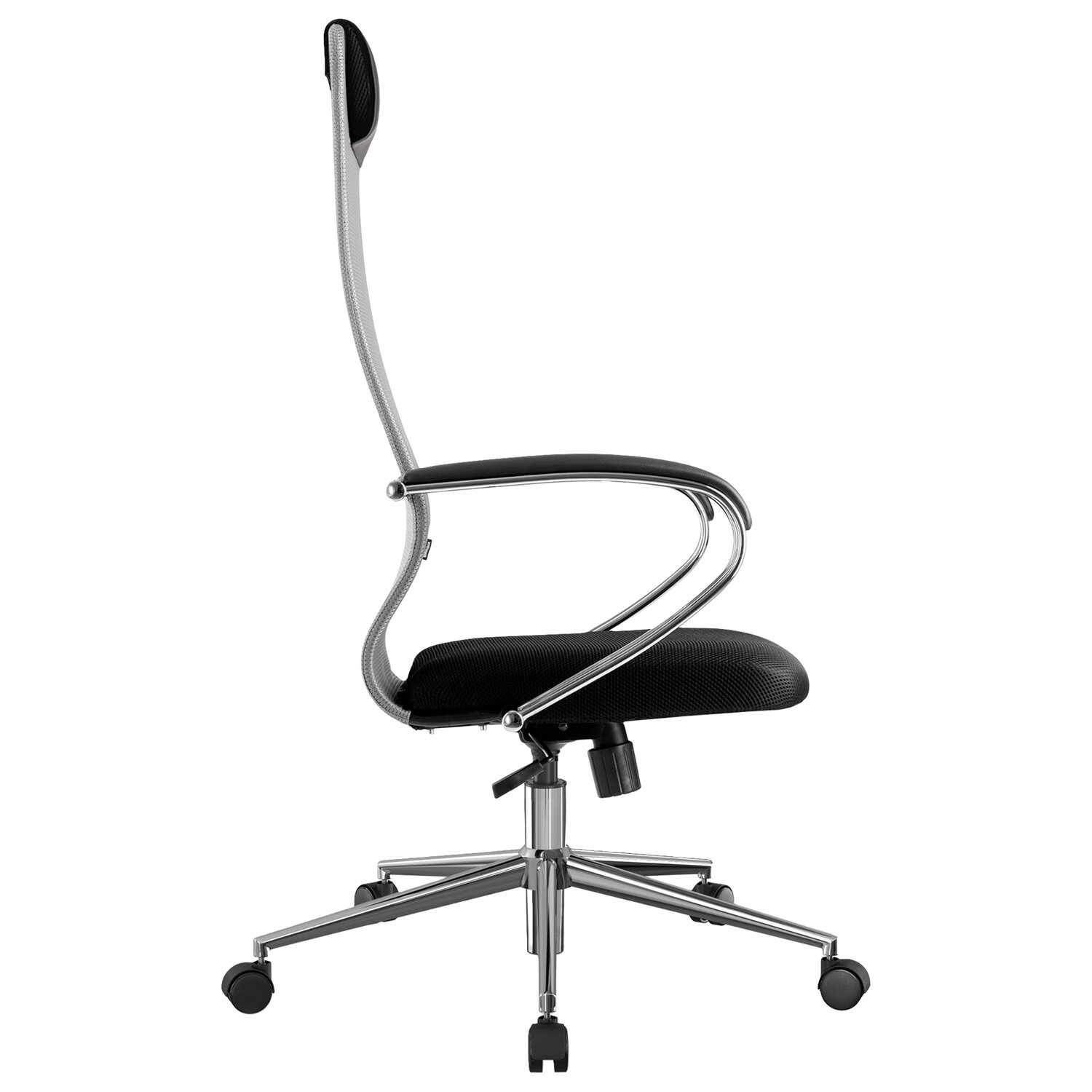Спинка высокая, эргономичной формы, с ярко выраженной поясничной поддержкой.Спинка имеет сверхпрочный стальной каркас с износостойким полимерным покрытием черного цвета.Спинка снабжена мягким, комфортным подголовником.Сиденье средней жесткости, объемное, на столярном каркасе.Обивка спинки из износоустойчивой «дышащей» сетчатой ткани двойного плетения.Подлокотники стальные классические, покрытые зеркальным хромом, с мягкими накладками.Пятилучие металлическое хромированное.Модель оснащена механизмом качания «Top-Gun» с регулировкой под вес и возможностью фиксации в рабочем положении.