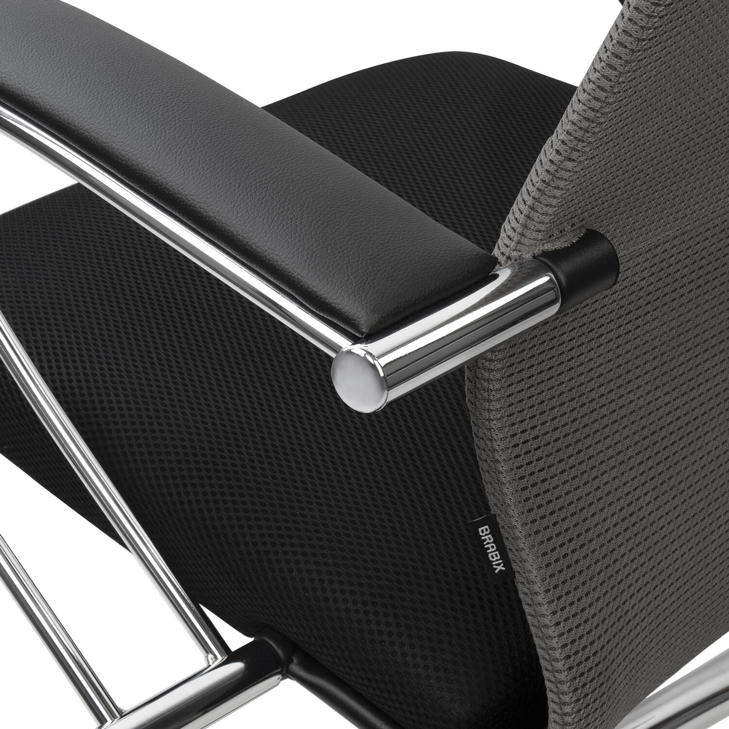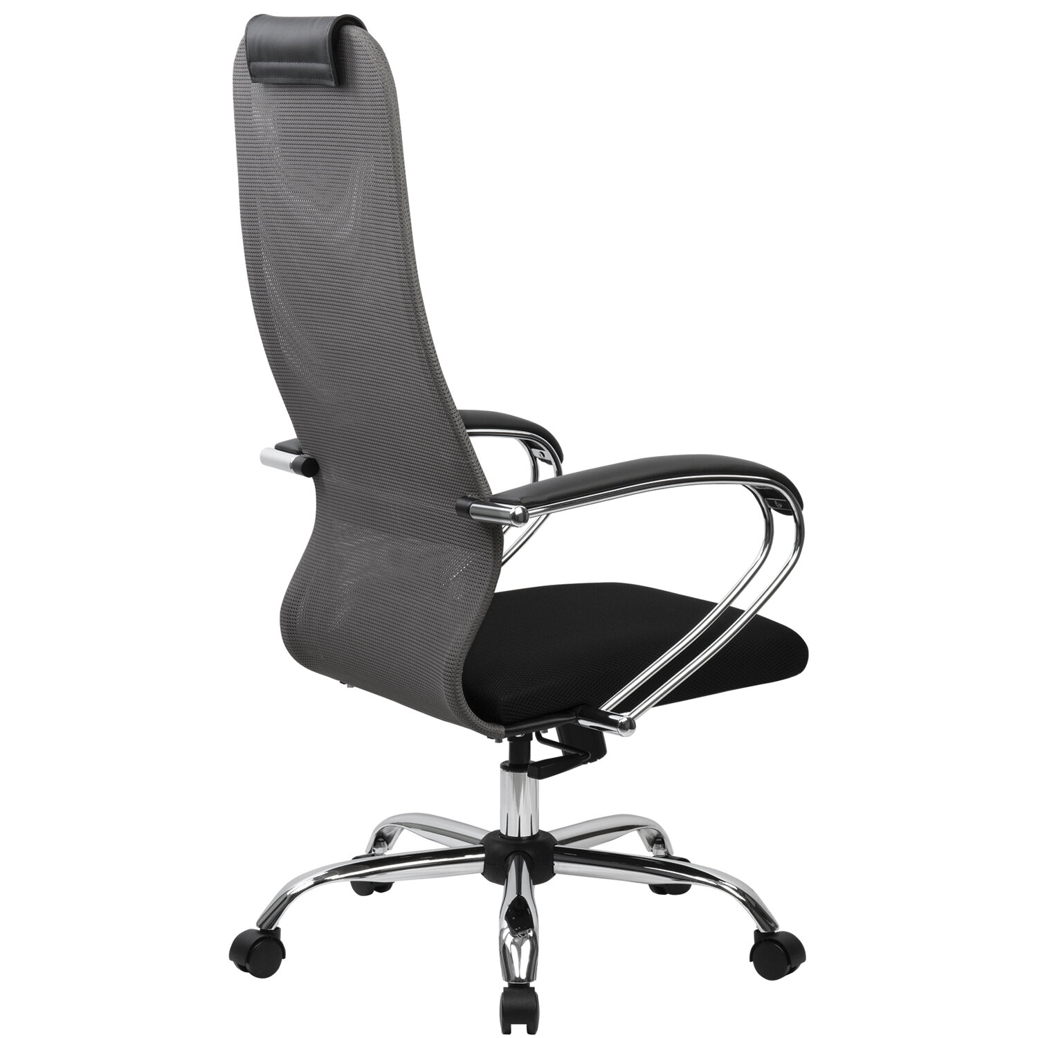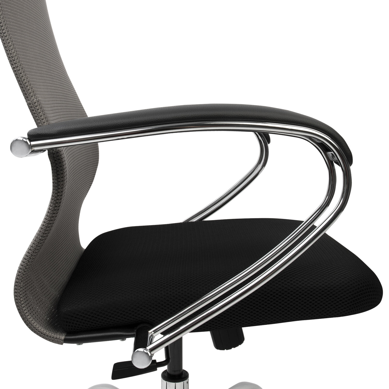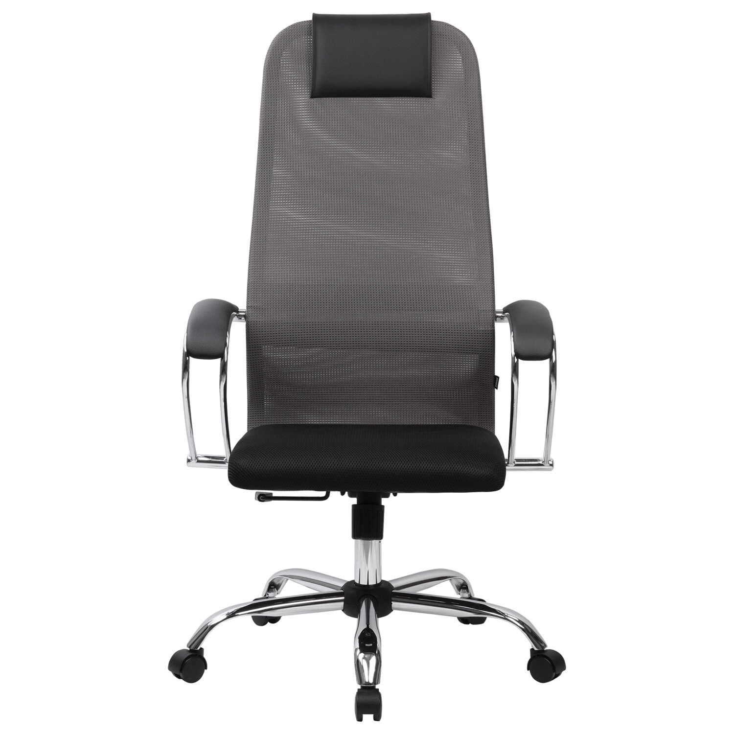 Спинка высокая, эргономичной формы, с ярко выраженной поясничной поддержкой.Спинка имеет сверхпрочный стальной каркас с износостойким полимерным покрытием черного цвета.Спинка снабжена мягким, комфортным подголовником.Сиденье средней жесткости, объемное, на столярном каркасе.Обивка спинки из износоустойчивой «дышащей» сетчатой ткани двойного плетения.Подлокотники стальные классические, покрытые зеркальным хромом, с мягкими накладками.Пятилучие металлическое хромированное.Модель оснащена механизмом качания «Top-Gun» с регулировкой под вес и возможностью фиксации в рабочем положении.
