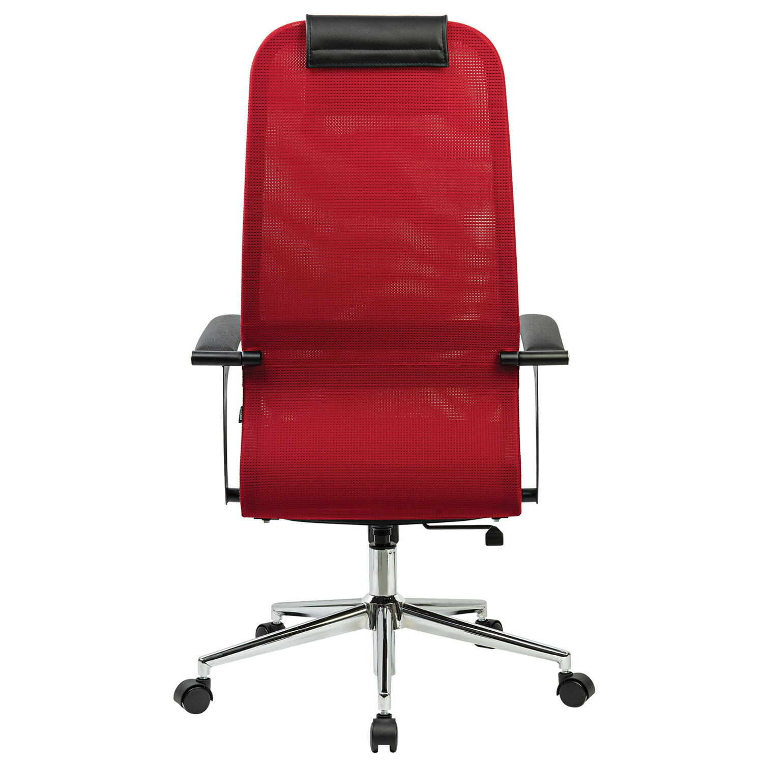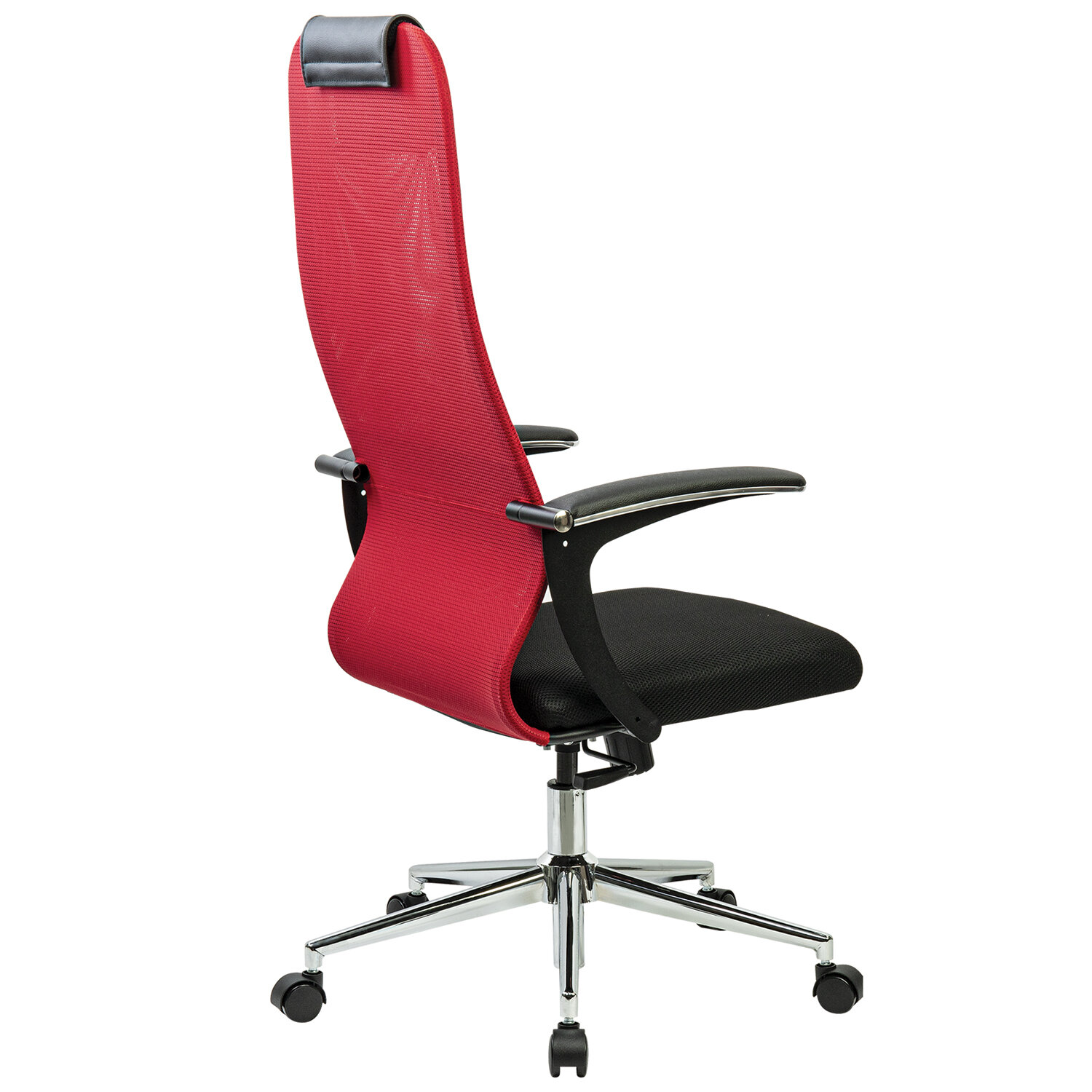 Спинка высокая, эргономичной формы, с ярко выраженной поясничной поддержкой.Спинка имеет сверхпрочный стальной каркас с износостойким полимерным покрытием черного цвета.Спинка снабжена мягким, комфортным подголовником.Сиденье средней жесткости, объемное, на столярном каркасе.Обивка спинки из износоустойчивой «дышащей» сетчатой ткани двойного плетения.Подлокотники стальные нового поколения, с хромированными молдингами и мягкими накладками.Пятилучие металлическое хромированное, стильное и прочное.Модель оснащена механизмом качания «Top-Gun» с регулировкой под вес и возможностью фиксации в рабочем положении.
