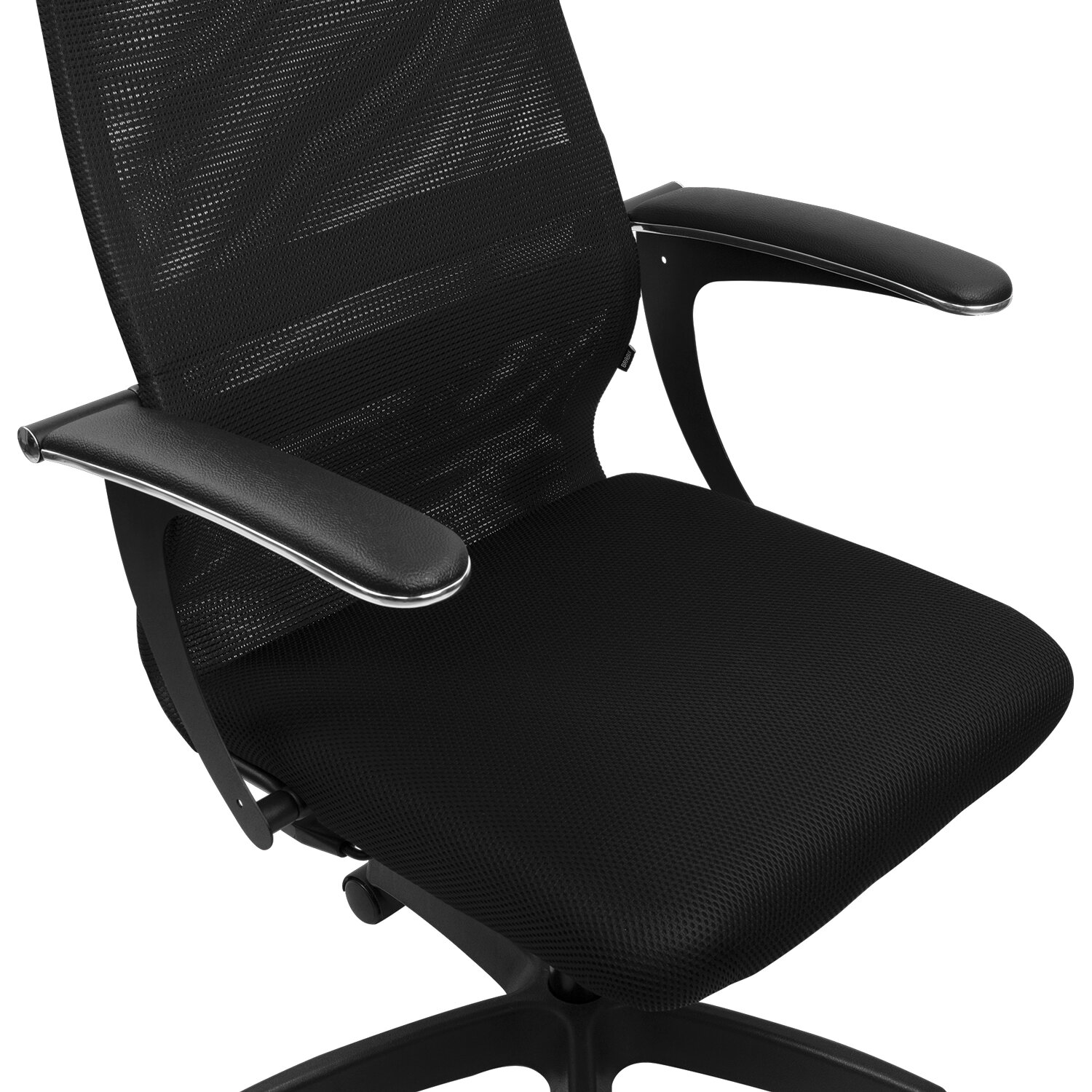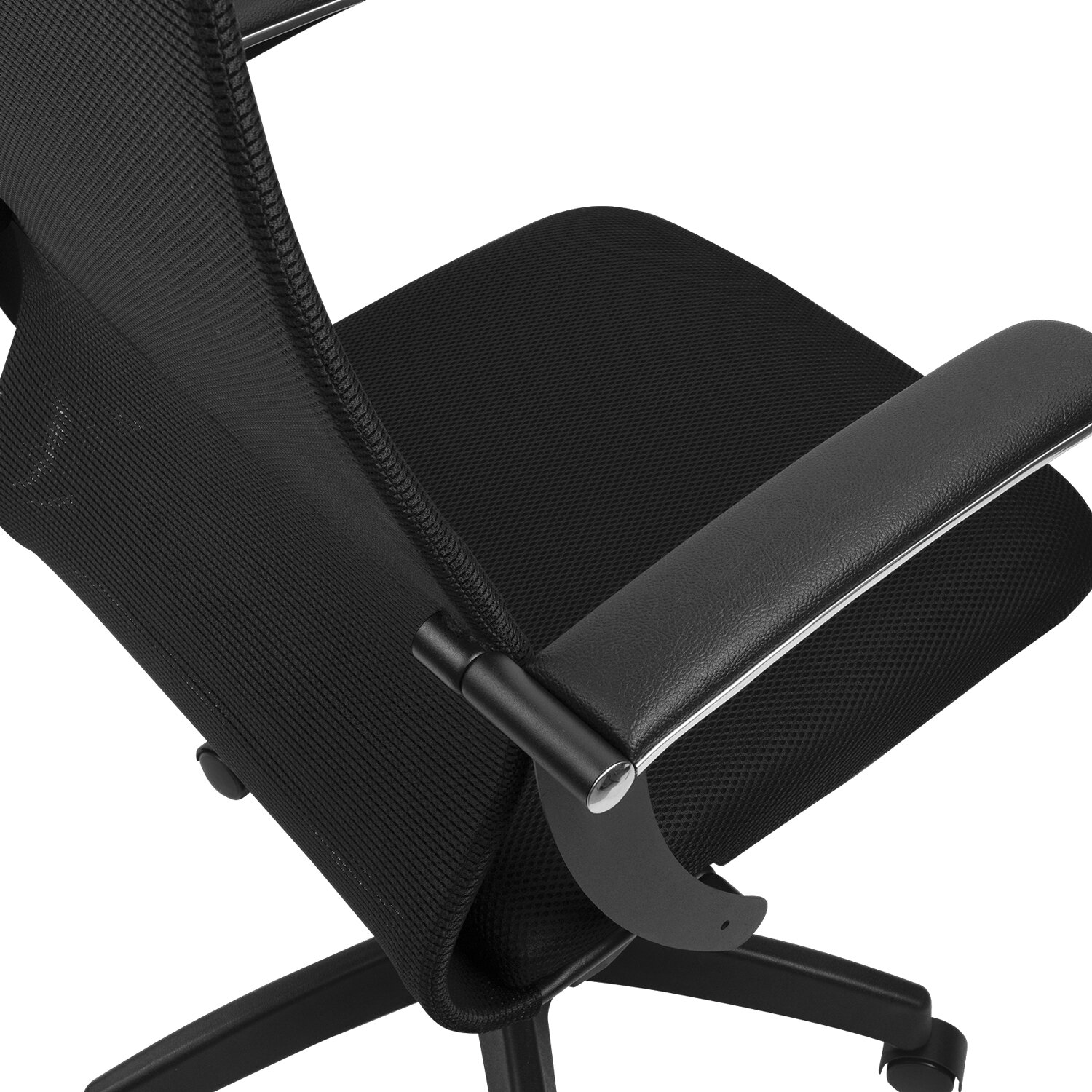 Спинка высокая, эргономичной формы, с ярко выраженной поясничной поддержкой.Спинка имеет сверхпрочный стальной каркас с износостойким полимерным покрытием черного цвета.Спинка снабжена мягким, комфортным подголовником.Сиденье средней жесткости, объемное, на столярном каркасе.Обивка спинки из износоустойчивой «дышащей» сетчатой ткани двойного плетения.Подлокотники стальные нового поколения, с хромированными молдингами и мягкими накладками.Пятилучие пластиковое, прочное.Модель оснащена механизмом качания «Top-Gun» с регулировкой под вес и возможностью фиксации в рабочем положении.