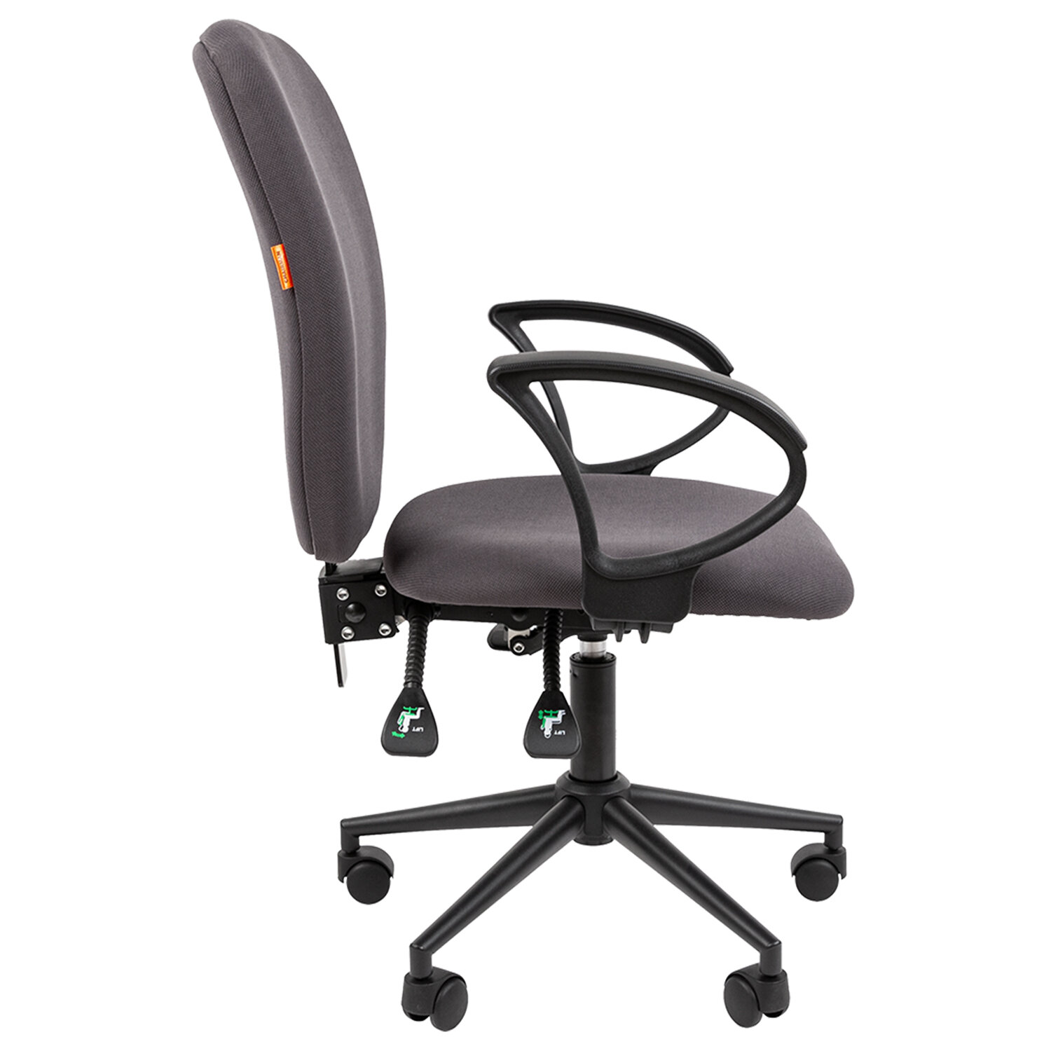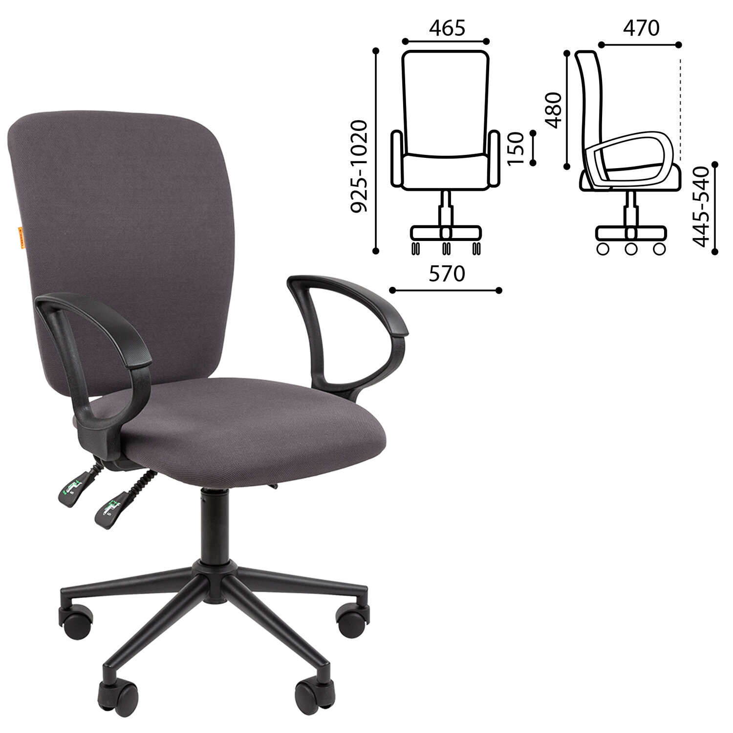 Материалы – ткань стандарт.Подлокотники – пластиковые.Механизм качания – асинхронный, с независимой регулировкой угла наклона спинки и сиденья. Фиксация в любом положении. Регулировка кресла по высоте.Крестовина – металлическая, окрашенная.Газпатрон – 3 класс по стандарту Germany DIN 4550.Ролики – стандарт BIFMA 5.1 (США), диаметр штока – 11 мм, покрытие – нейлон.Каркас – немонолитный.Набивка – вспененный полиуретан плотностью 22–25 кг/м3.Максимальная рекомендованная нагрузка – до 120 кг.Гарантия производителя – 2 года.