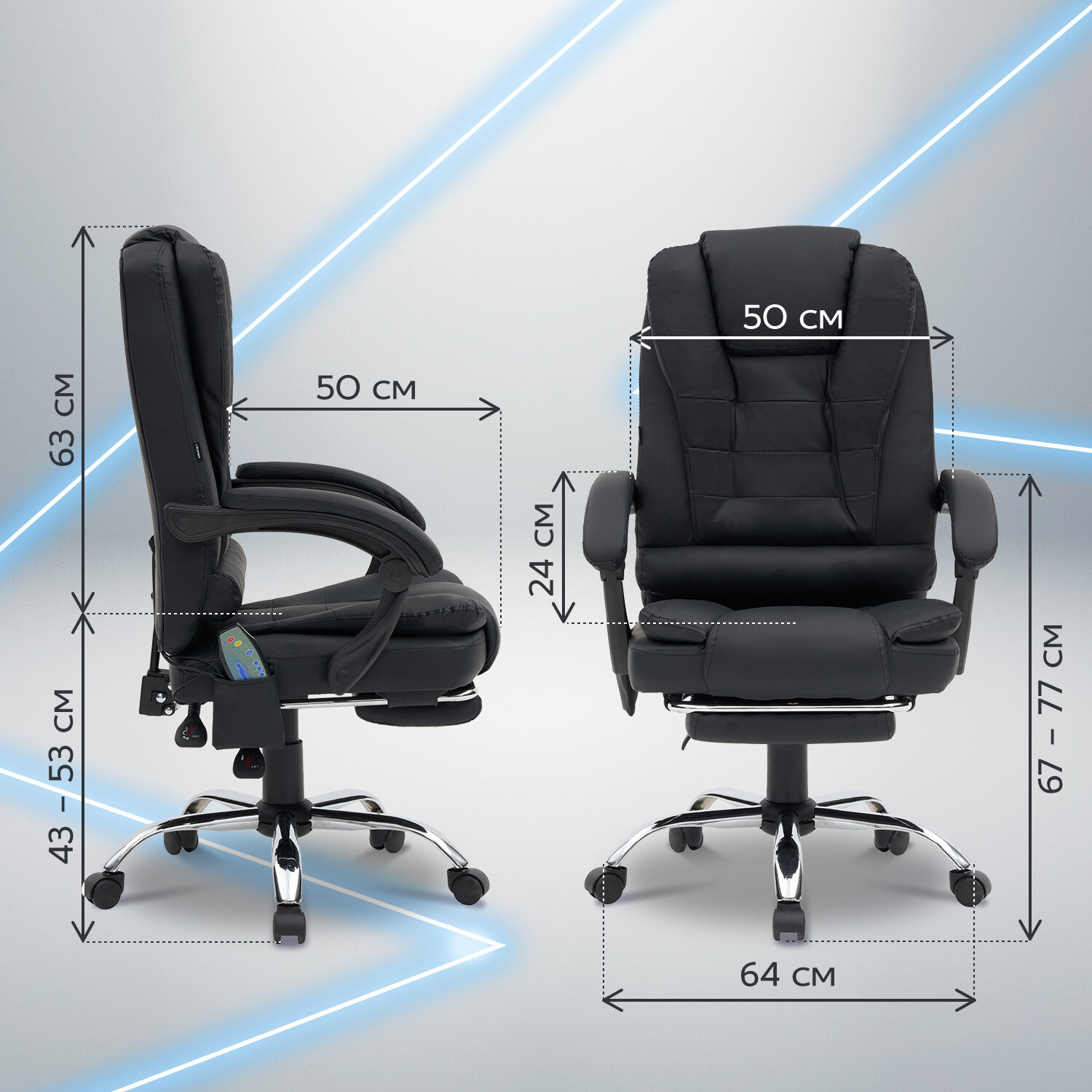 Механизм отклонения спинки позволяет настроить её угол под индивидуальные предпочтения, а подвижные подлокотники с мягкими накладками обеспечивают комфорт в течение всего рабочего дня. Четыре массажных модуля в области поясницы и два в области сиденья, также подставка для ног добавляет удобства и позволяет расслабиться после долгой работы. Экокожа приятна на ощупь и проста в уходе, а стильный дизайн впишется в любой интерьер. В основании – надежное металлическое пятилучие и газлифт 2 класса. Кресло справится с нагрузкой до 120 кг! Собирается легко, все необходимые инструменты есть в комплекте.