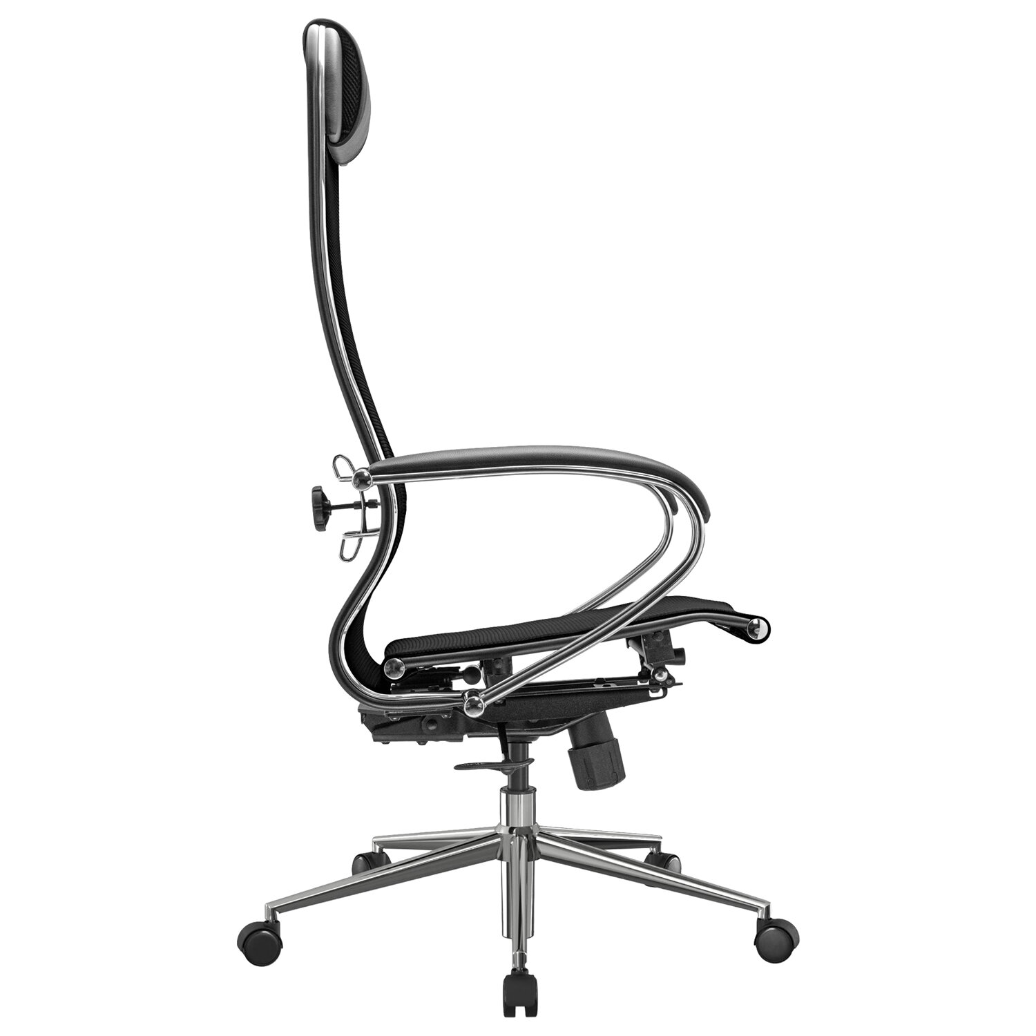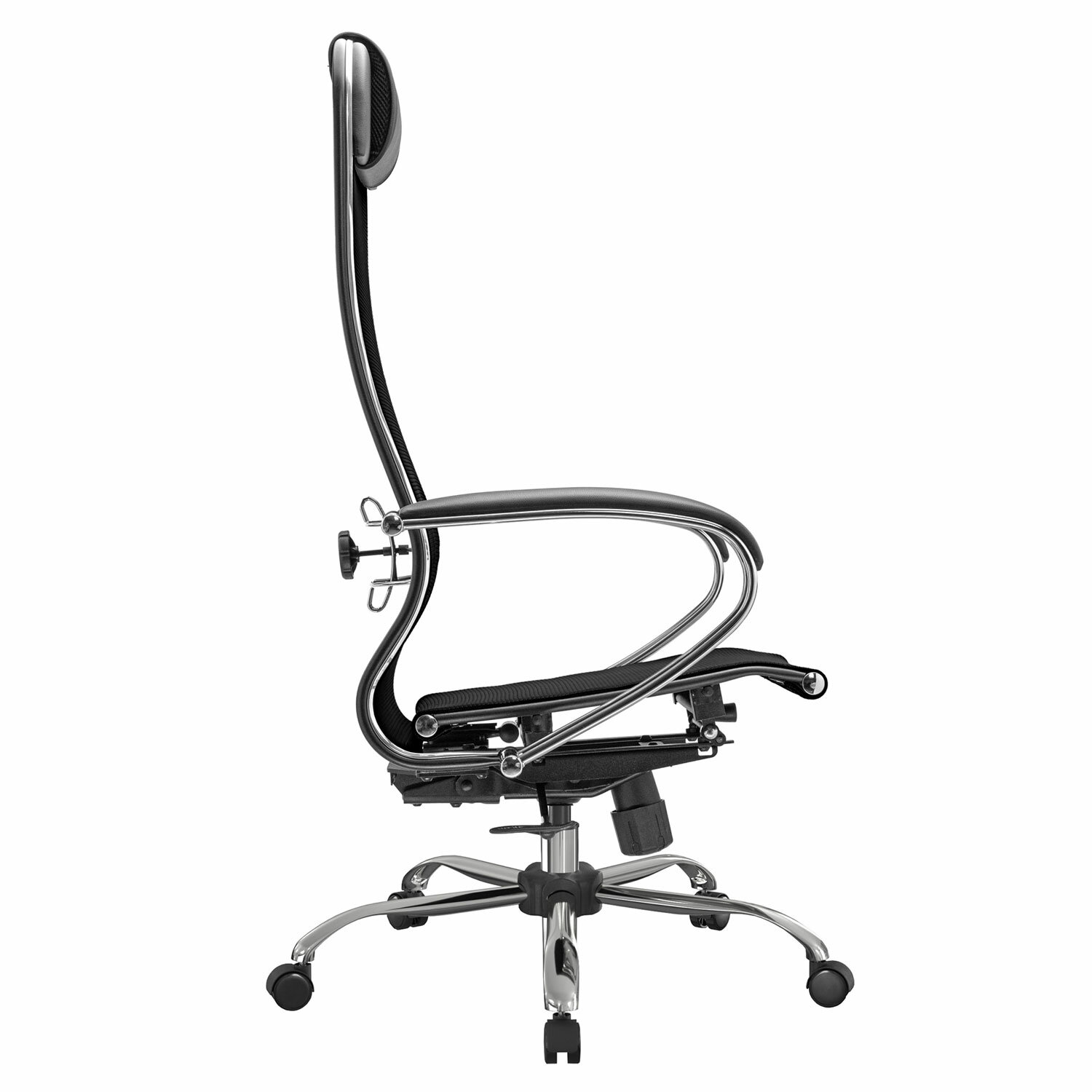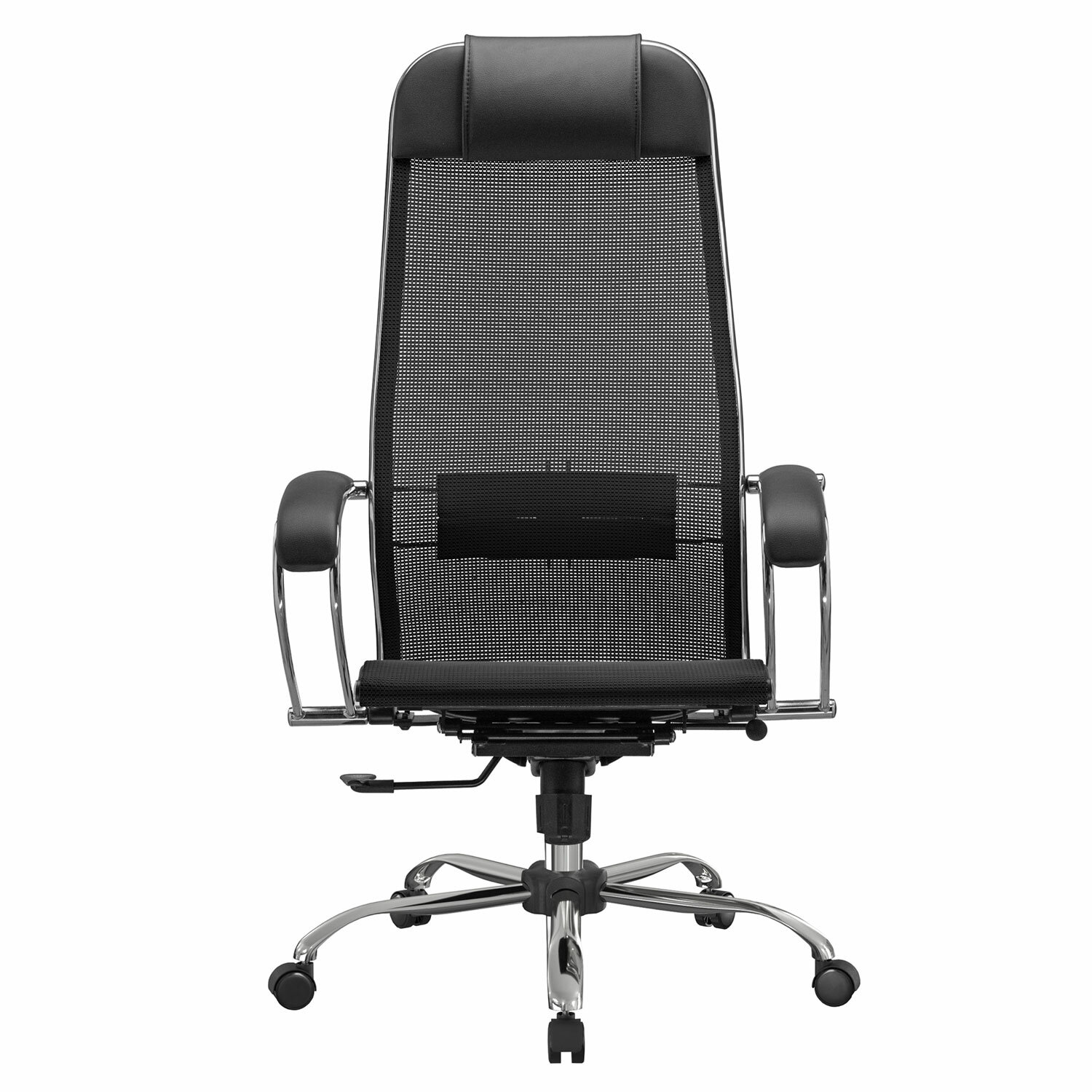 Сверхпрочный стальной каркас.Спинка высокая, эргономичной формы с ярко выраженной поясничной поддержкой, с хромированным молдингом.Эргогиб, как у кресел SAMURAI.Спинка имеет стальной регулируемый поясничный подпор с ремнем из перфорированной экокожи Extra.Спинка снабжена мягким комфортным подголовником.Уникальная форма передней части сиденья исключает сдавливание сосудов ног, сохраняя ощущение легкости в ногах.Двухзонная регулировка жесткости сиденья позволяет достичь максимального удобства, а также при необходимости настроить угол наклона сиденья за счет разного натяжения передней и задней зоны.Регулировка глубины сиденья за счет перемещения места крепления сиденья (450-480 мм).Обивка из износоустойчивой «дышащей» сетчатой ткани Х2.Подлокотники стальные классические, покрытые зеркальным хромом, с мягкими накладками из экокожи.Пятилучие – металлическое хромированное.Модель оснащена синхромеханизмом качания (S1.0) M20 с регулировкой под вес и возможностью фиксации в рабочем положении.Ролики: полиамидные с полиуретановым ободком, D – 50 мм.
