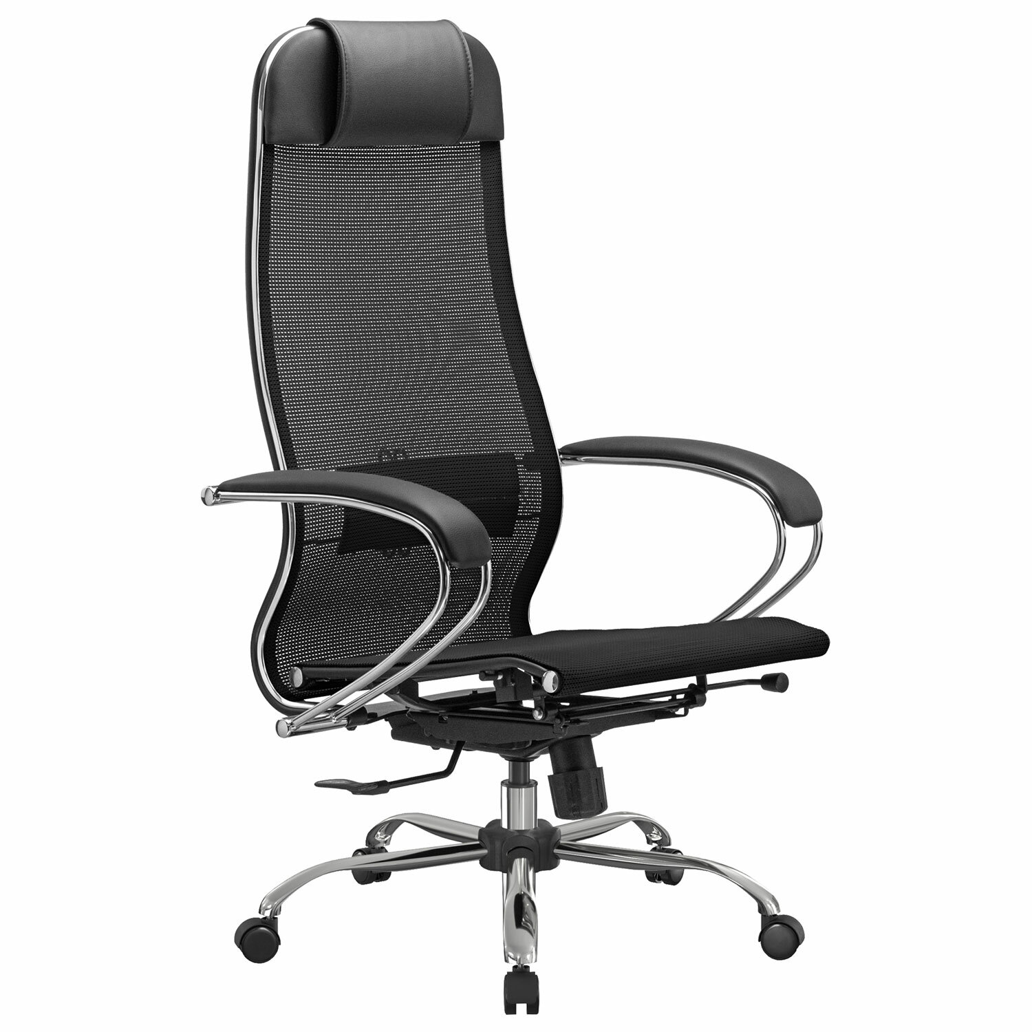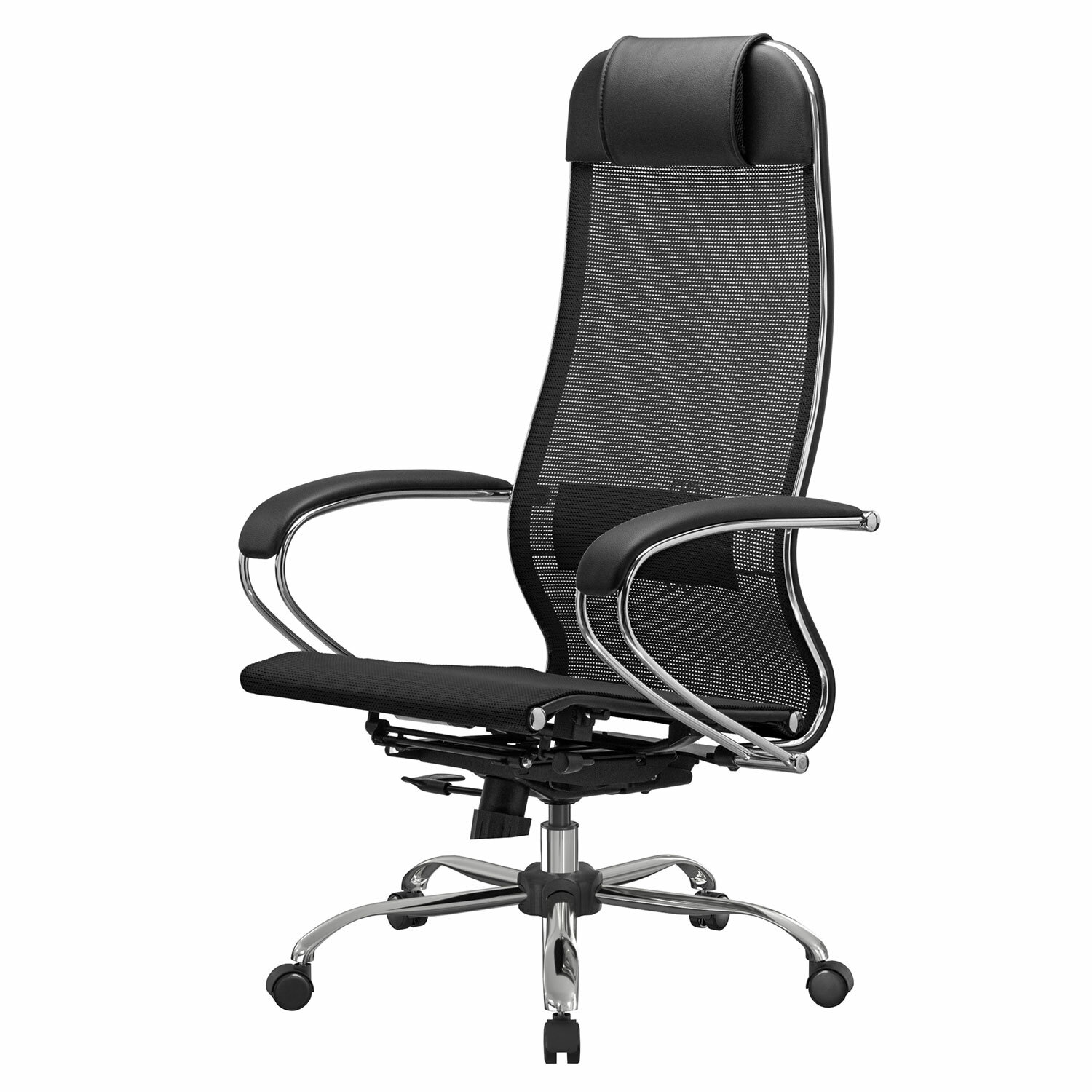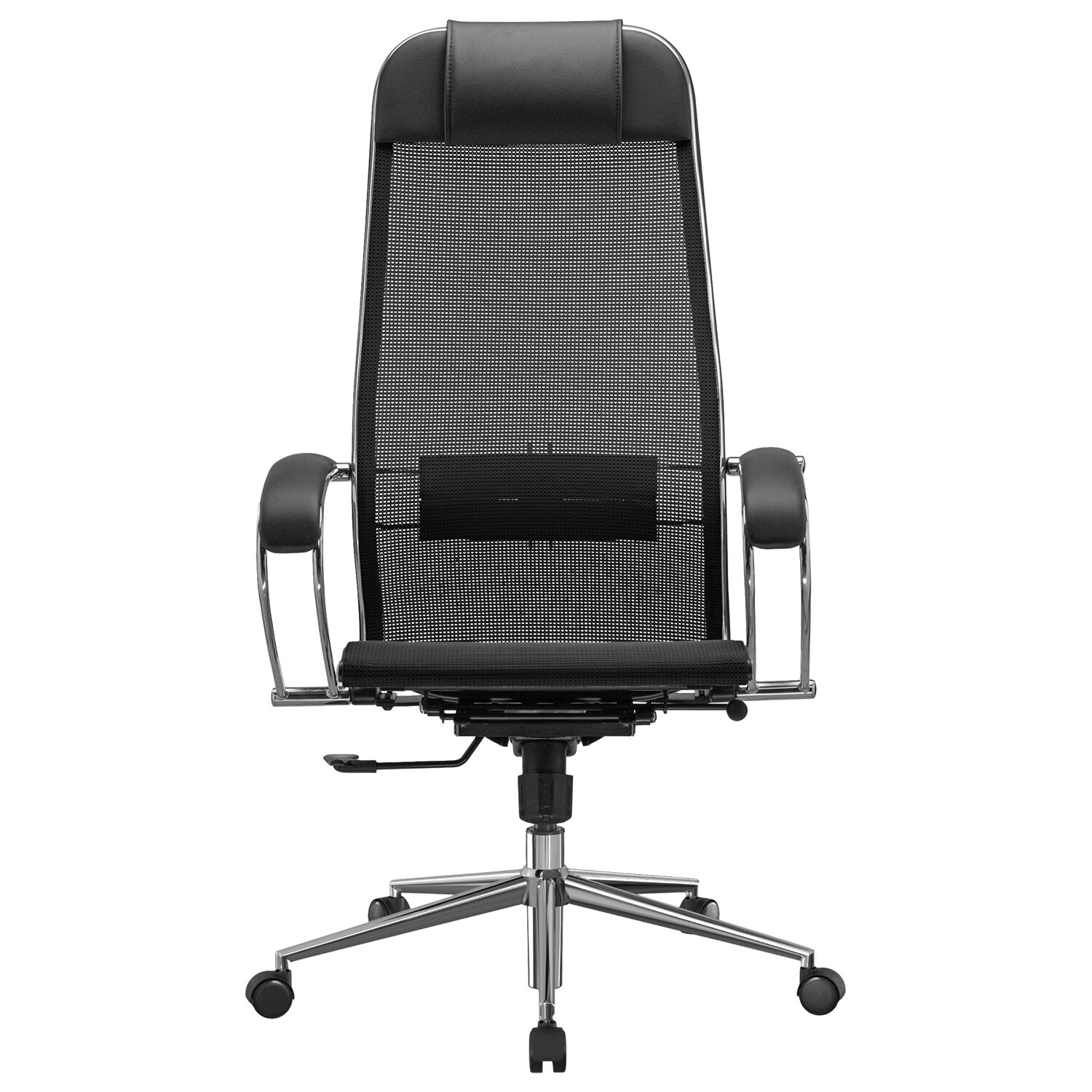 Сверхпрочный стальной каркас.Спинка высокая, эргономичной формы с ярко выраженной поясничной поддержкой, с хромированным молдингом.Эргогиб, как у кресел SAMURAI.Спинка имеет стальной регулируемый поясничный подпор с ремнем из перфорированной экокожи Extra.Спинка снабжена мягким комфортным подголовником.Уникальная форма передней части сиденья исключает сдавливание сосудов ног, сохраняя ощущение легкости в ногах.Двухзонная регулировка жесткости сиденья позволяет достичь максимального удобства, а также при необходимости настроить угол наклона сиденья за счет разного натяжения передней и задней зоны.Регулировка глубины сиденья за счет перемещения места крепления сиденья (450-480 мм).Обивка из износоустойчивой «дышащей» сетчатой ткани Х2.Подлокотники стальные классические, покрытые зеркальным хромом, с мягкими накладками из экокожи.Пятилучие – металлическое хромированное.Модель оснащена синхромеханизмом качания (S1.0) M20 с регулировкой под вес и возможностью фиксации в рабочем положении.Ролики: полиамидные с полиуретановым ободком, D – 50 мм.