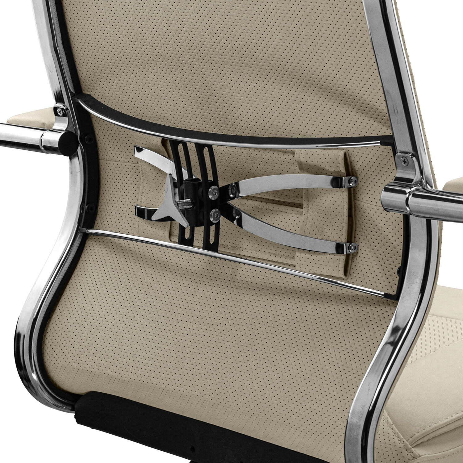 Сверхпрочный стальной каркас обеспечивает надежность кресла, а покрытие зеркальным хромом придает привлекательный вид.Обивка из износостойкой перфорированной рециклированной кожи на рабочих поверхностях кресла и экокожа на нерабочих поверхностях.Сиденье средней жесткости.Регулировка глубины сиденья с помощью специального слайдера.Комфортный подголовник.Металлические хромированные подлокотники с мягкими накладками.»Мультиблок» – механизм качания с возможностью регулировки силы отклонения и фиксации в четырех различных положениях угла наклона кресла. Функция «Антишок-эффект» позволяет исключить неожиданное «опрокидывание» кресла при изменении угла наклона.Раздельное отклонение спинки и сиденья.Эргономичная форма спинки соответствует анатомической форме человека.Регулировка жесткости поясничной поддержки: пластинчатый стальной хромированный 3D-подпор с ремнем из перфорированной экокожи Extra.Зеркальное литое пятилучие.Премиальное кресло по вполне доступной цене.Товары торговой марки МЕТТА отличаются надежным металлическим каркасом, продуманной эргономикой, современным дизайном и доступной ценой.