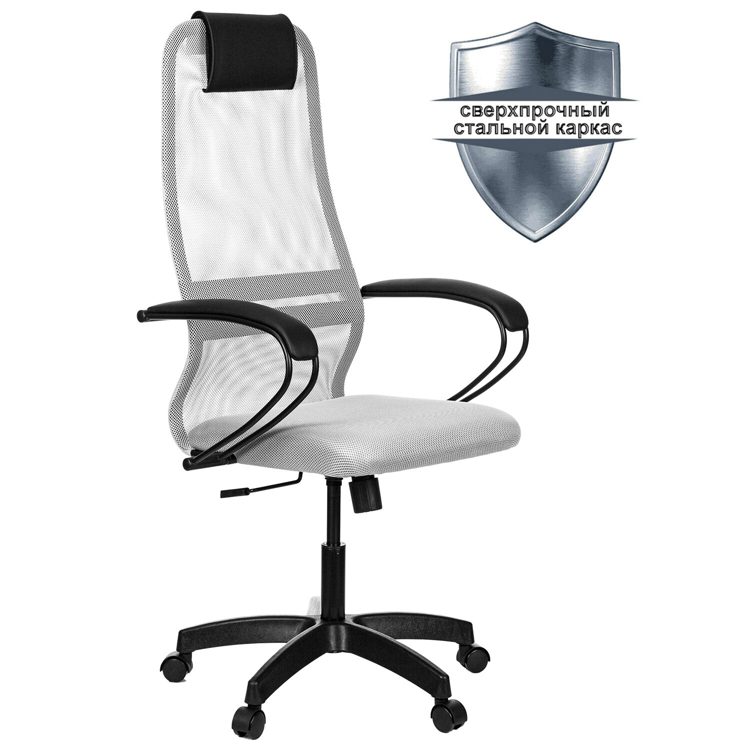 Спинка высокая, эргономичной формы с ярко выраженной поясничной поддержкой.Спинка имеет сверхпрочный стальной каркас с износостойким полимерным покрытием черного цвета.Спинка снабжена мягким комфортным подголовником.Сиденье средней жесткости, объемное на столярном каркасе.Обивка из износоустойчивой «дышащей» сетчатой ткани.Подлокотники стальные классические, с мягкими накладками из экокожи.Прочное пластиковое пятилучие.Модель оснащена механизмом качания «Top-Gun» с регулировкой под вес и возможностью фиксации в рабочем положении.
