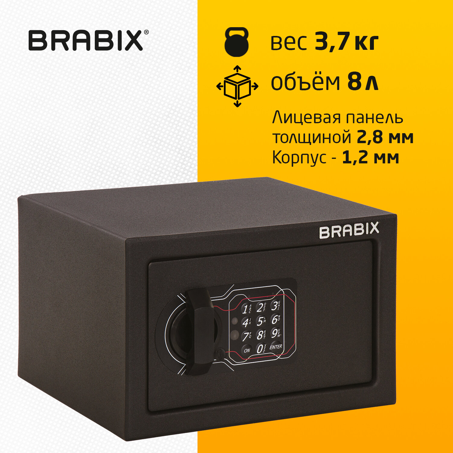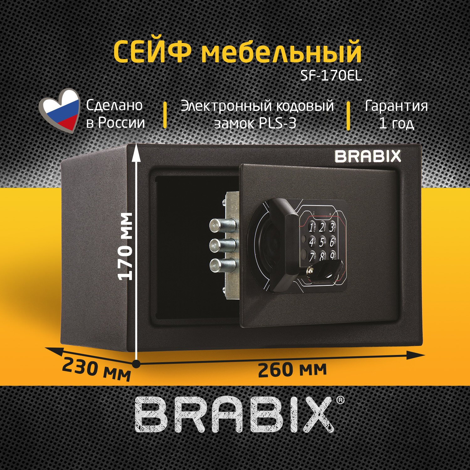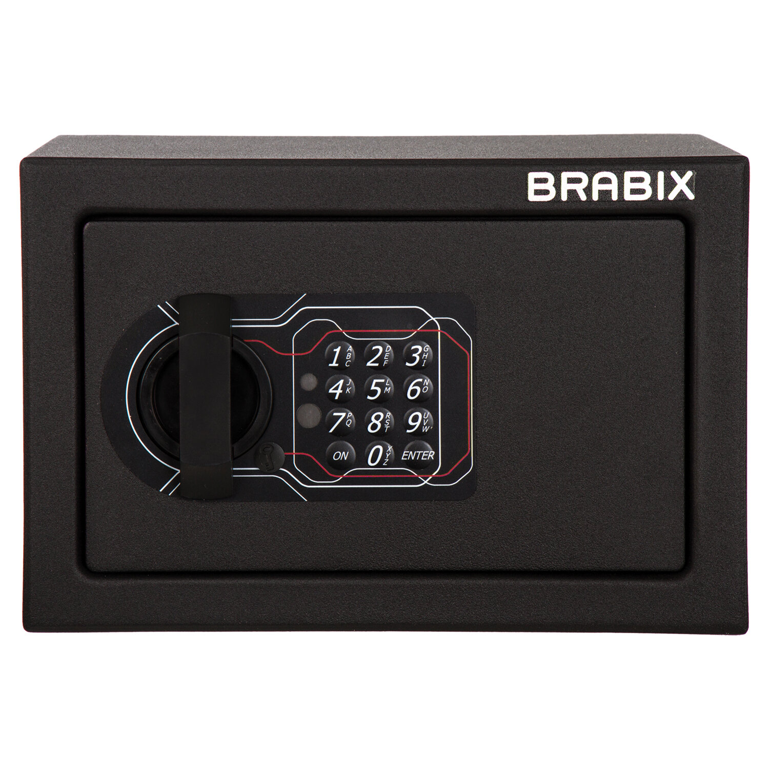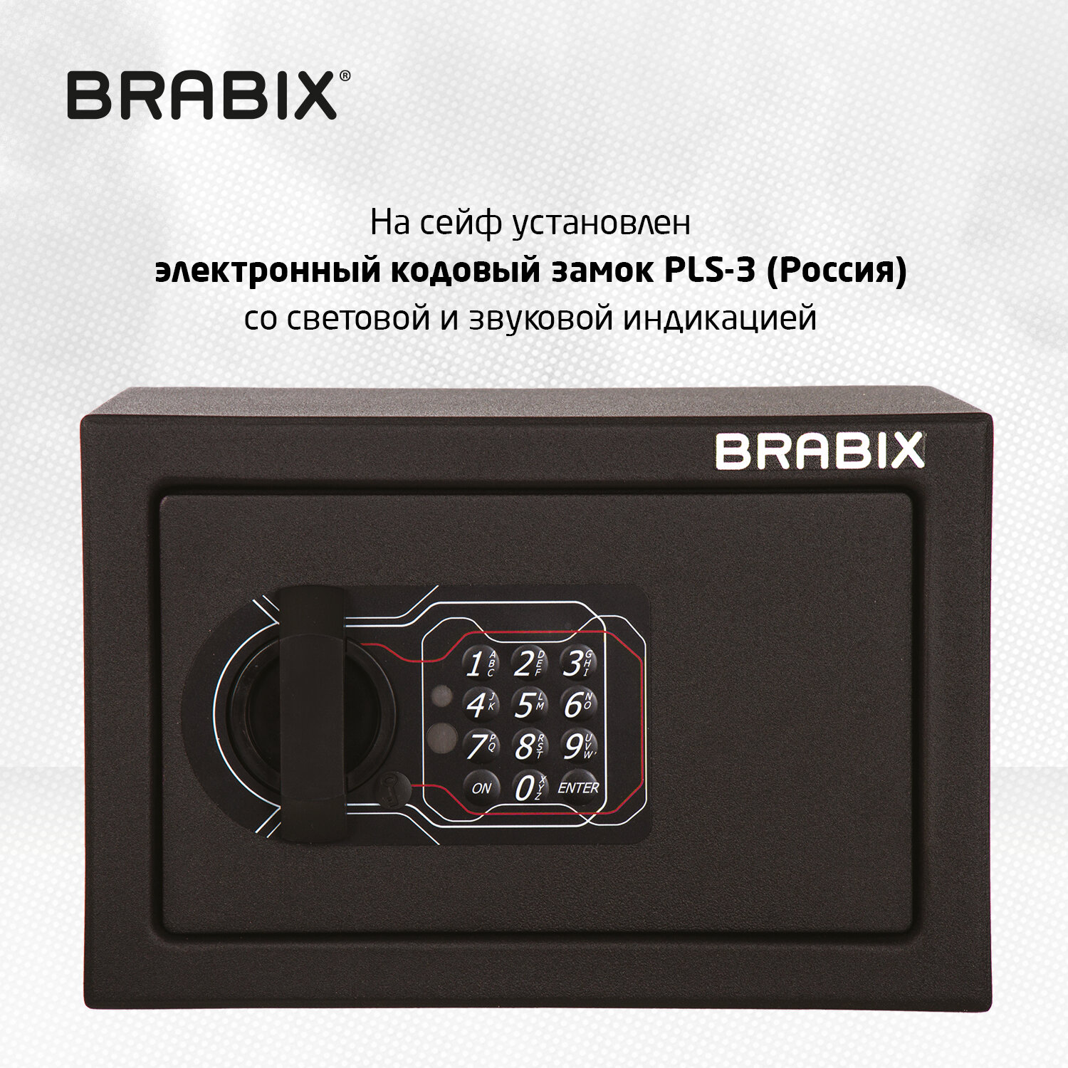 Сейф изготовлен из стали. Лицевая панель толщиной — 2,8 мм, боковые — 1,2 мм.На сейф установлен электронный кодовый замок PLS-3 (Россия) со световой и звуковой индикацией, позволяющий запрограммировать свой уникальный код (от 4 до 8 знаков). В комплект входит аварийный мастер-ключ на случай, если забыли код или вышли из строя элементы питания. Подробная инструкция по эксплуатации замка в комплекте. Изделие имеет ригельную систему запирания, диаметр ригелей до 20 мм. Окраска — стойкое полимерное порошковое покрытие, защищающее от царапин и ржавчин. Конструкция мебельного сейфа BRABIX «SF» предусматривает возможность установки и крепления сейфа внутри мебели, а также анкерное крепление к стене.Продукция марки BRABIX выделяется лучшим соотношением цены и качества.