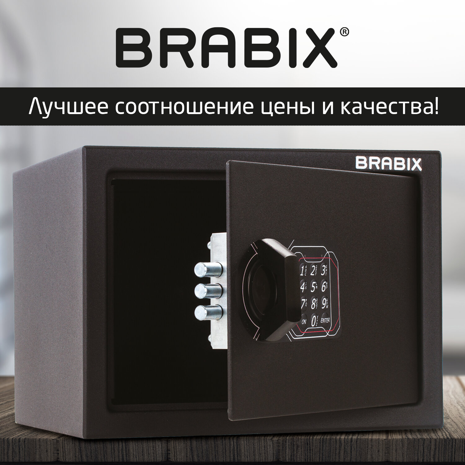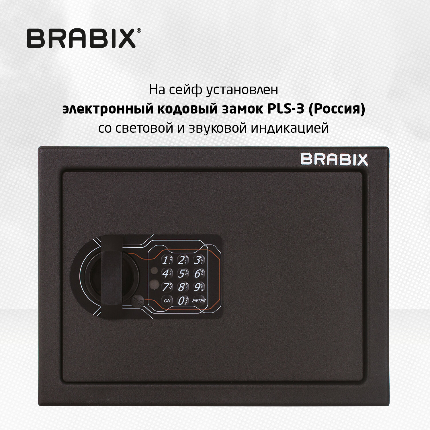 Сейф изготовлен из стали. Лицевая панель толщиной — 2,8 мм, боковые — 1,2 мм.На сейф установлен электронный кодовый замок PLS-3 (Россия) со световой и звуковой индикацией, позволяющий запрограммировать свой уникальный код (от 4 до 8 знаков). В комплект входит аварийный мастер-ключ на случай, если забыли код или вышли из строя элементы питания. Подробная инструкция по эксплуатации замка в комплекте. Изделие имеет ригельную систему запирания, диаметр ригелей до 20 мм. Окраска — стойкое полимерное порошковое покрытие, защищающее от царапин и ржавчин. Конструкция мебельного сейфа BRABIX «SF» предусматривает возможность установки и крепления сейфа внутри мебели, а также анкерное крепление к стене.Продукция марки BRABIX выделяется лучшим соотношением цены и качества.