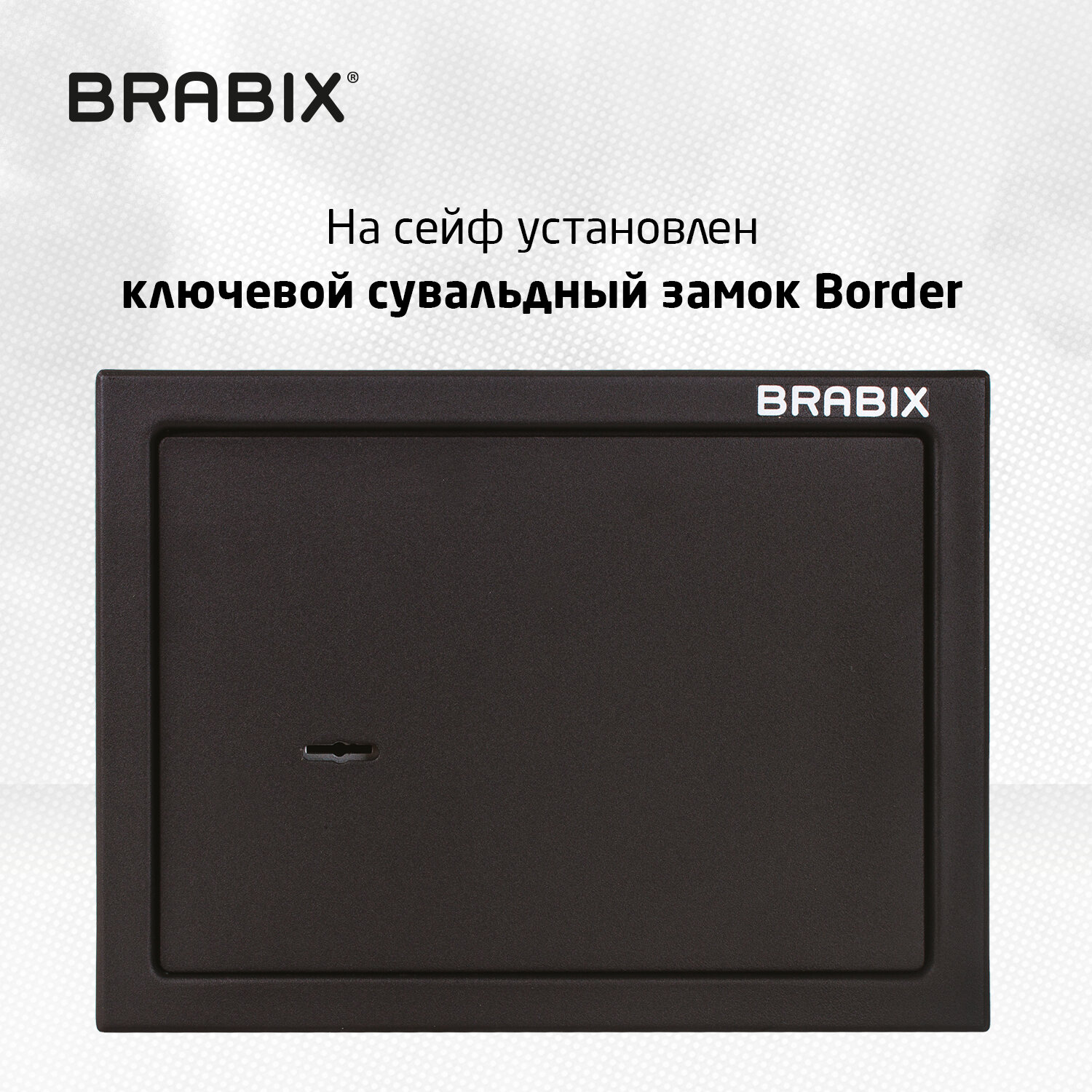 Сейф изготовлен из стали. Лицевая панель толщиной — 2,8 мм, боковые — 1,2 мм.На сейф установлен ключевой сувальдный замок Border. Изделие имеет ригельную систему запирания, диаметр ригелей до 20 мм. Окраска — стойкое полимерное порошковое покрытие, защищающее от царапин и ржавчин. Конструкция мебельного сейфа BRABIX «SF» предусматривает возможность установки и крепления сейфа внутри мебели, а также анкерное крепление к стене.Продукция марки BRABIX выделяется лучшим соотношением цены и качества.