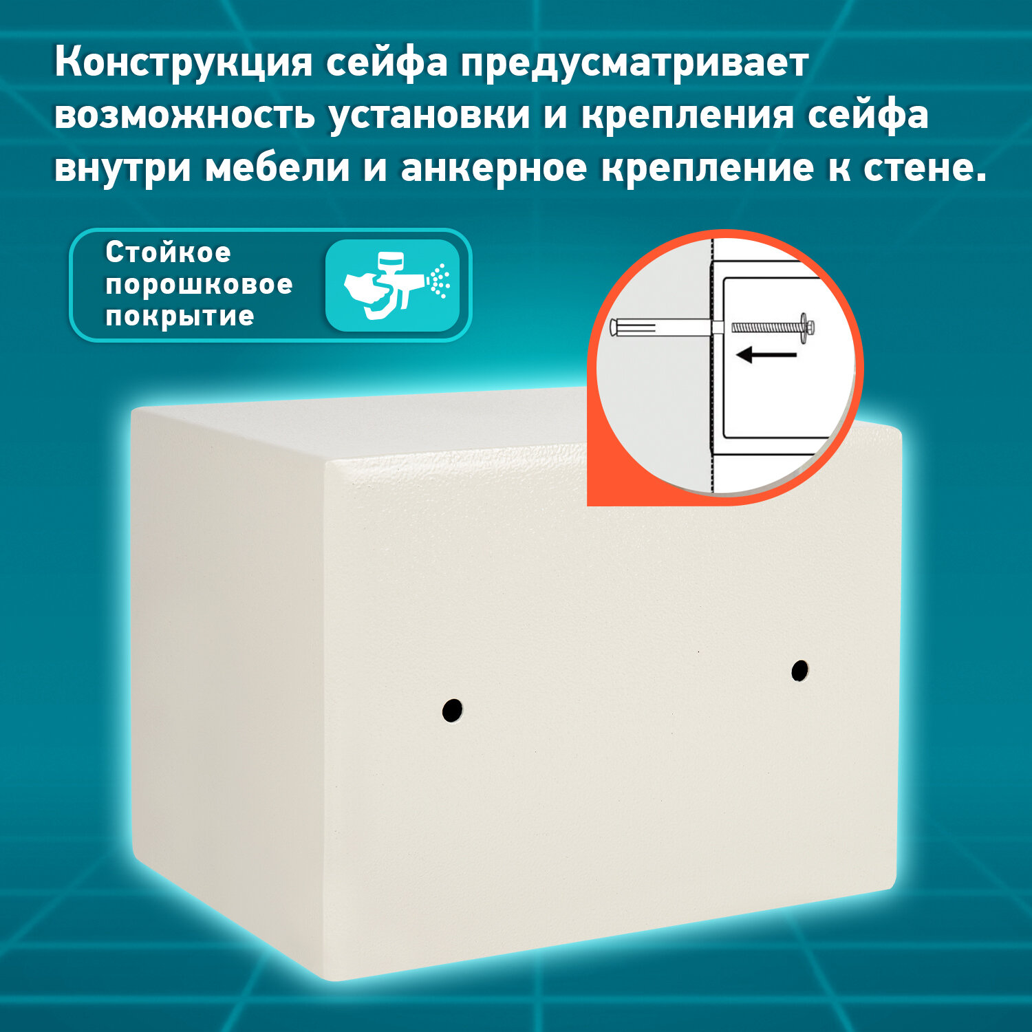 Сейф изготовлен из стали. Лицевая панель толщиной 3 мм, боковые — 1,5 мм.На сейф установлен электронный кодовый замок со световой и звуковой индикацией, позволяющий запрограммировать свой уникальный код (от 4 до 8 знаков). В комплект входит аварийный мастер-ключ на случай, если забыли код или вышли из строя элементы питания. Подробная инструкция по эксплуатации замка в комплекте. Изделие имеет ригельную систему запирания, диаметр ригелей — до 16 мм. Окраска — стойкое полимерное порошковое покрытие, защищающее от царапин и ржавчины. Конструкция мебельного сейфа DASWERK «SС» предусматривает возможность установки и крепления сейфа внутри мебели, а также анкерное крепление к стене.