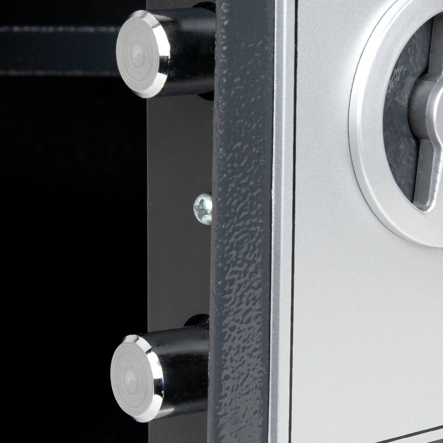 Сейф изготовлен из стали. Лицевая панель толщиной 3 мм, боковые – 1,5 мм.На сейф установлен электронный кодовый замок со световой и звуковой индикацией, позволяющий запрограммировать свой уникальный код (от 4 до 8 знаков). В комплект входит аварийный мастер-ключ на случай, если забыли код или вышли из строя элементы питания. Подробная инструкция по эксплуатации замка в комплекте. Изделие имеет ригельную систему запирания, диаметр ригелей – 16 мм. Окраска – стойкое полимерное порошковое покрытие, защищающее от царапин и ржавчины. Конструкция мебельного сейфа DASWERK «SС» предусматривает возможность установки и крепления сейфа внутри мебели, а также анкерное крепление к стене.