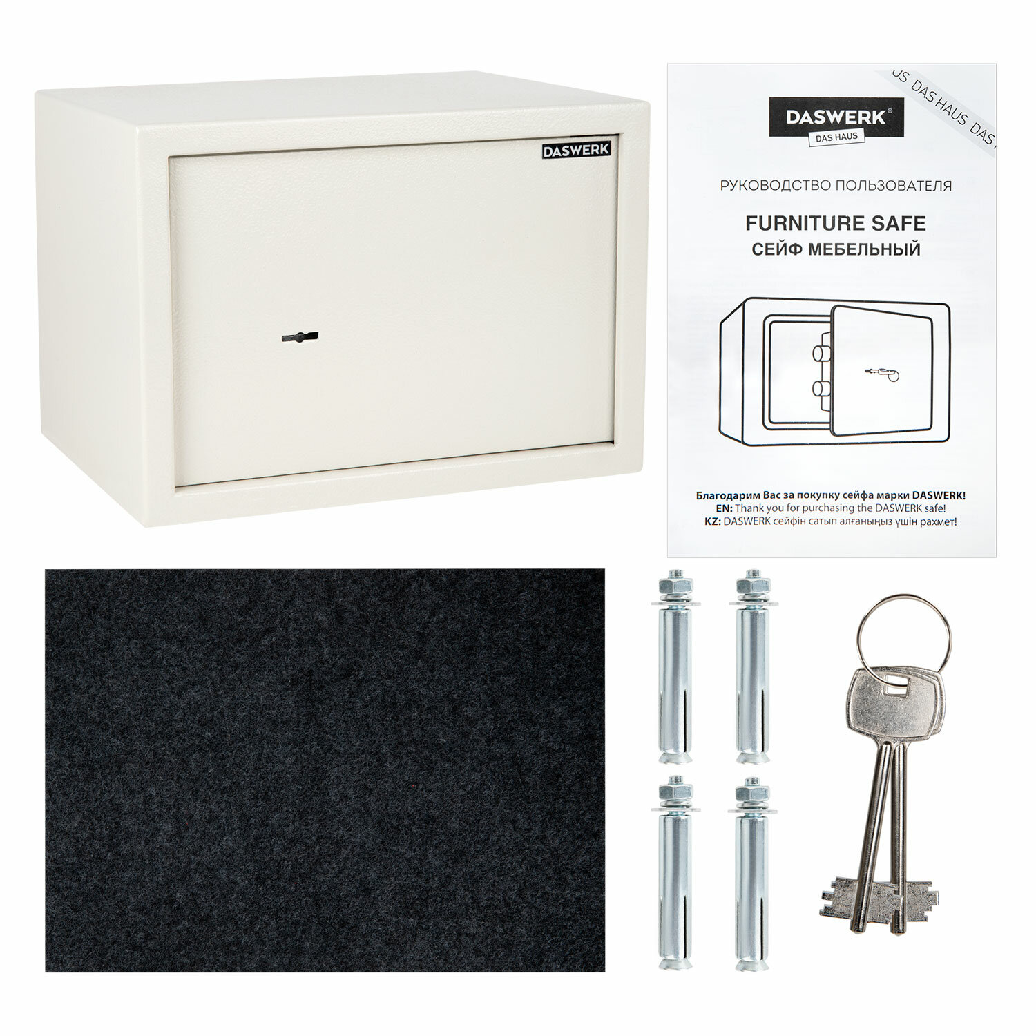 Сейф изготовлен из стали. Лицевая панель толщиной 3 мм, боковые — 1,5 мм.На сейф установлен ключевой замок.Изделие имеет ригельную систему запирания, диаметр ригелей — до 16 мм. Окраска — стойкое полимерное порошковое покрытие, защищающее от царапин и ржавчины. Конструкция мебельного сейфа DASWERK «SС» предусматривает возможность установки и крепления сейфа внутри мебели, а также анкерное крепление к стене.