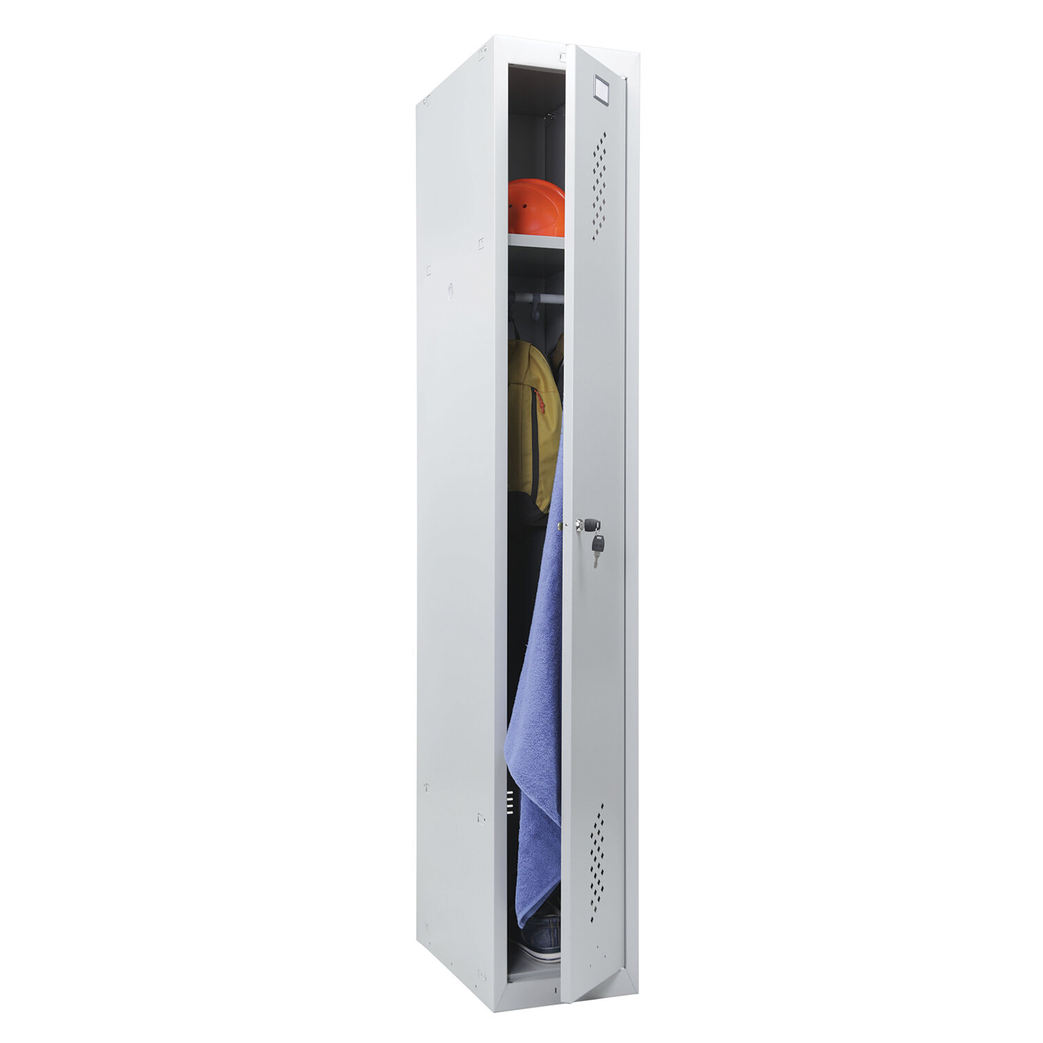 Жесткий корпус шкафа усилен сварной рамой, что обеспечивает устойчивость конструкции и длительный срок эксплуатации. На двери установлен ключевой замок (2000 комбинаций). В комплекте 2 ключа.Дверь и задняя стенка имеют вентиляционные отверстия.Сборку шкафа можно осуществлять 2 способами: на зацепах или с помощью саморезов, крепеж присутствует в комплекте. Есть возможность установки двери с левой или правой стороной открывания. Конструкция шкафов позволяет скреплять их между собой. При этом есть возможность наращивать секции в ряд за счет общей боковой стенки. Все модели шкафов BRABIX LK совместимы.В комплект входят: полка, перекладина, крючки.Шкаф поставляется в разобранном виде.Продукция марки Brabix выделяется лучшим соотношением цены и качества.