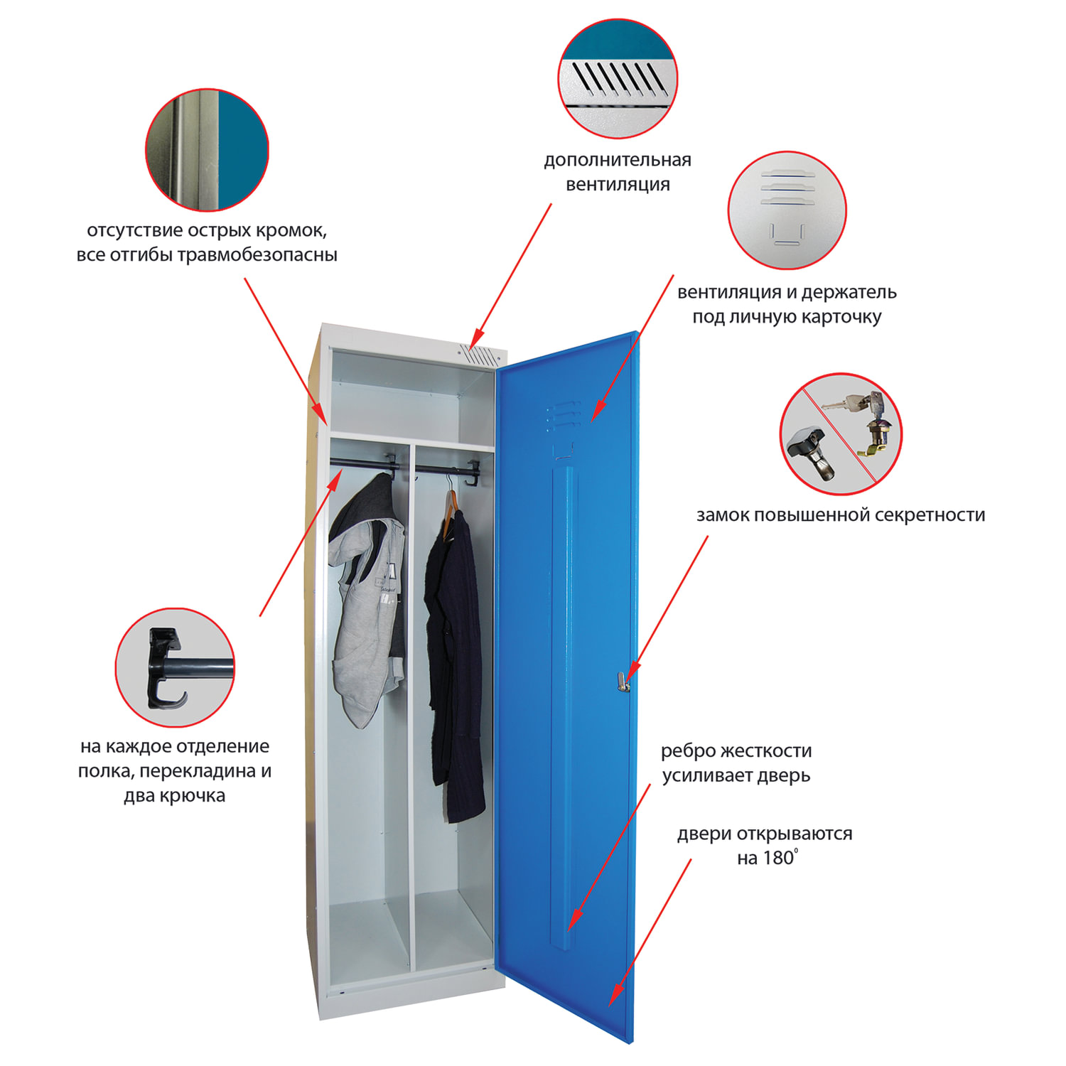 2 отделения за 1 дверью.Ключевой замок повышенной секретности.Цельносварная лицевая панель обеспечивает абсолютную жёсткость всей конструкции.Полка для головных уборов.Штанги для плечиков, крючки в комплекте.Вентиляционные отверстия в корпусе и двери.Держатель под личную карточку.Два вида крепежа в комплекте: саморезы и заклепки.Угол открывания двери 110°.Поставляется в разобранном виде.