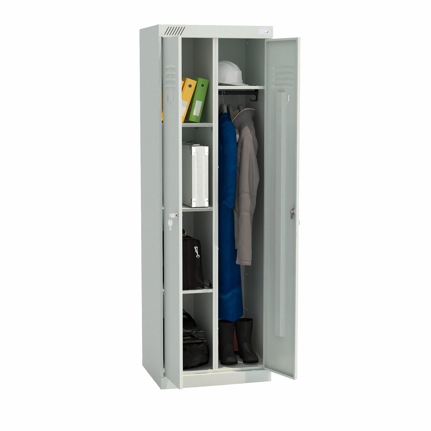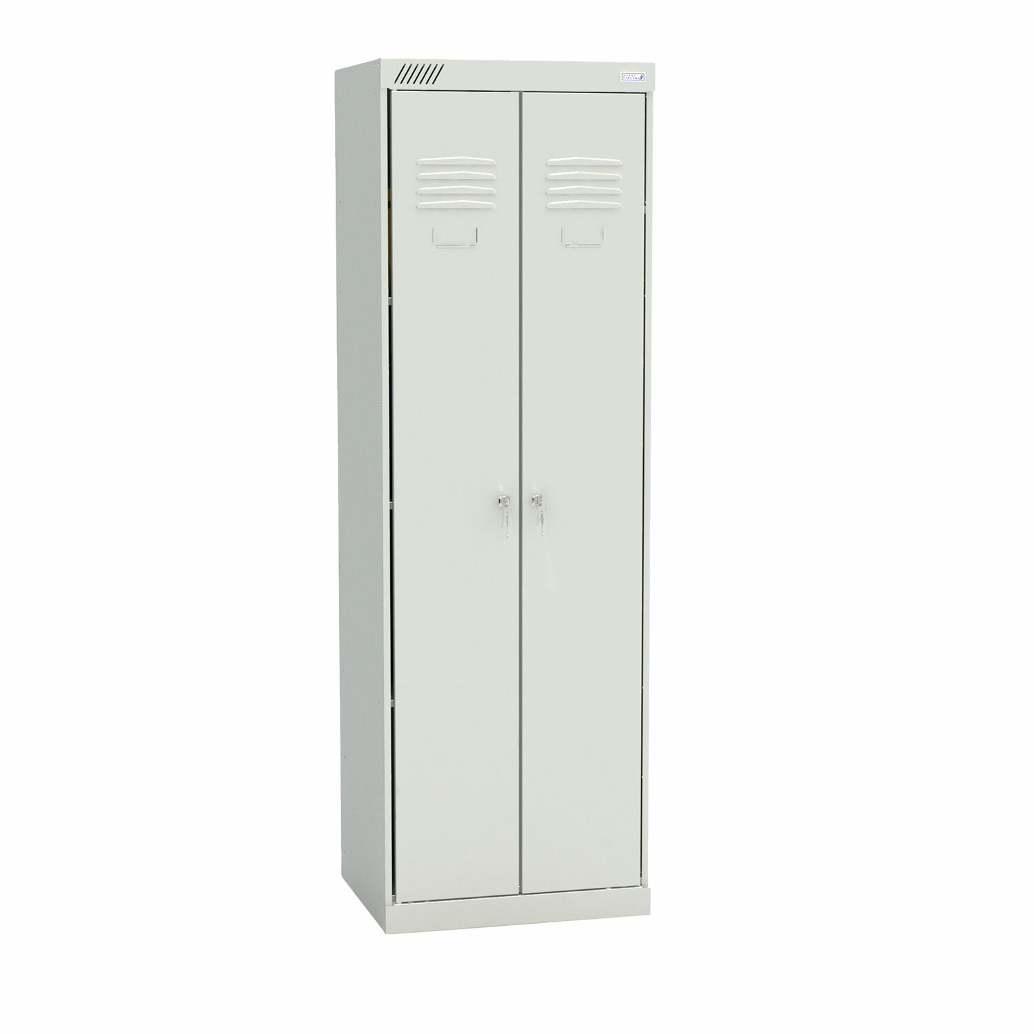 2 раздельные секции, 2 двери.2 ключевых замка повышенной секретности, две пары ключей.Цельносварная лицевая панель с травмобезопасными гибами обеспечивает абсолютную жёсткость всей конструкции.Полка для головных уборов.Штанга для плечиков, 2 крючка в комплекте.3 регулируемые полки.Вентиляционные отверстия в корпусе и двери.Держатель под личную карточку на дверях.Угол открывания двери – 110°.Собирается при помощи металлических заклепок.Поставляется в разобранном виде.