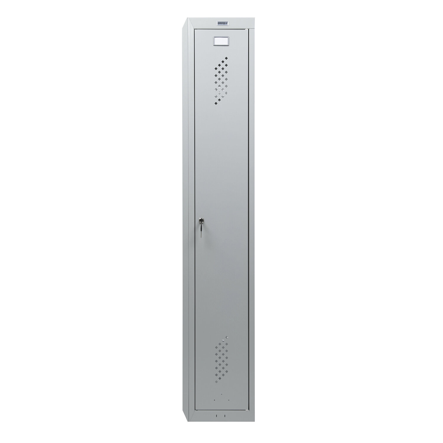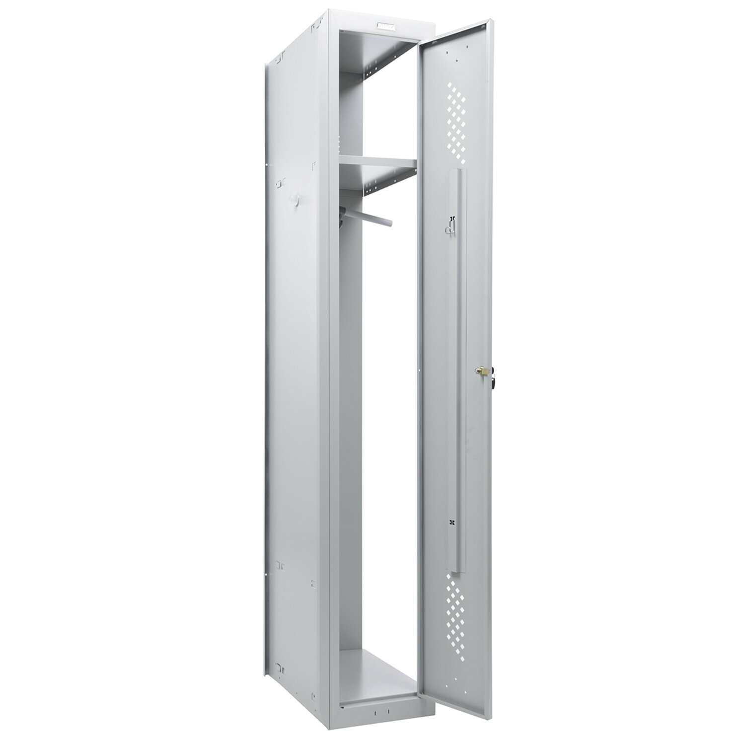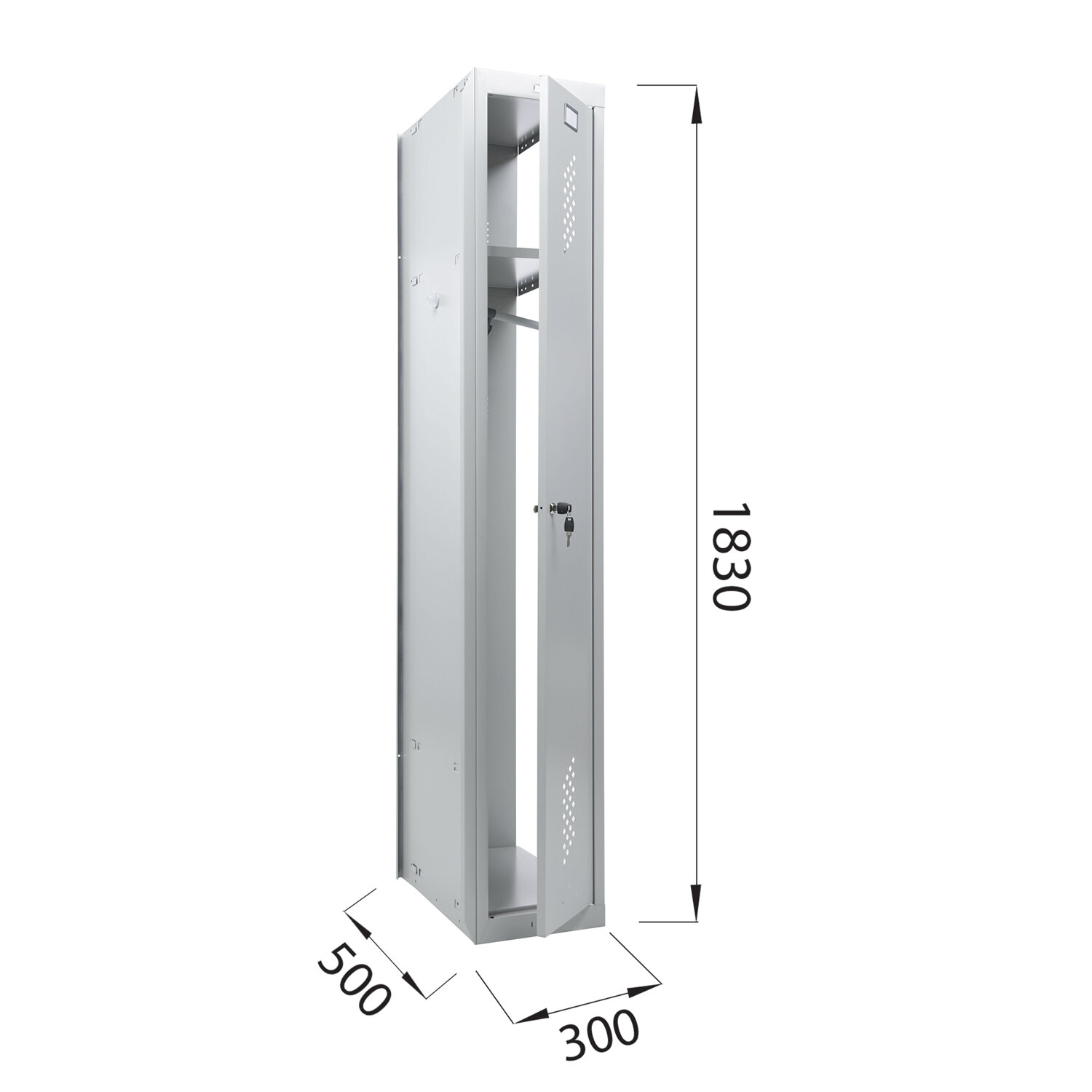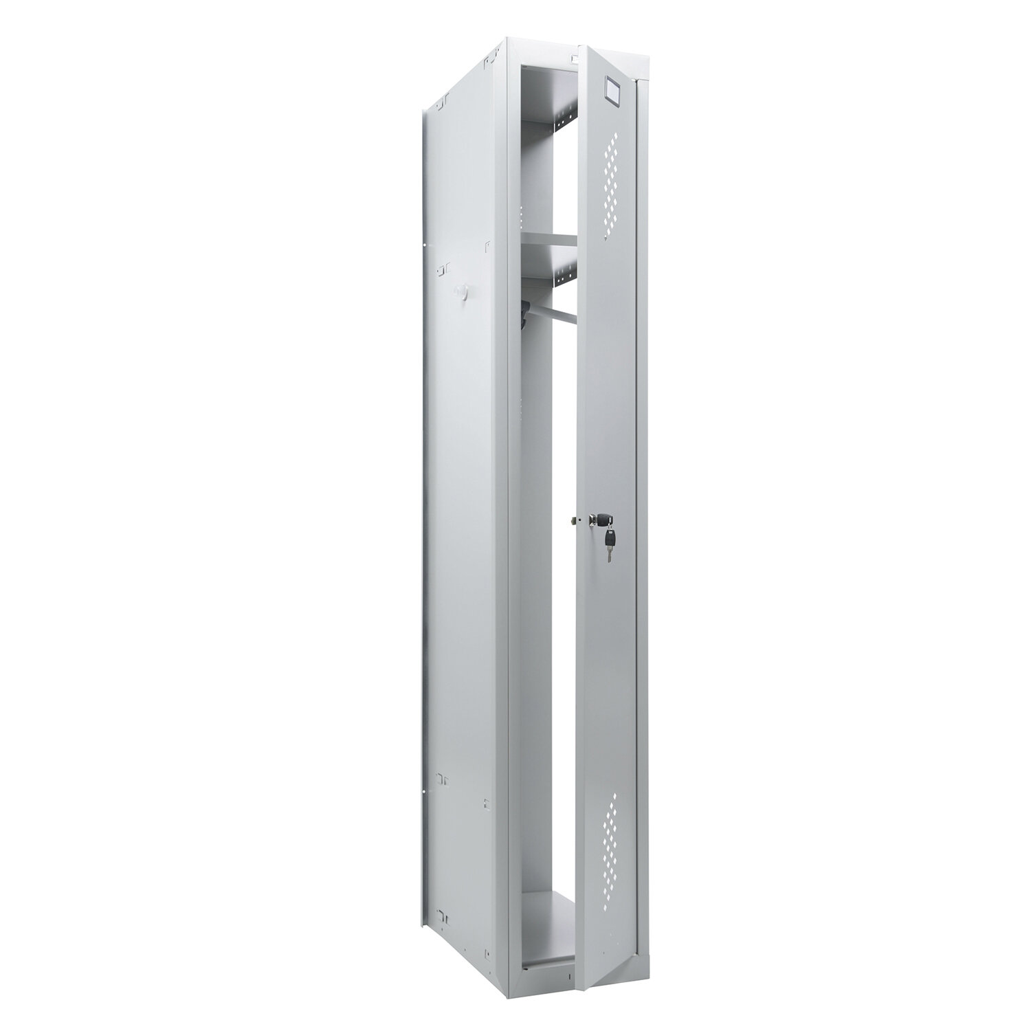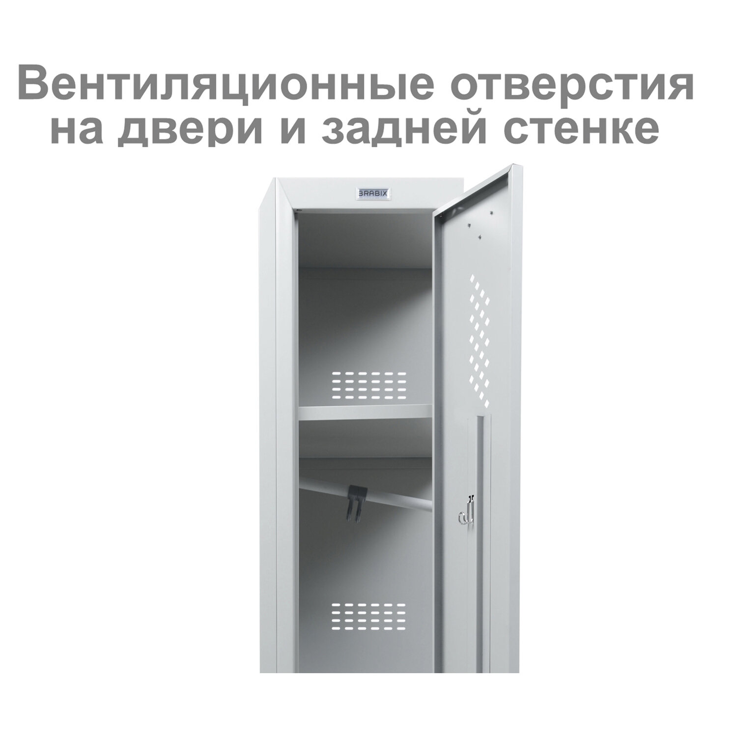 Жесткий корпус шкафа усилен сварной рамой, что обеспечивает устойчивость конструкции и длительный срок эксплуатации. На двери установлен ключевой замок (2000 комбинаций). В комплекте 2 ключа.Дверь и задняя стенка имеют вентиляционные отверстия.Сборку шкафа можно осуществлять 2 способами: на зацепах или с помощью саморезов, крепеж присутствует в комплекте. Есть возможность установки двери с левой или правой стороной открывания. Конструкция шкафов позволяет скреплять их между собой. В комплект входят: полка, перекладина, крючки.Шкаф поставляется в разобранном виде.Продукция марки Brabix выделяется лучшим соотношением цены и качества.