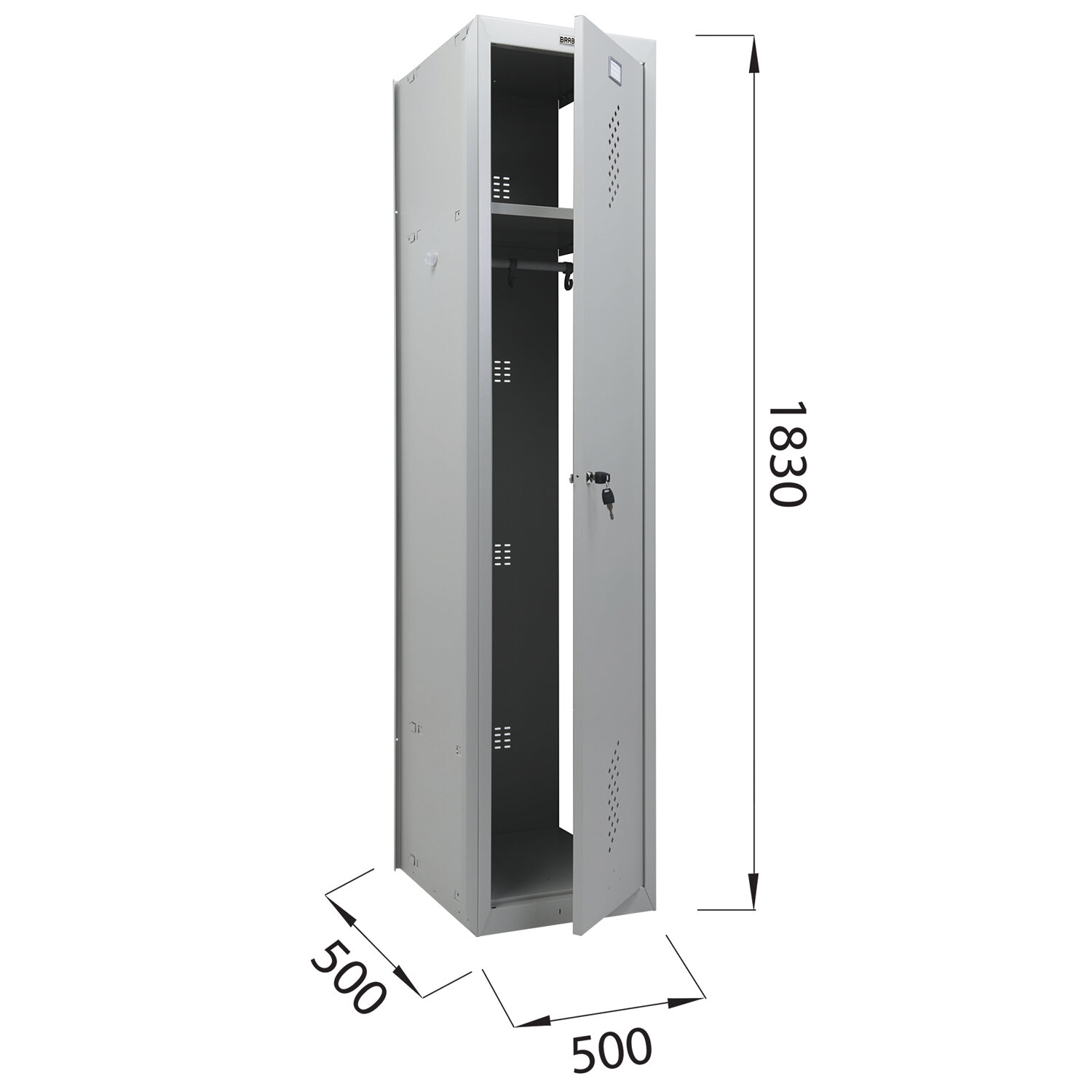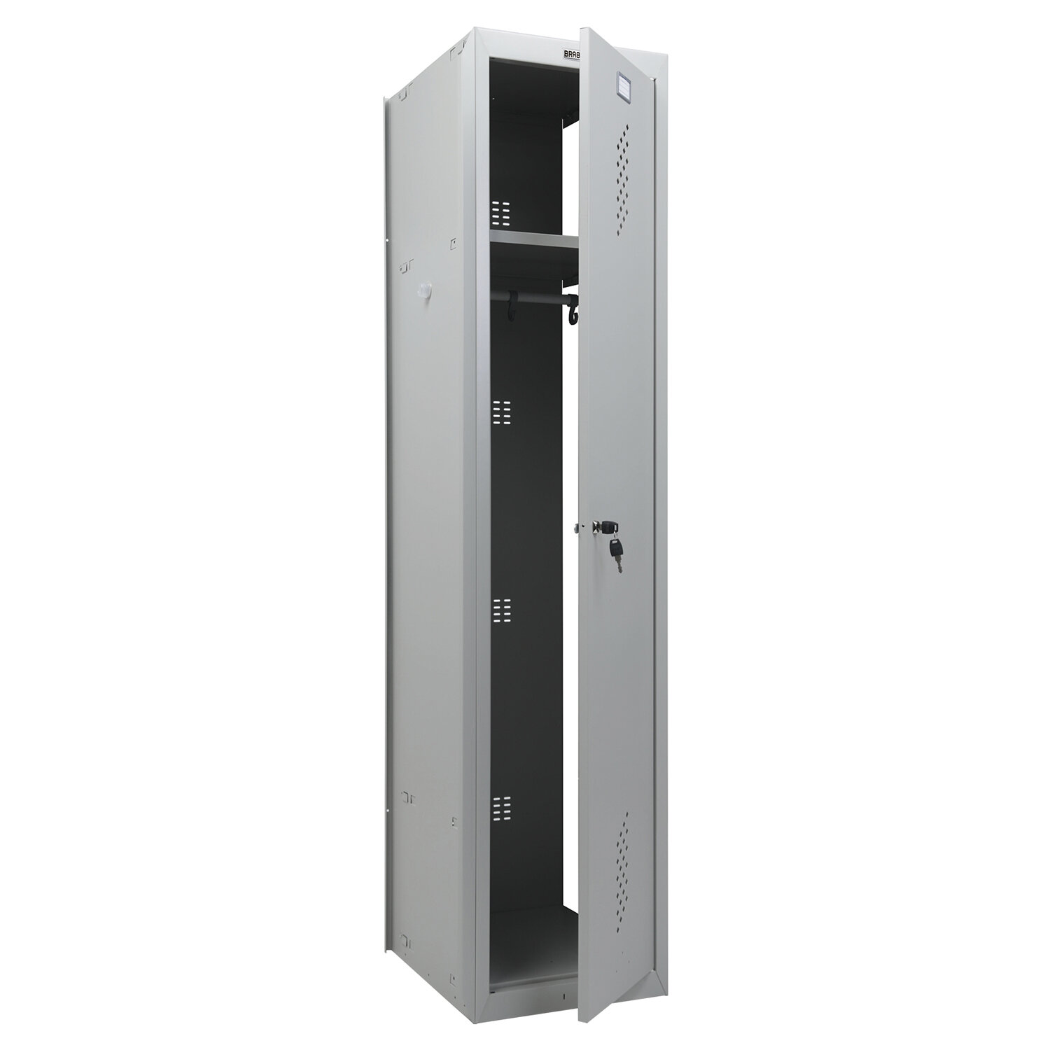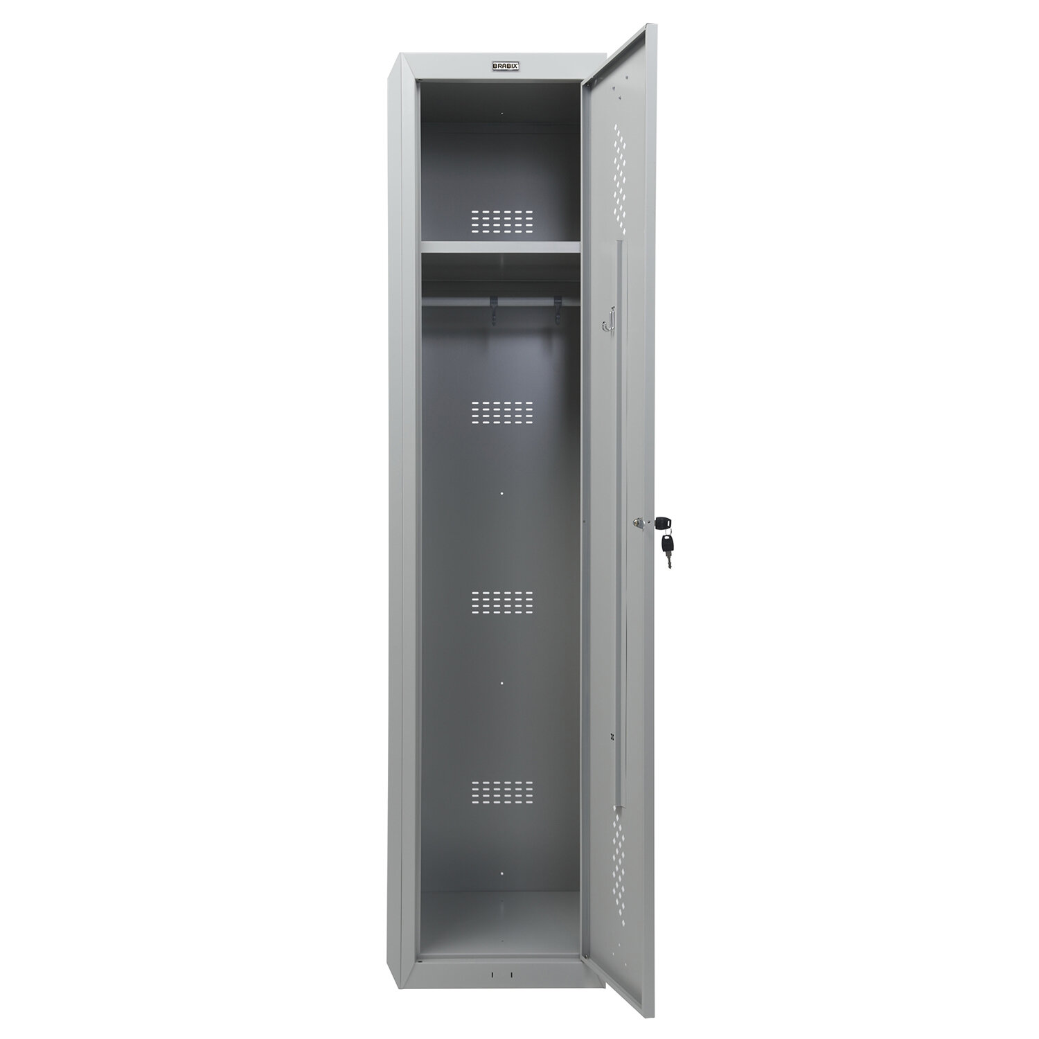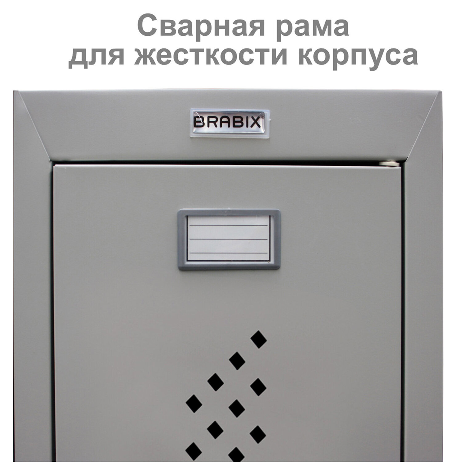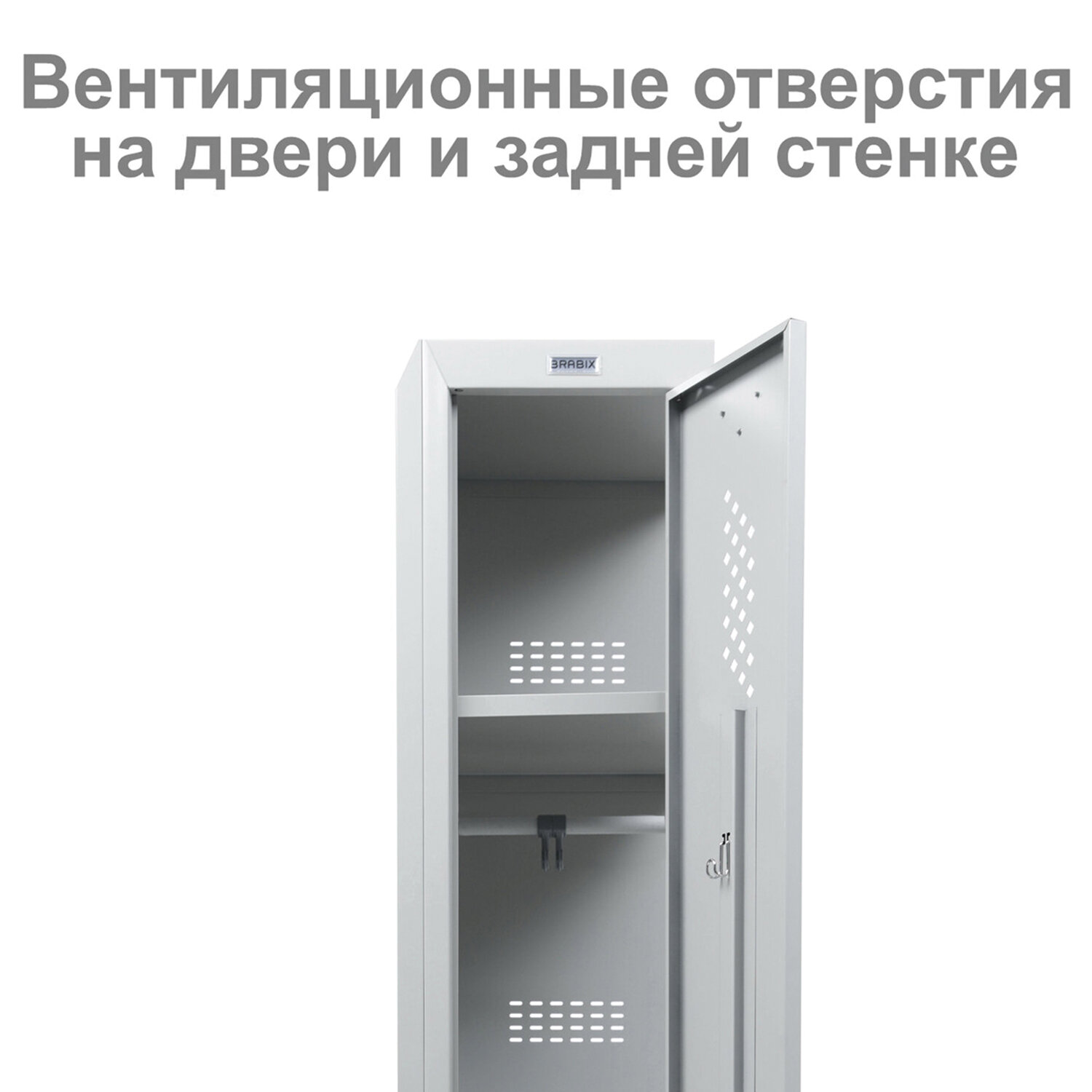 Жесткий корпус шкафа усилен сварной рамой, что обеспечивает устойчивость конструкции и длительный срок эксплуатации. На двери установлен ключевой замок (2000 комбинаций). В комплекте 2 ключа.Дверь и задняя стенка имеют вентиляционные отверстия.Сборку шкафа можно осуществлять 2 способами: на зацепах или с помощью саморезов, крепеж присутствует в комплекте. Есть возможность установки двери с левой или правой стороной открывания. Конструкция шкафов позволяет скреплять их между собой. В комплект входят: полка, перекладина, крючки.Шкаф поставляется в разобранном виде.Продукция марки Brabix выделяется лучшим соотношением цены и качества.