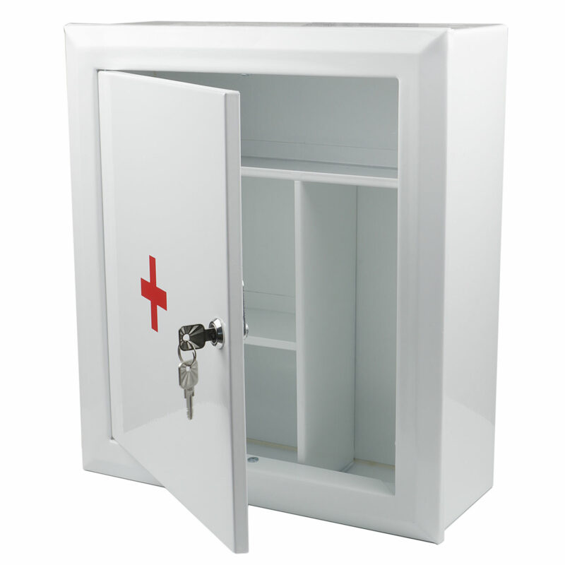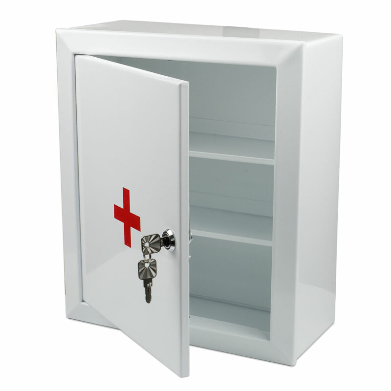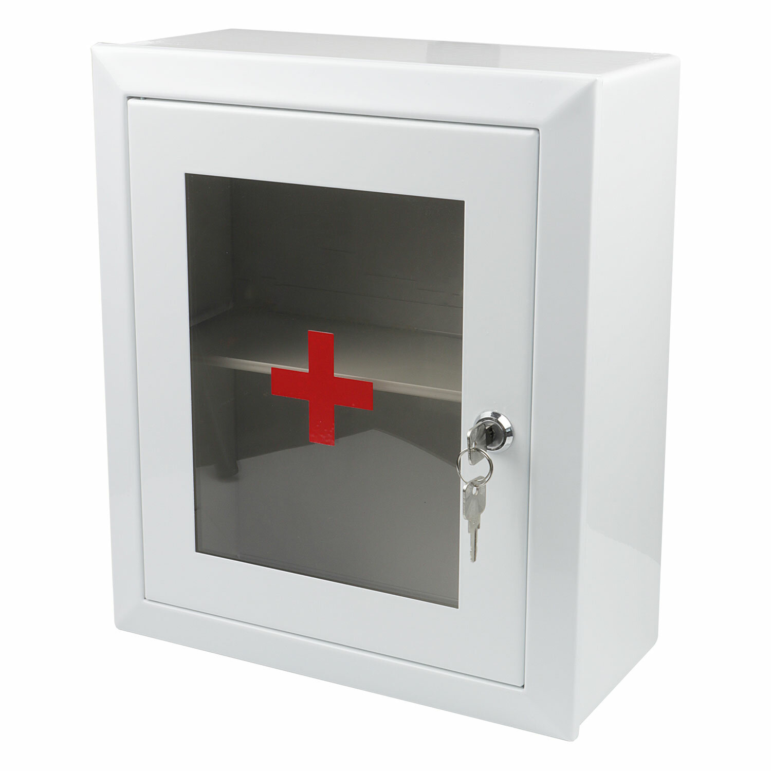 Металлический аптечный шкаф со стеклом. Классический внешний вид, надежная конструкция. Предусмотрено крепление на стене, закрывается на замок.
