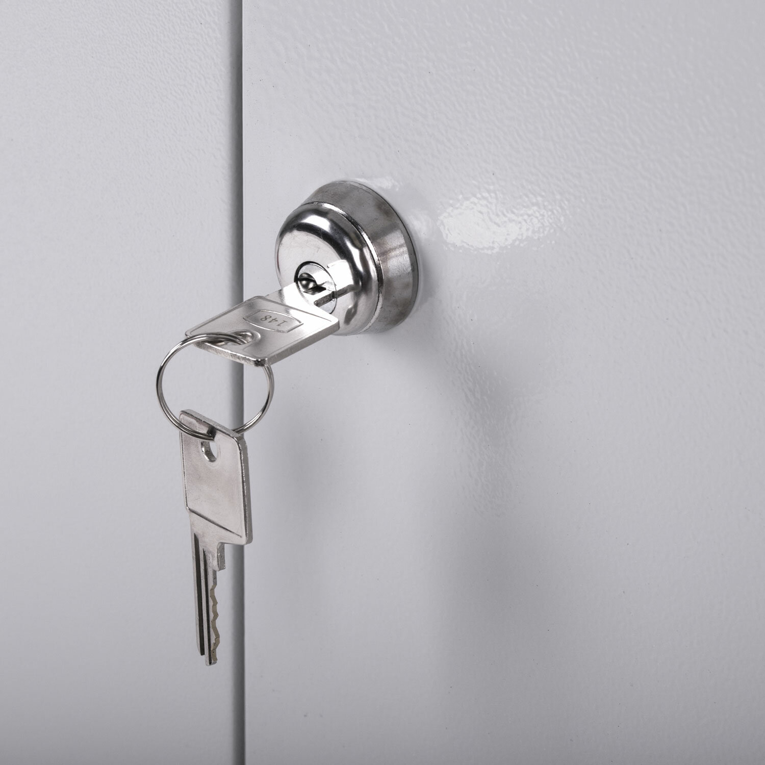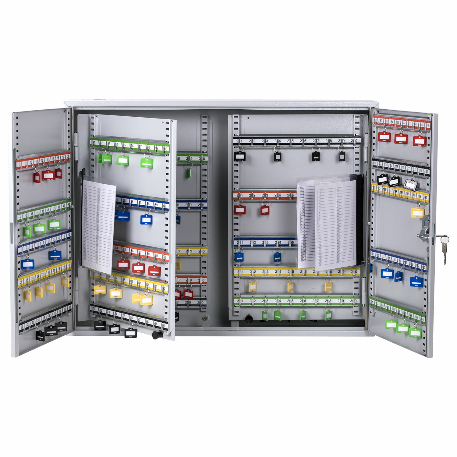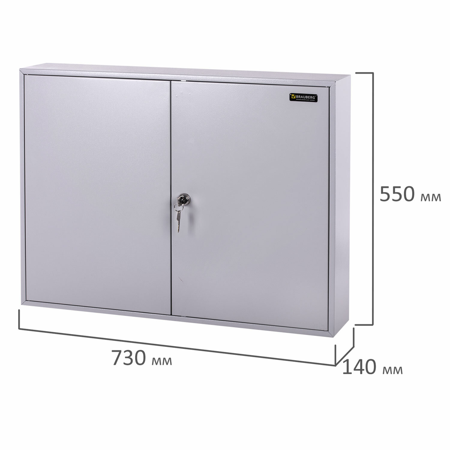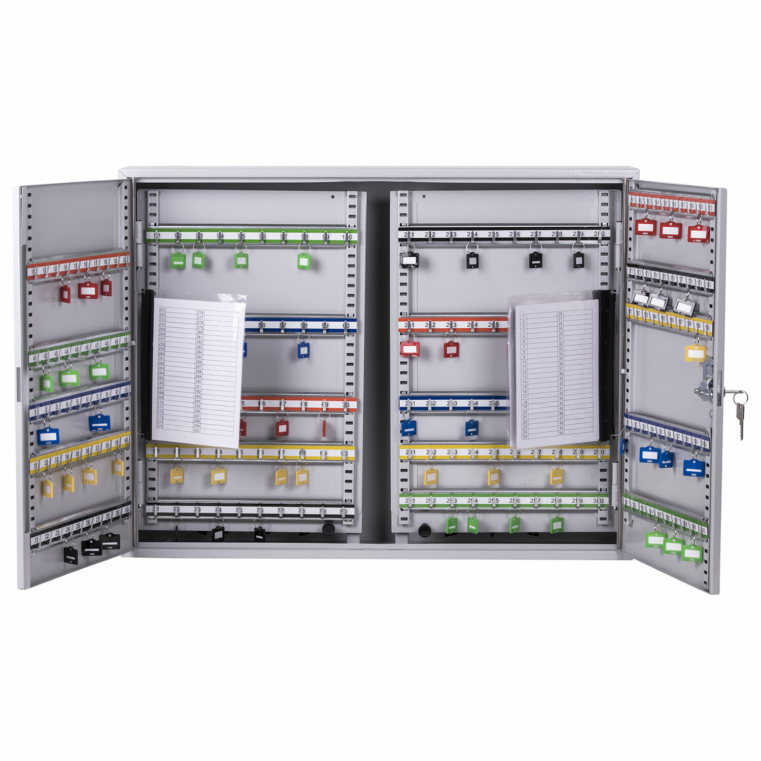 Изготовлен из прочной стали толщиной 0,8 мм и оснащен надёжным замком. Вмещает 300 ключей. Для размещения каждого ключа в шкафчике предусмотрен брелок с ярлычком. Размер — 730х550х140 мм. В комплекте: — 2 ключа от дверцы;- наклейки для нумерации крючков;- шурупы для крепления.