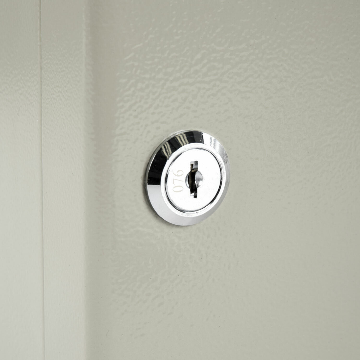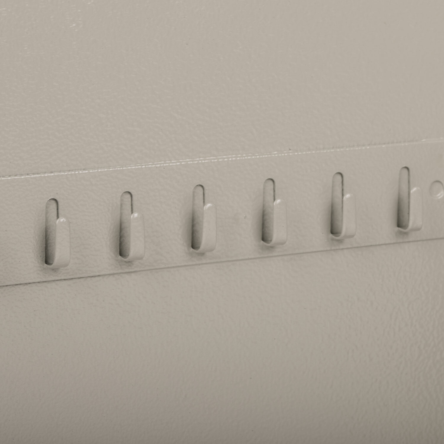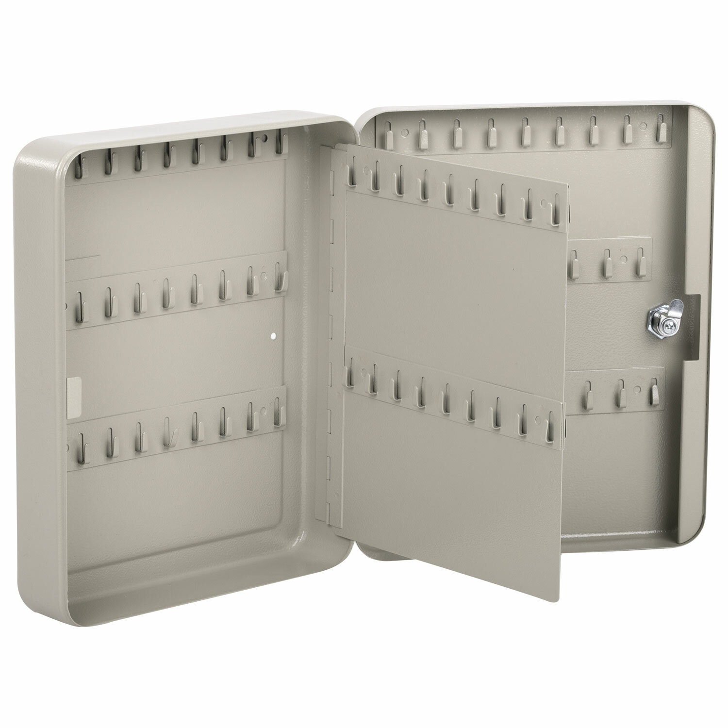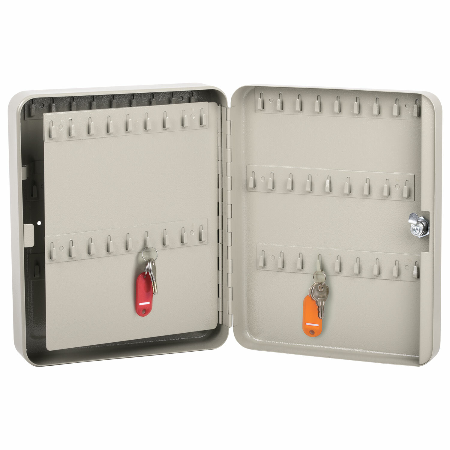 Изготовлен из прочной стали толщиной 0,8 мм и оснащен надёжным замком. Вмещает 90 ключей. Для размещения каждого ключа в шкафчике предусмотрен брелок с ярлычком. Размер — 300х240х80 мм. В комплекте: — 2 ключа от дверцы;- наклейки для нумерации крючков;- шурупы для крепления.