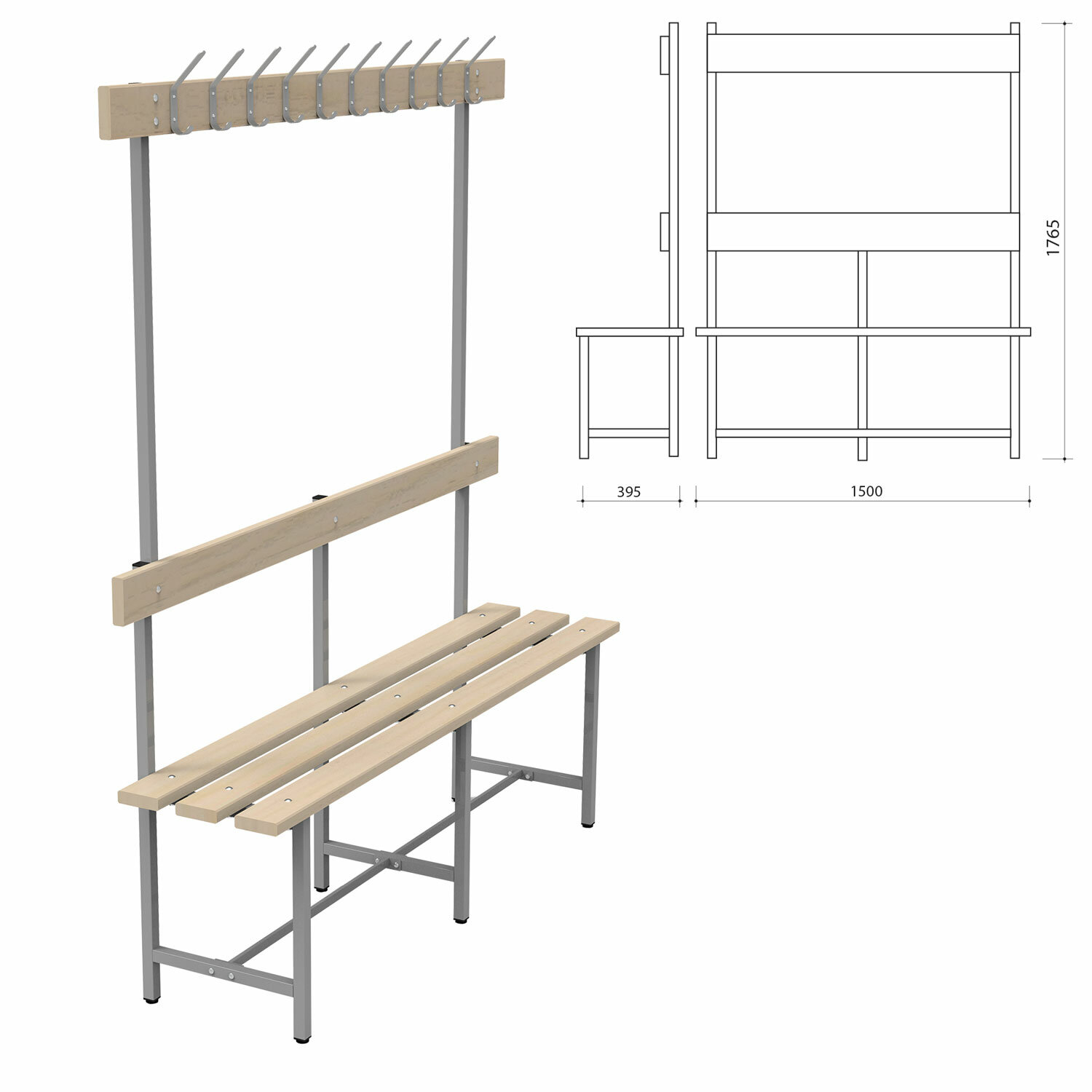 Скамья с вешалкой, спинкой «СВТ 5», 1765х1500х395 мм, 10 крючков, регулируемые опоры, каркас металлический серый, сиденье дерево