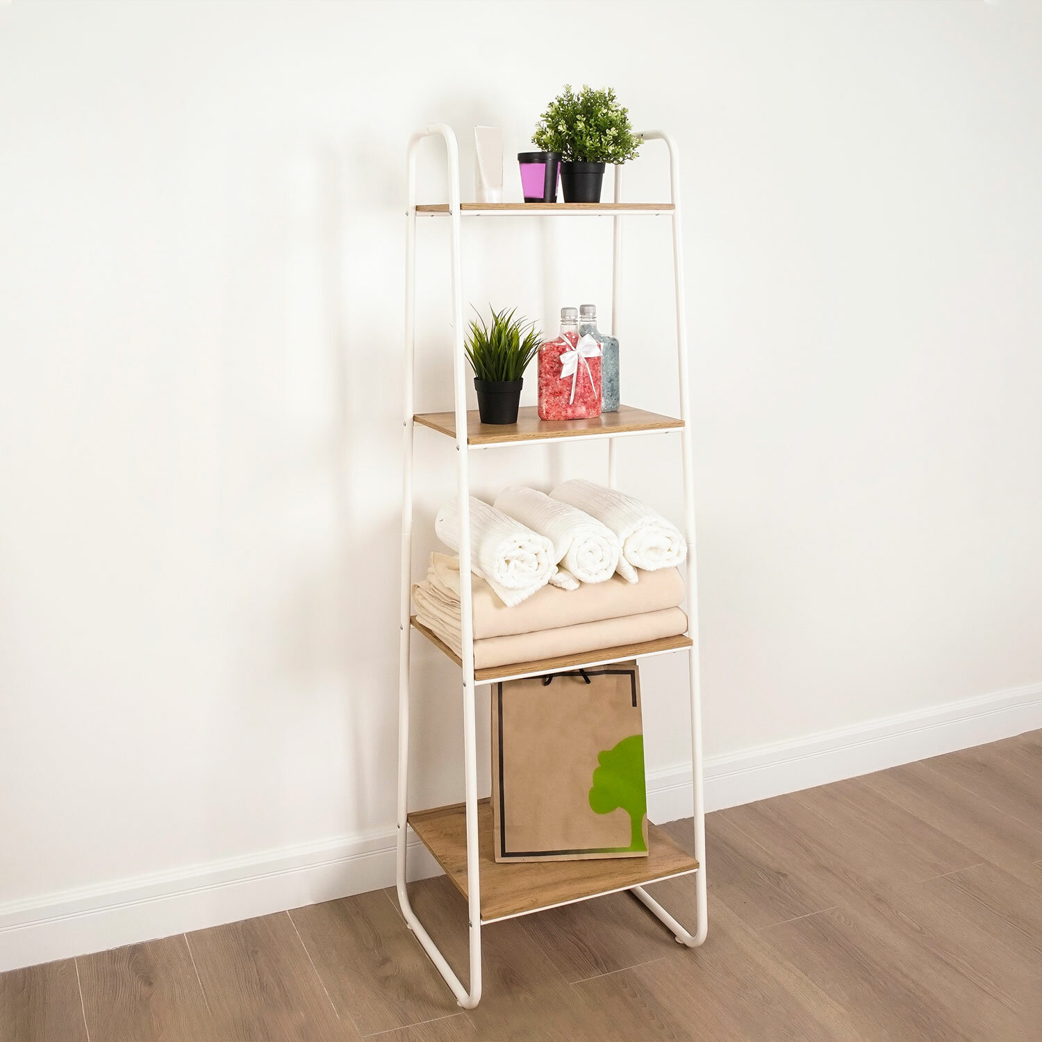Стеллаж выполнен из прочной металлической трубы диаметром 18 мм.Четыре прочные широкие полки из ЛДСП.Нагрузка на одну полку – до 10 кг.Один пластиковый декоративный крючок для мелочей.Предусмотрены войлочные подпятники, защищающие пол от повреждений.Изделие поставляется в разобранном виде в красочной картонной коробке с ручкой.Простая сборка согласно инструкции, шестигранный ключ для сборки в комплекте.