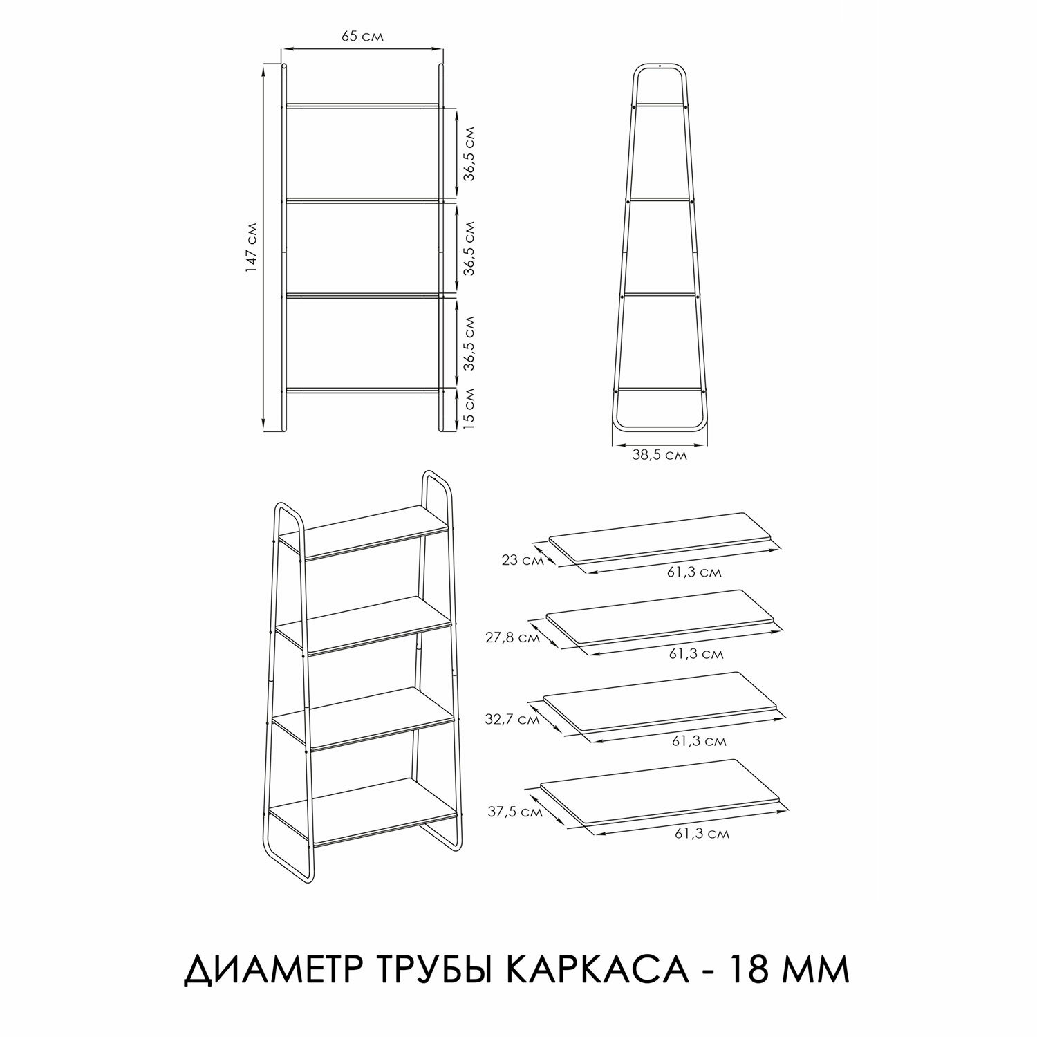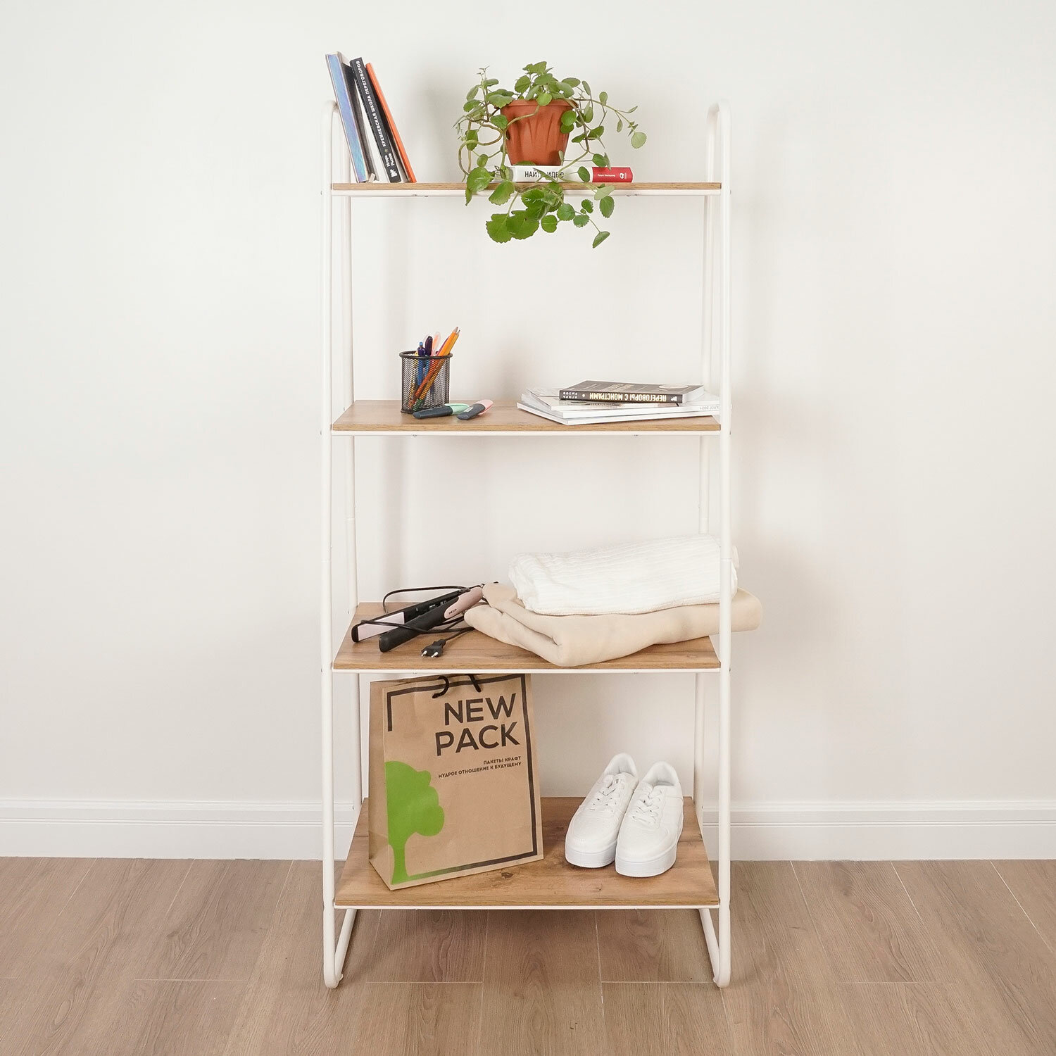 Стеллаж выполнен из прочной металлической трубы диаметром 18 мм.Четыре прочные широкие полки из ЛДСП.Нагрузка на одну полку – до 10 кг.Один пластиковый декоративный крючок для мелочей.Предусмотрены войлочные подпятники, защищающие пол от повреждений.Изделие поставляется в разобранном виде в красочной картонной коробке с ручкой.Простая сборка согласно инструкции, шестигранный ключ для сборки в комплекте.