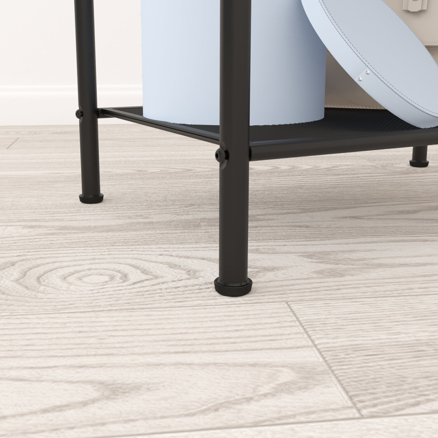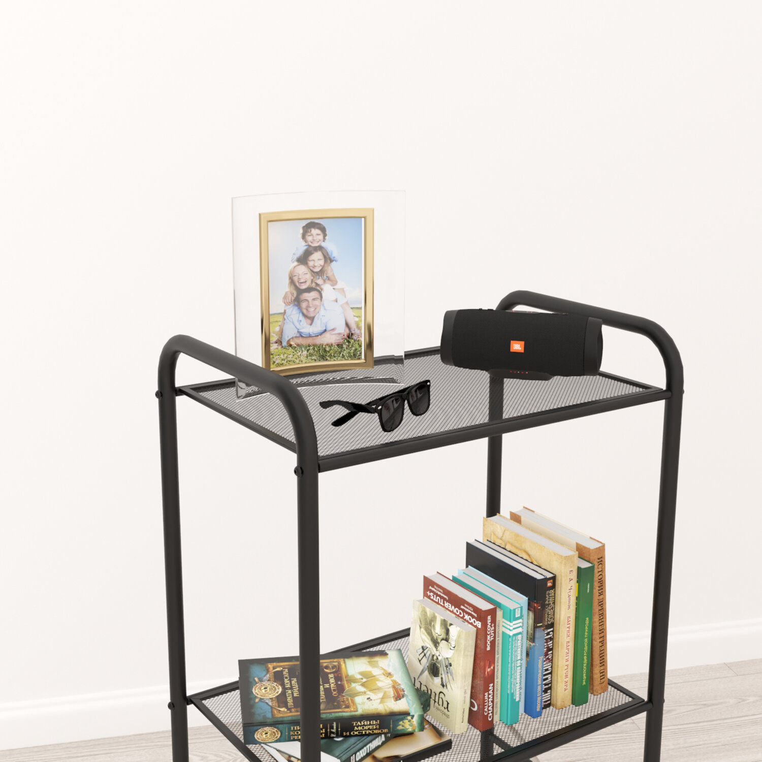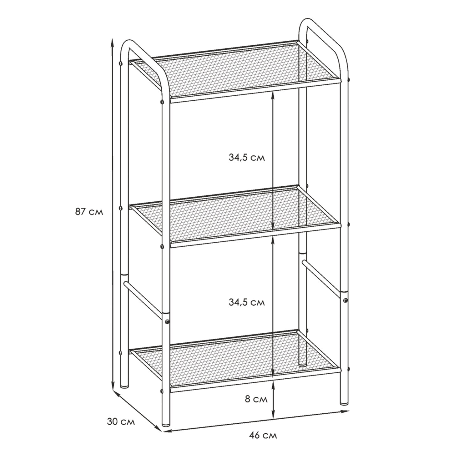 Стеллаж выполнен из прочной металлической трубы 16 мм и стального листа в мелкую сетку.Три прочные широкие металлические полки.Нагрузка на одну полку – до 8 кг.Два пластиковых декоративных крючка для мелочей.На ножках предусмотрены пластиковые регулируемые опоры.Изделие поставляется в разобранном виде в картонной красочной коробке с ручкой.Простая сборка согласно инструкции, шестигранный ключ для сборки в комплекте.