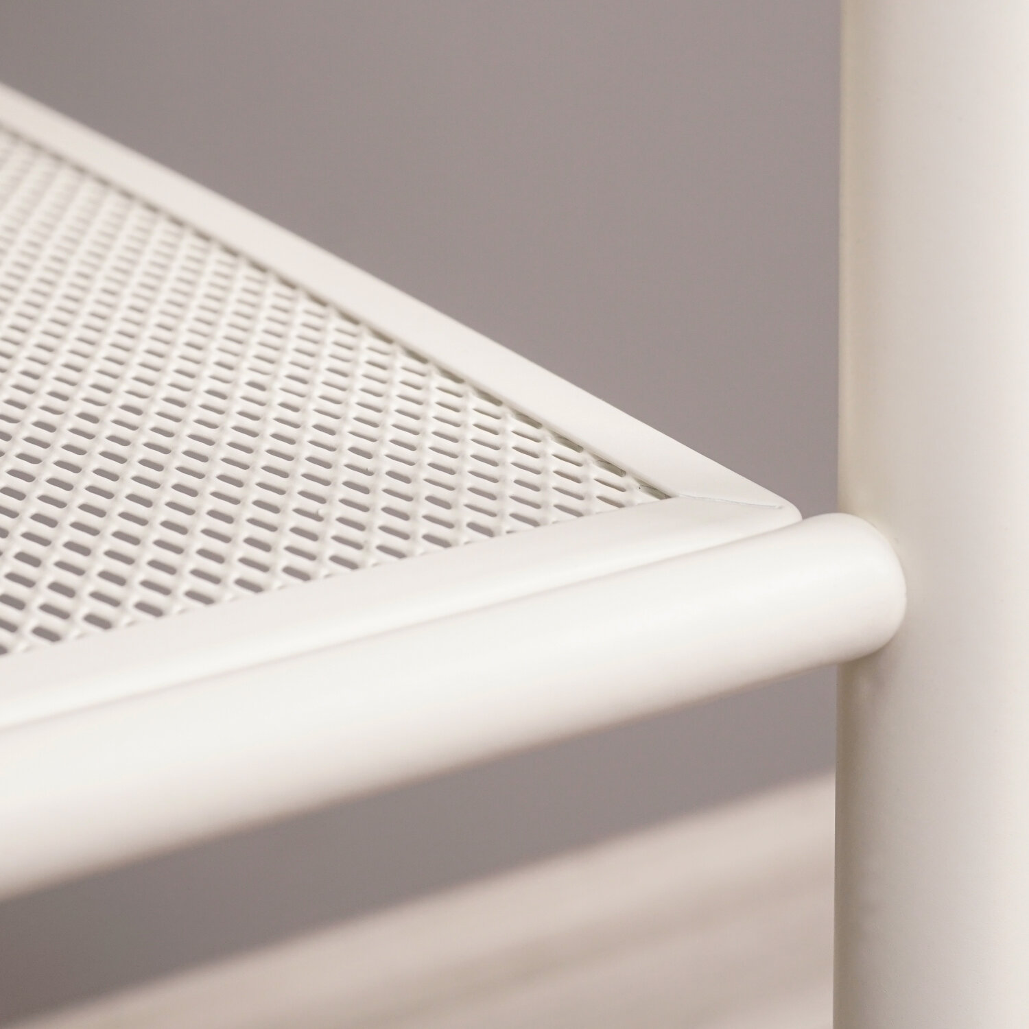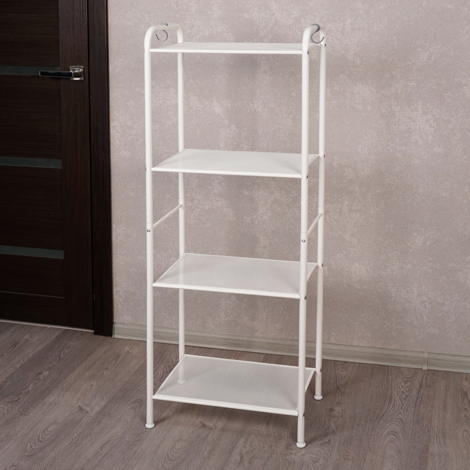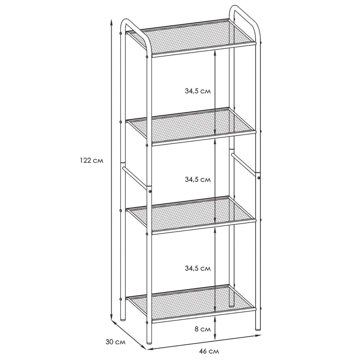 Стеллаж выполнен из прочной металлической трубы 16 мм и стального листа в мелкую сетку.Четыре прочные широкие металлические полки.Нагрузка на одну полку – до 8 кг.Два пластиковых декоративных крючка для мелочей.На ножках предусмотрены пластиковые регулируемые опоры.Изделие поставляется в разобранном виде в картонной красочной коробке с ручкой.Простая сборка согласно инструкции, шестигранный ключ для сборки в комплекте.