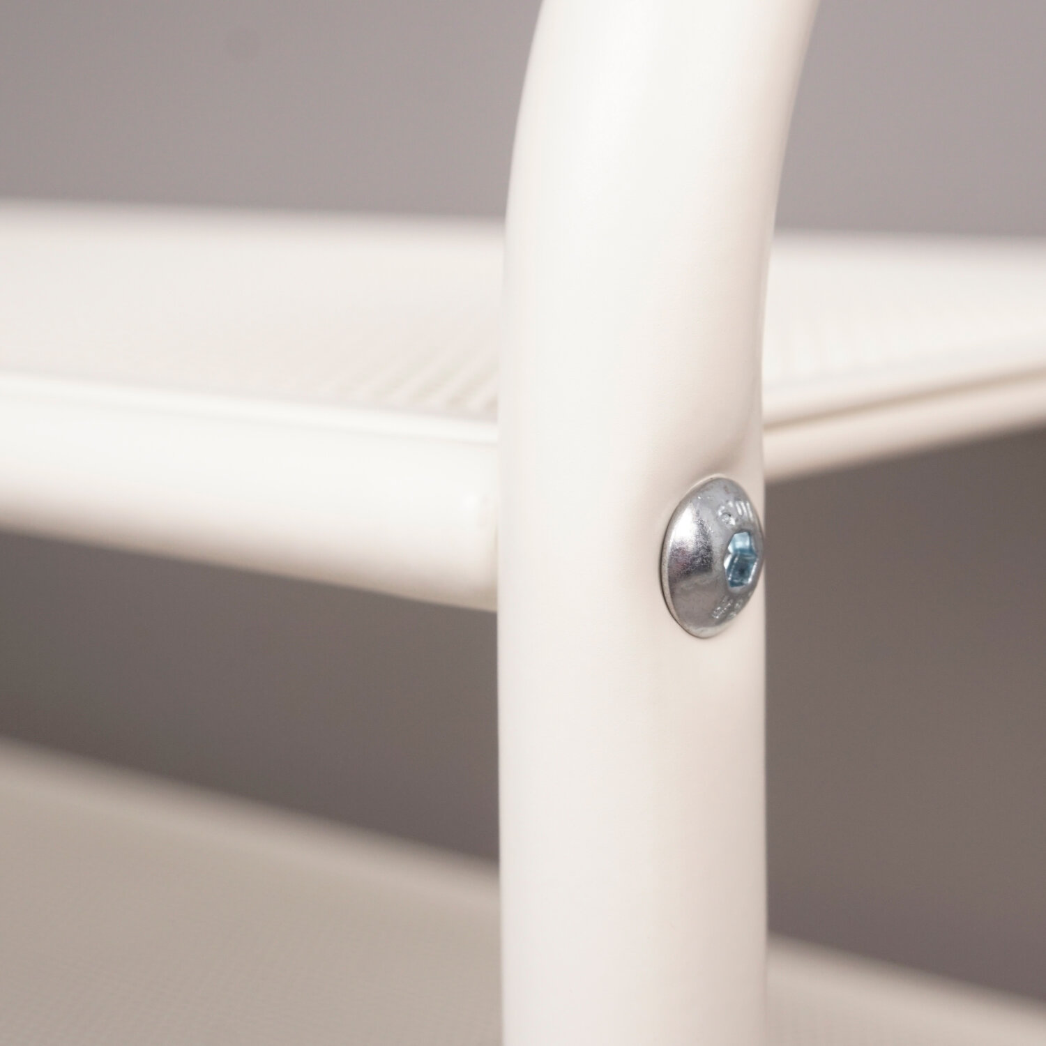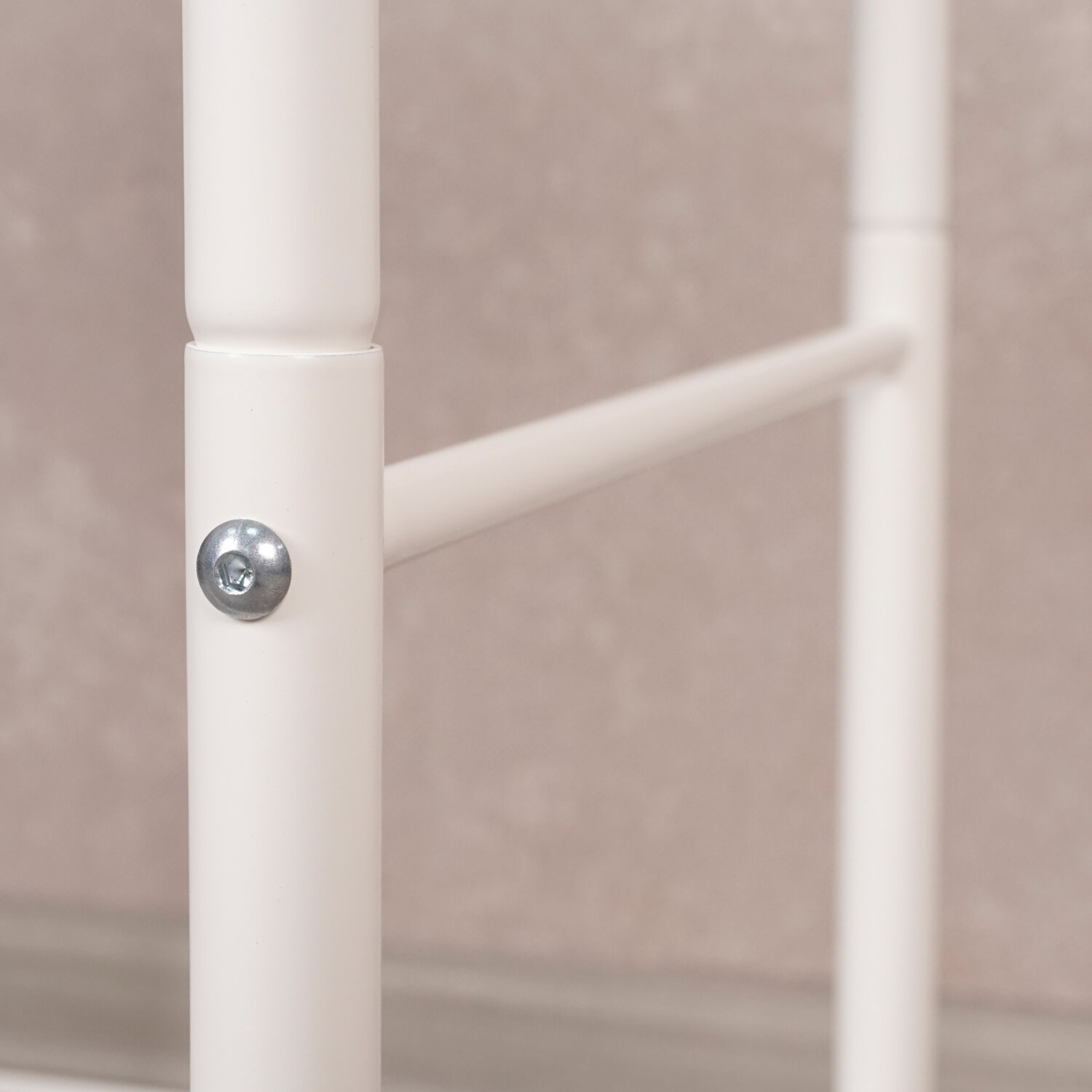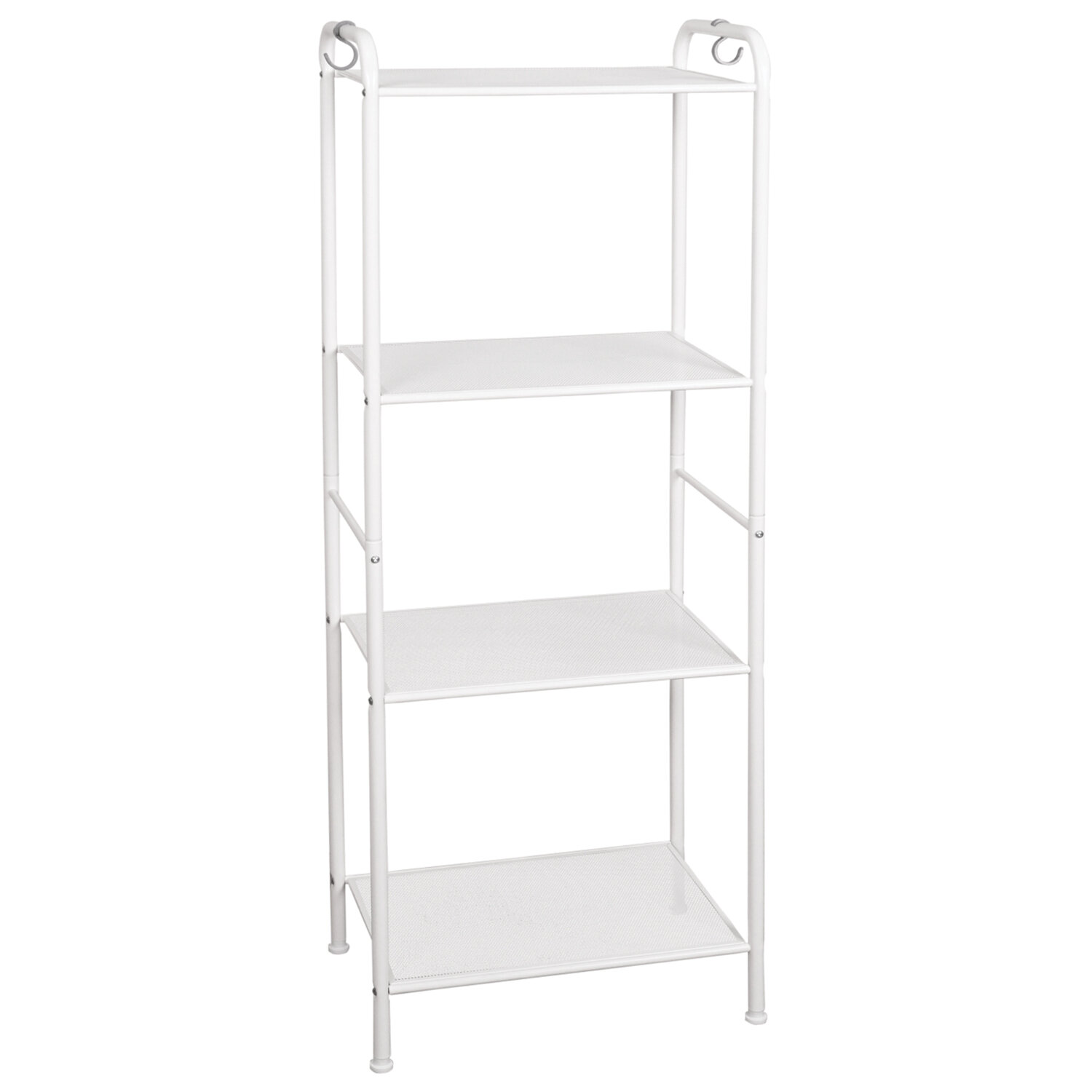 Стеллаж выполнен из прочной металлической трубы 16 мм и стального листа в мелкую сетку.Четыре прочные широкие металлические полки.Нагрузка на одну полку – до 8 кг.Два пластиковых декоративных крючка для мелочей.На ножках предусмотрены пластиковые регулируемые опоры.Изделие поставляется в разобранном виде в картонной красочной коробке с ручкой.Простая сборка согласно инструкции, шестигранный ключ для сборки в комплекте.